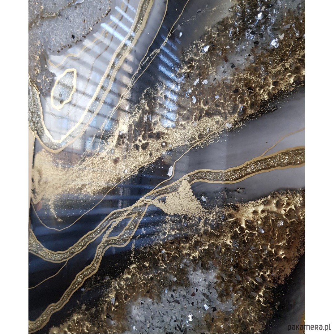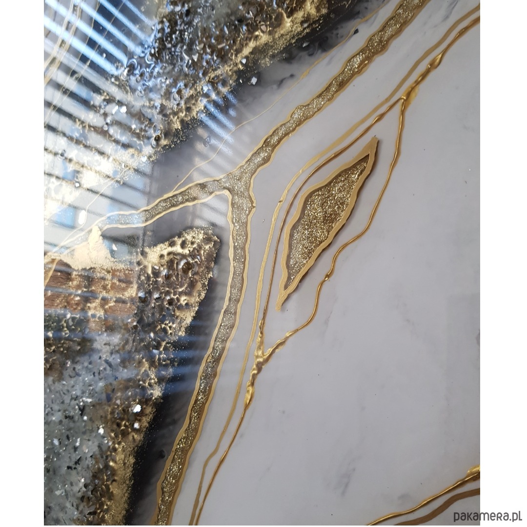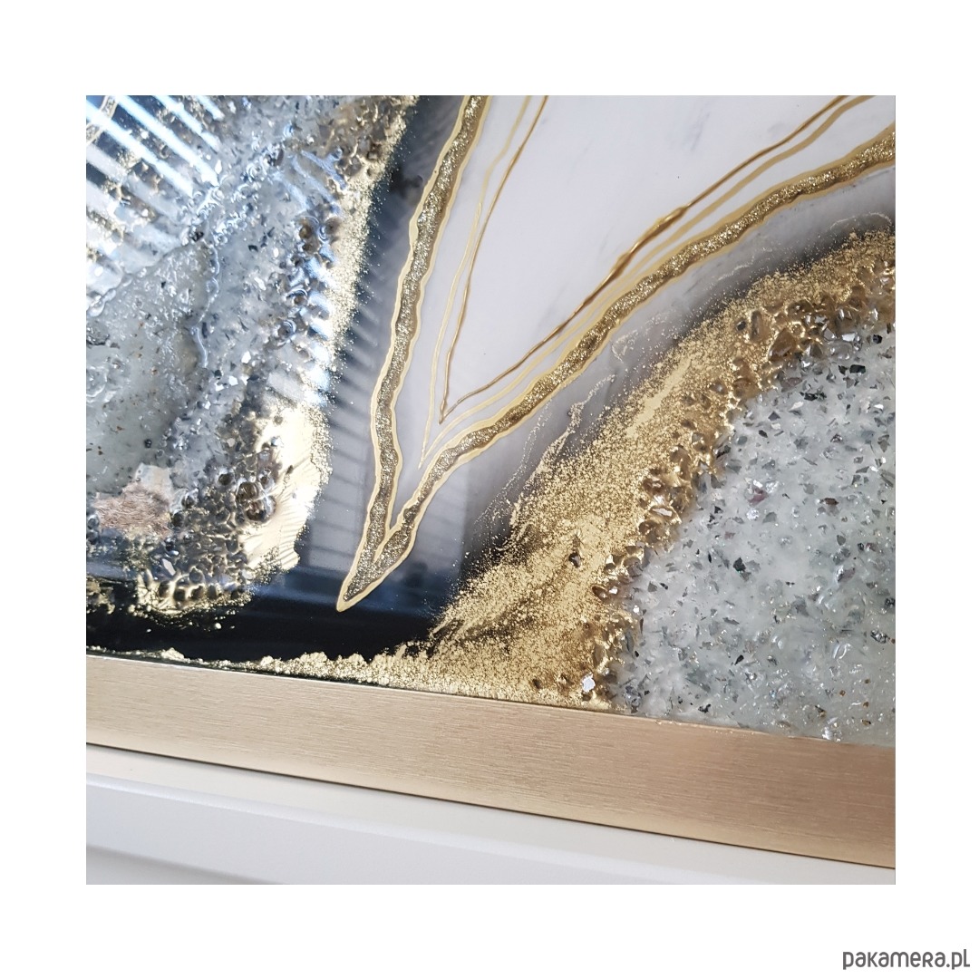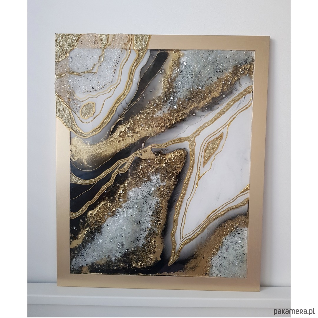 Obraz wykonany z żywicy epoksydowej z dodatkiem kamieni i kryształków. Nowoczesna sztuka geode art, polegająca na tworzeniu obrazów przypominających naturalne kamienie szlachetne