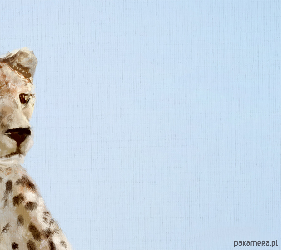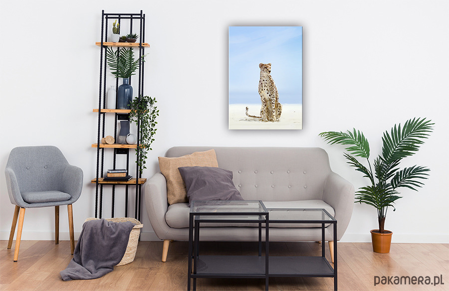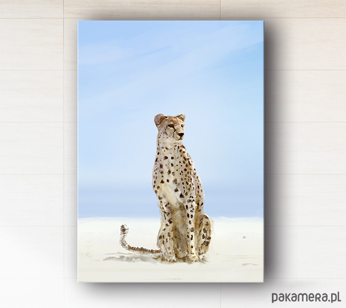 Afrykański obraz przedstawiający geparda na jasnym, niebieskim niebie.