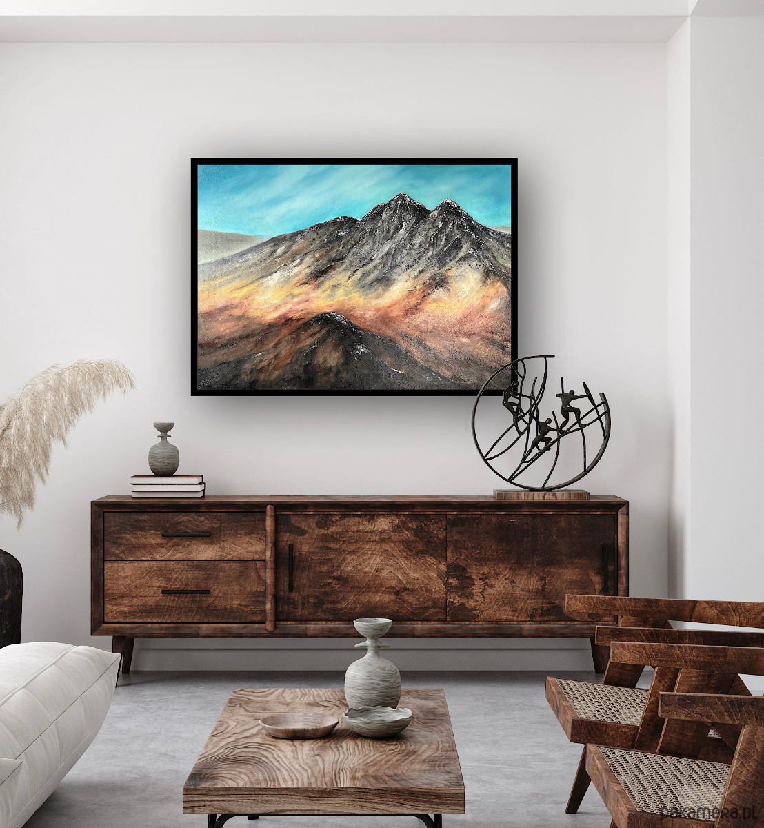 Obraz powstał jako swobodna interpretacja mojej wcześniejszej akwareli. W wersji olejnej pozwoliłam kolorom i fakturom poprowadzić się na nowo, tworząc pejzaż. Chłodne turkusy nieba kontrastują z ciepłymi, ziemistymi tonami zboczy, tworząc spokojną, ale wyrazistą kompozycję. Obraz dobrze odnajduje się w nowoczesnych, stonowanych wnętrzach, gdzie staje się subtelnym akcentem i punktem skupienia.