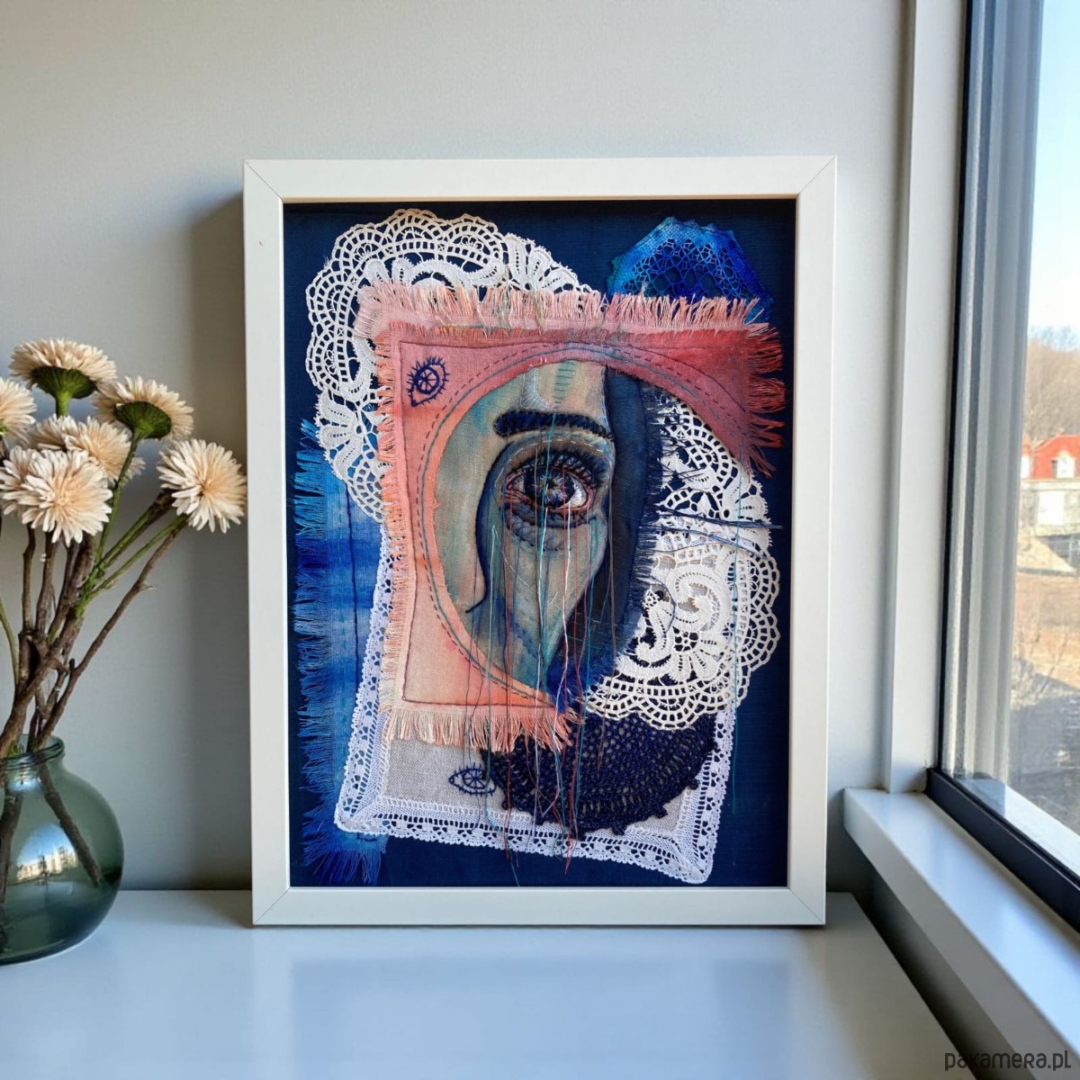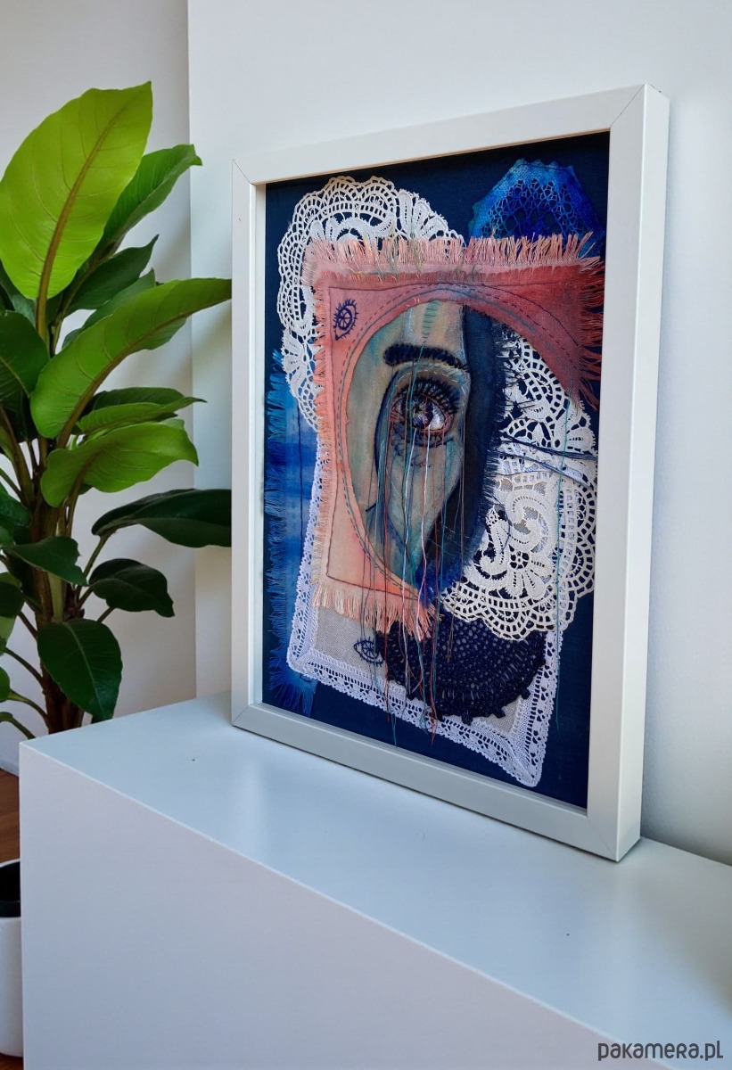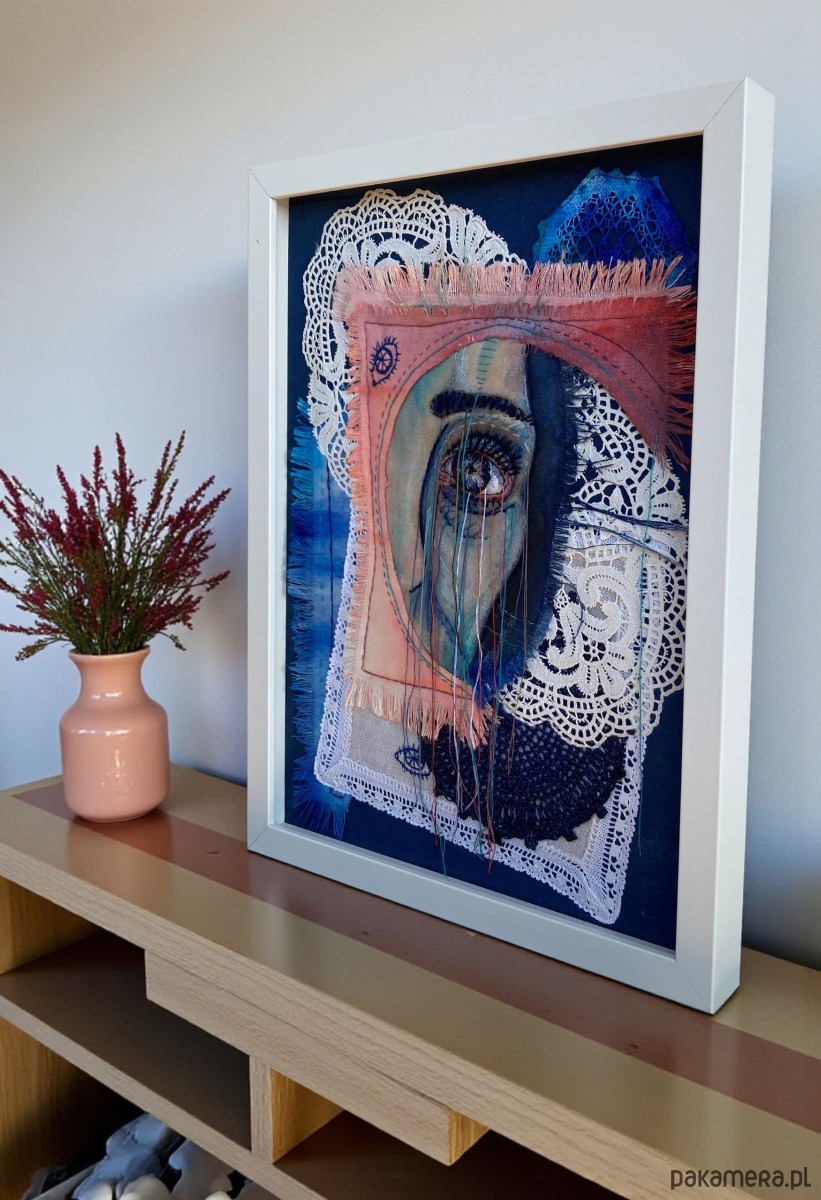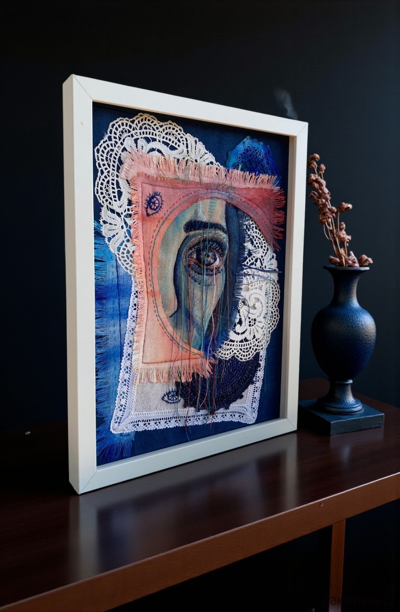 Obraz z kilku tkanin, malowany farbami, oko 3D ręcznie haftowane bawełnianymi nićmi.