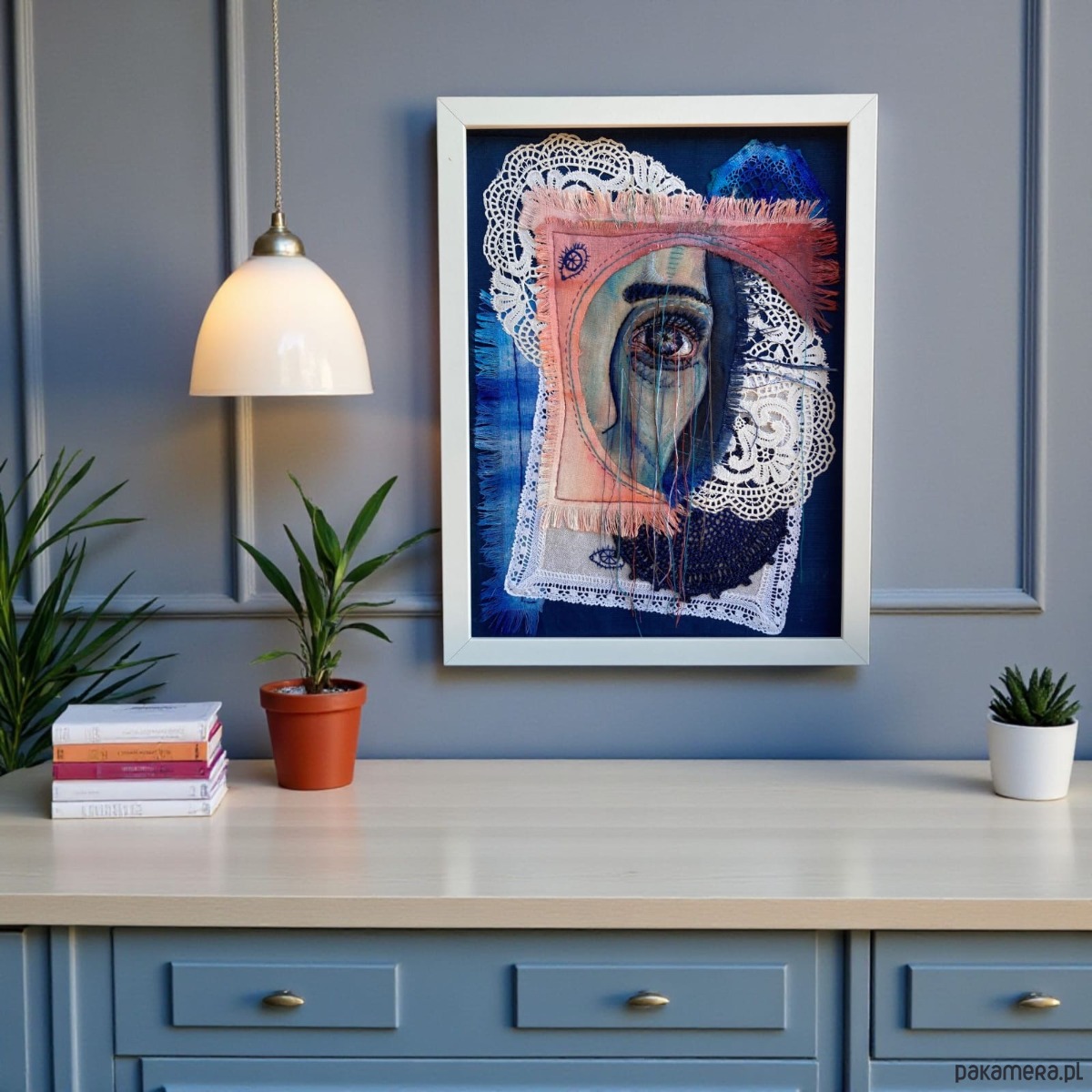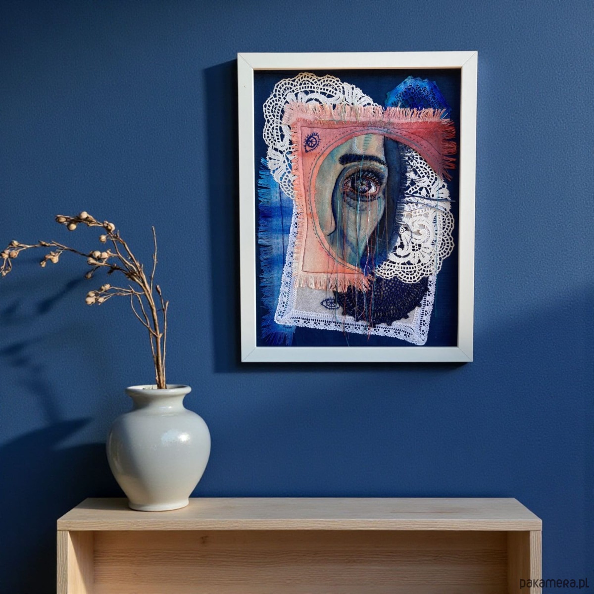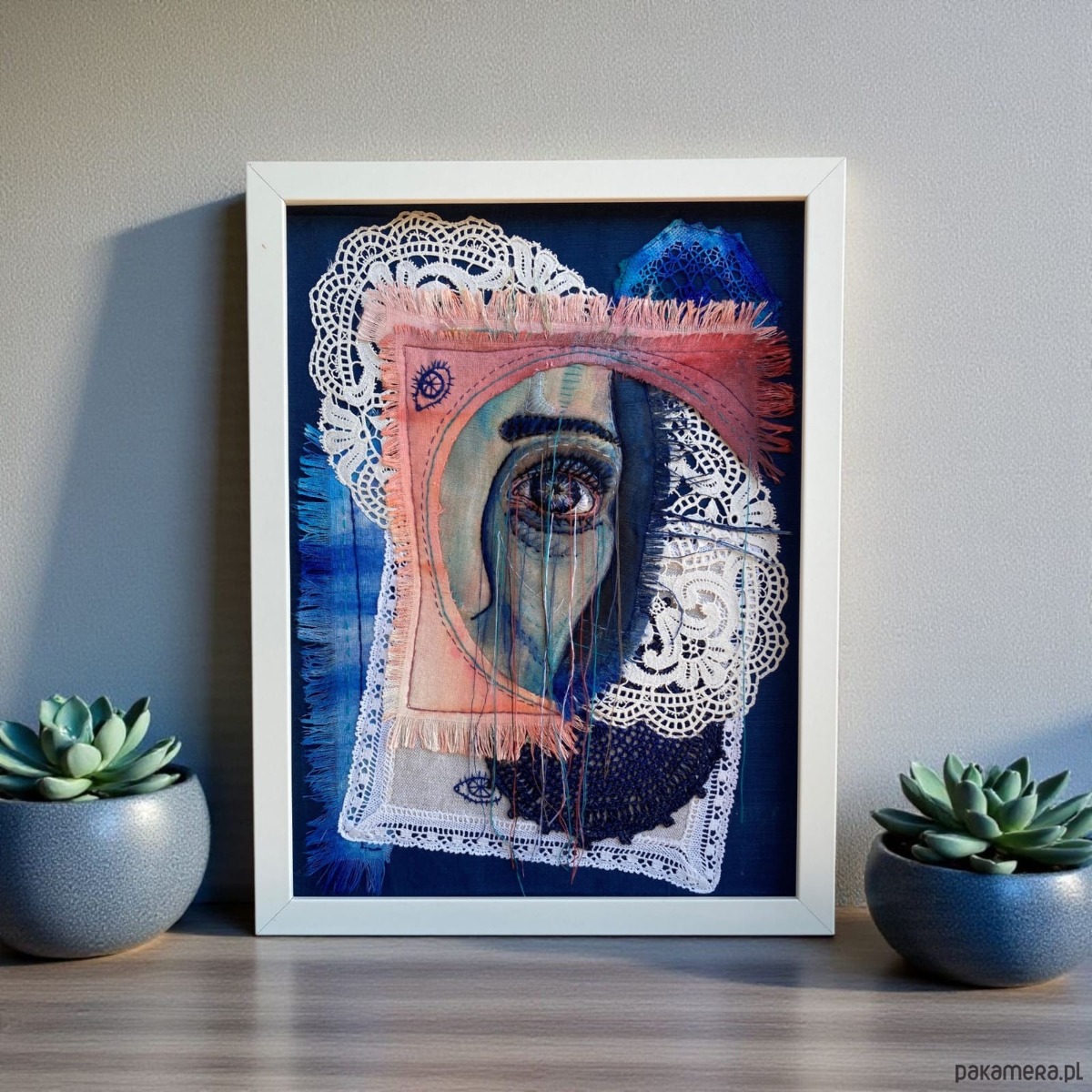 Obraz z kilku tkanin, malowany farbami, oko 3D ręcznie haftowane bawełnianymi nićmi.