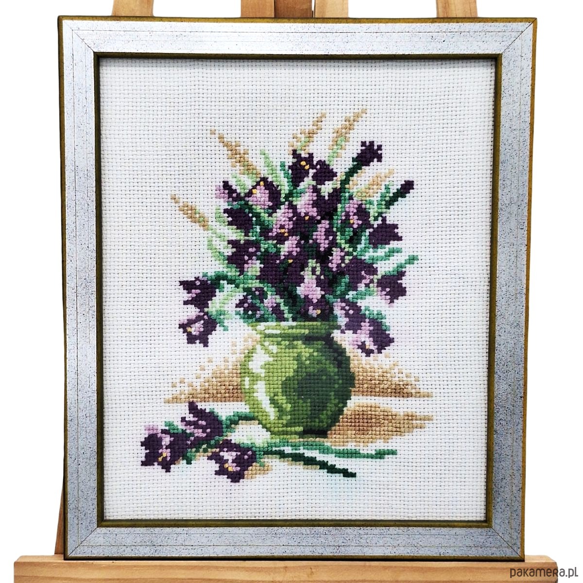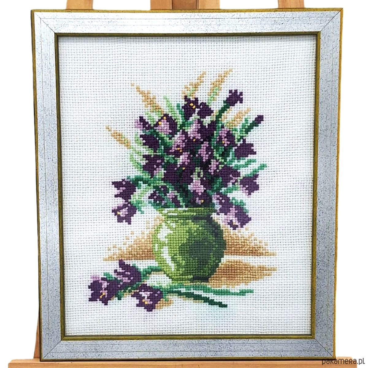 Unikalna dekoracja ścienna wykonana metodą haftu krzyżykowego, przedstawiająca bukiet fioletowych kwiatów w zielonym wazonie. Rękodzieło cechuje się wysoką precyzją i estetyką wykonania – doskonale sprawdzi się jako ozdoba wnętrza, prezent lub element kolekcji.