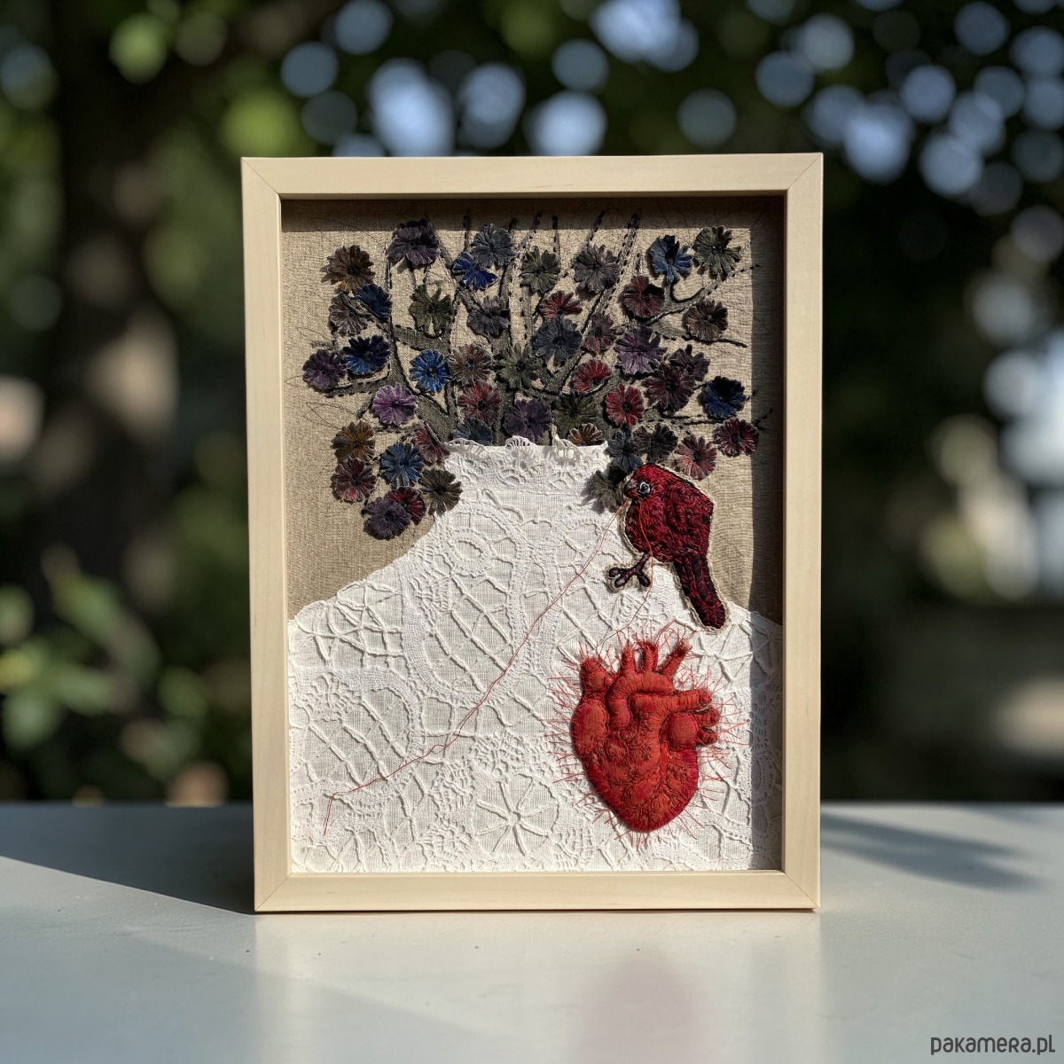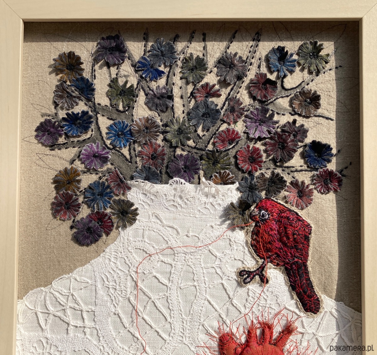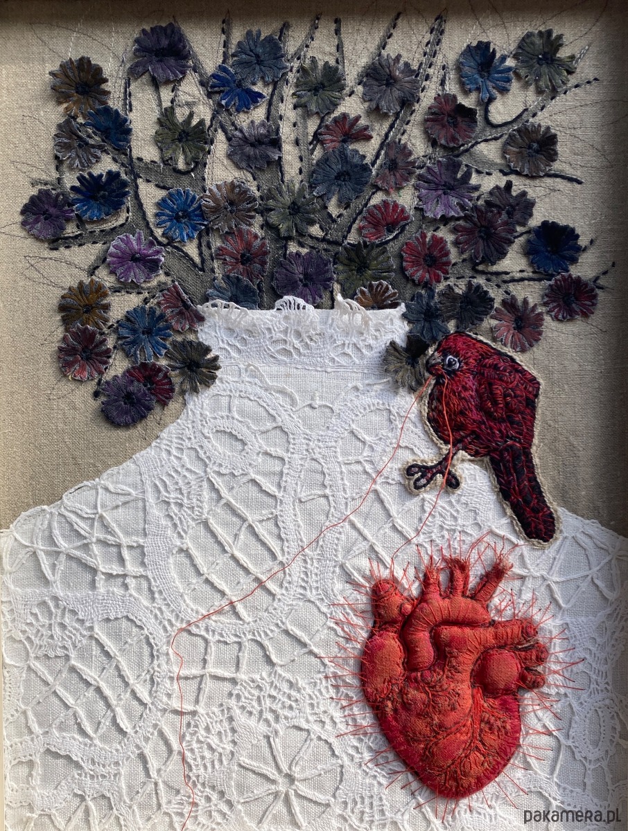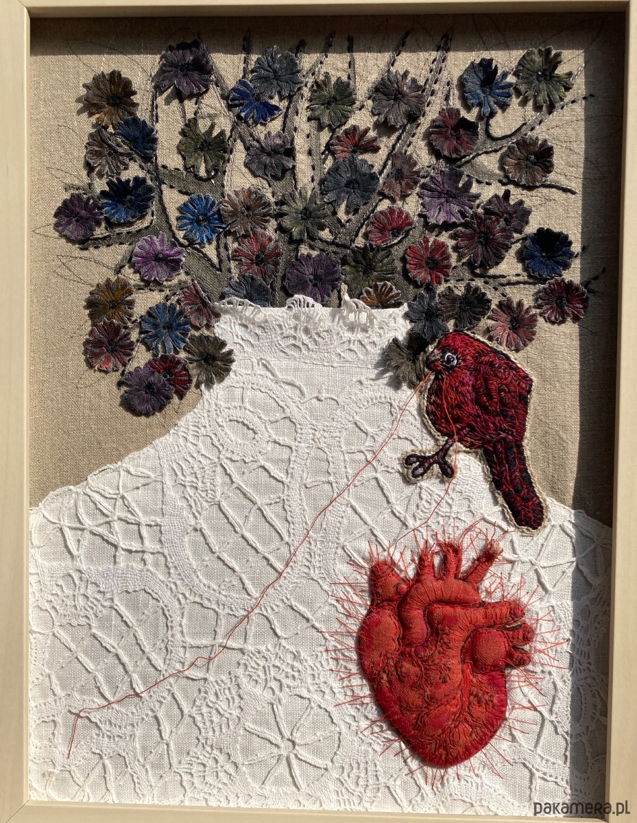 Obraz uszyłam z tkanin lnianych, pomalowałam farbami, ptaszek, serce anatomiczne 3D ręcznie haftowane bawełnianymi nićmi. Ptaszek cienką niteczką doszył serduszko w miejsce bezdusznej pustki.