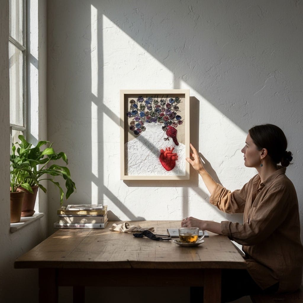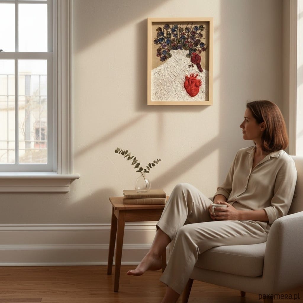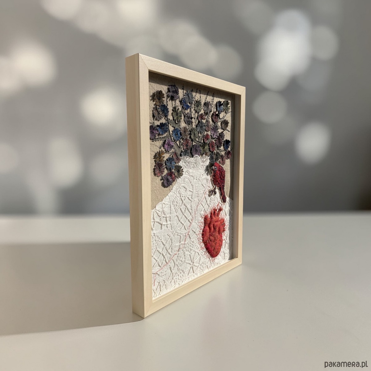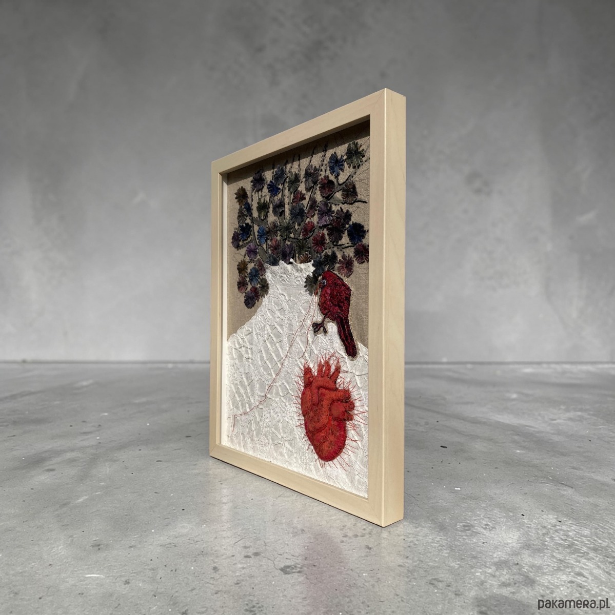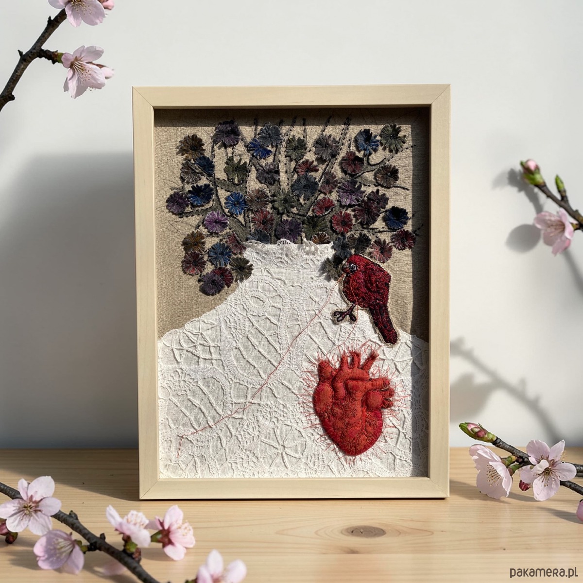 Obraz uszyłam z tkanin lnianych, pomalowałam farbami, ptaszek, serce anatomiczne 3D ręcznie haftowane bawełnianymi nićmi. Ptaszek cienką niteczką doszył serduszko w miejsce bezdusznej pustki.