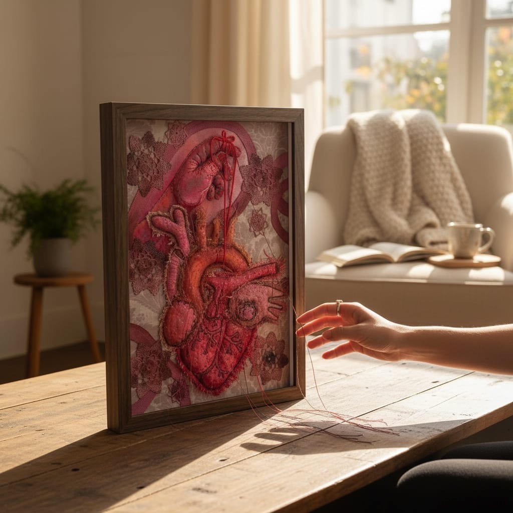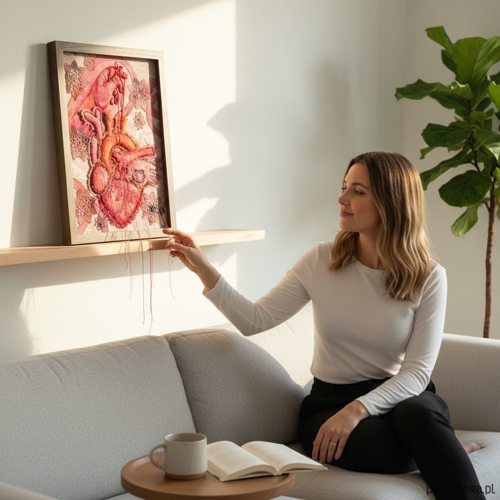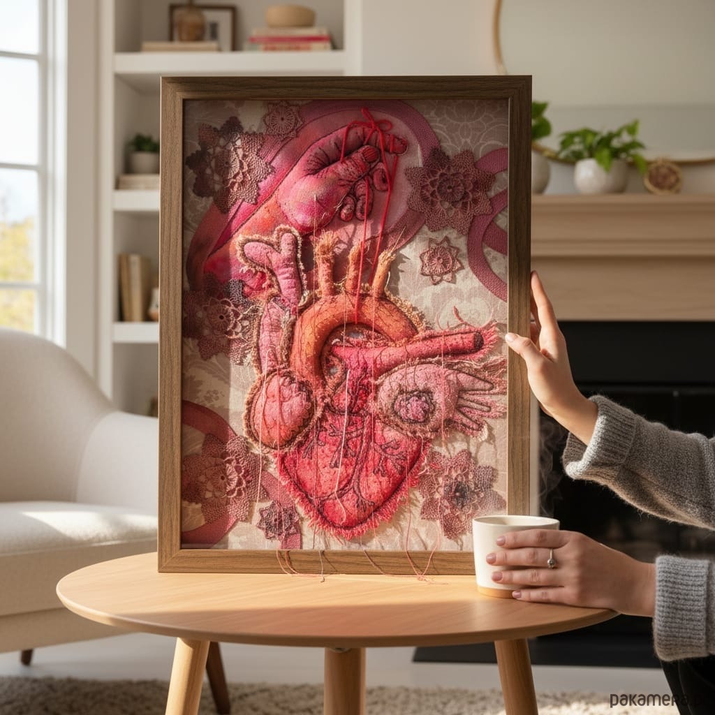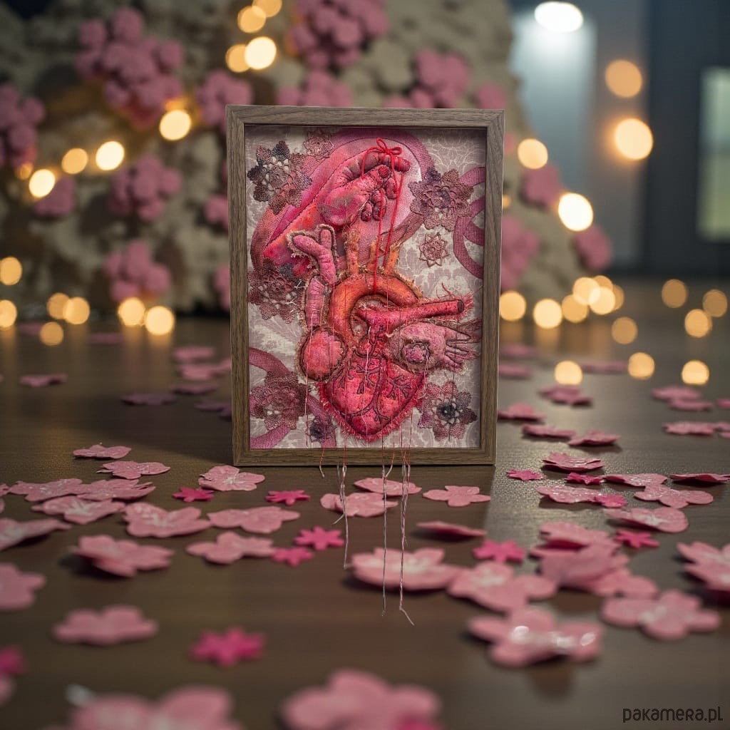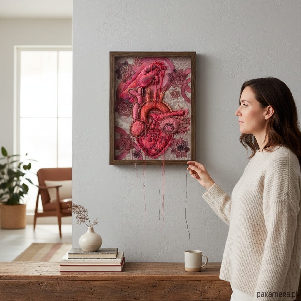 Obraz haftowany serce anatomiczne i dłoń 3 D.