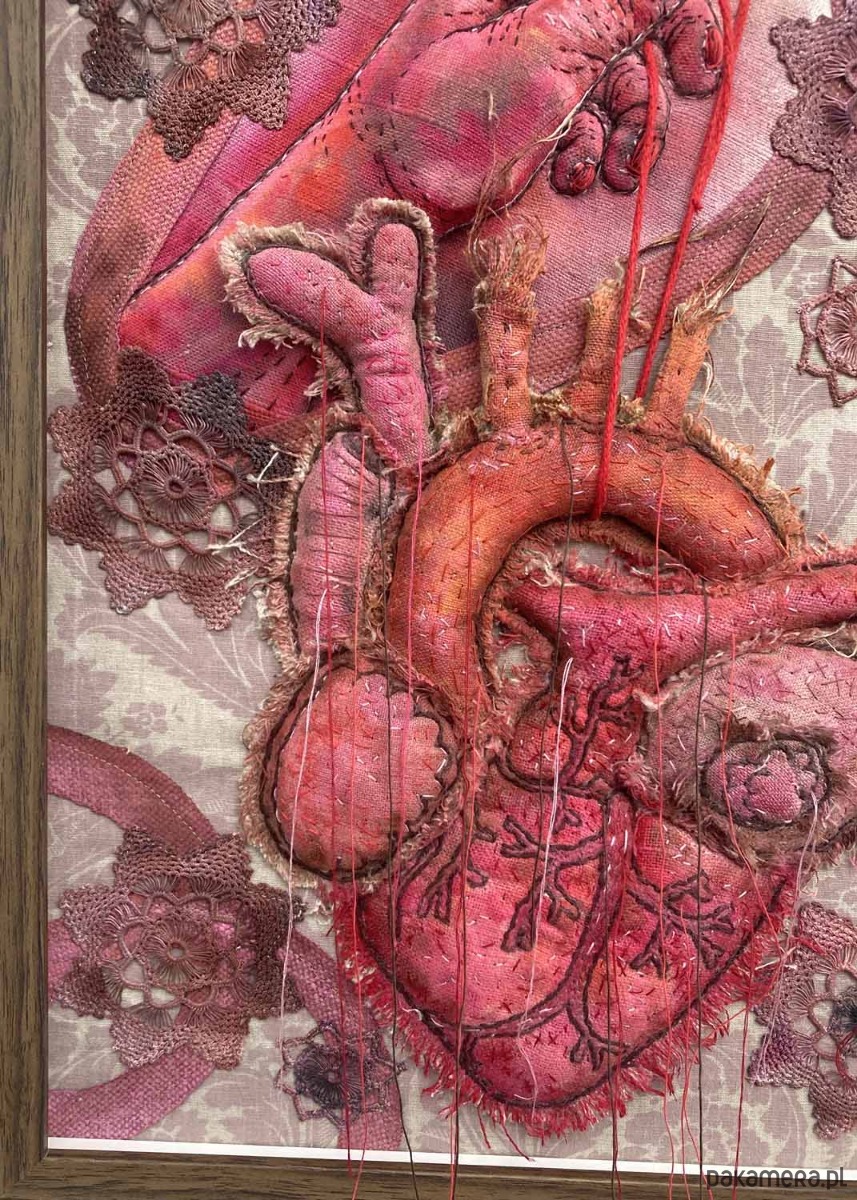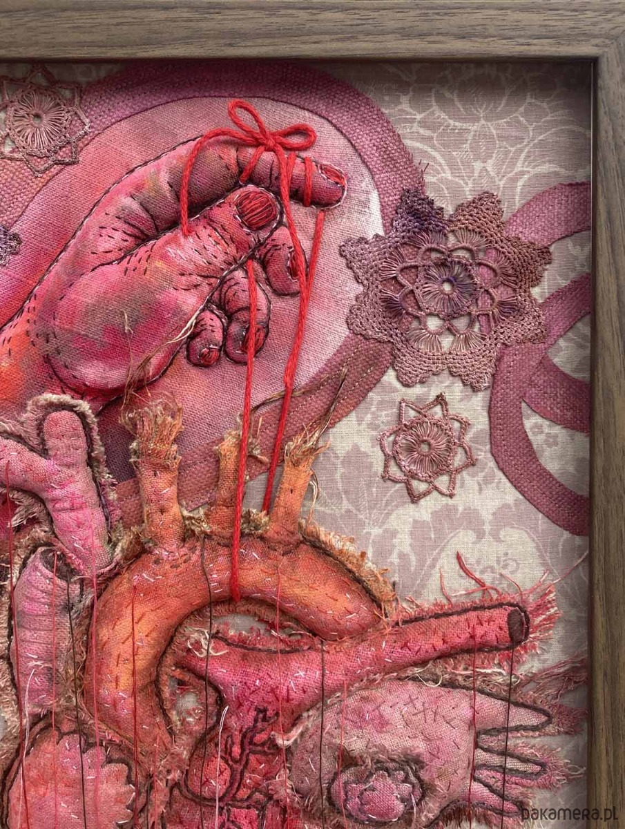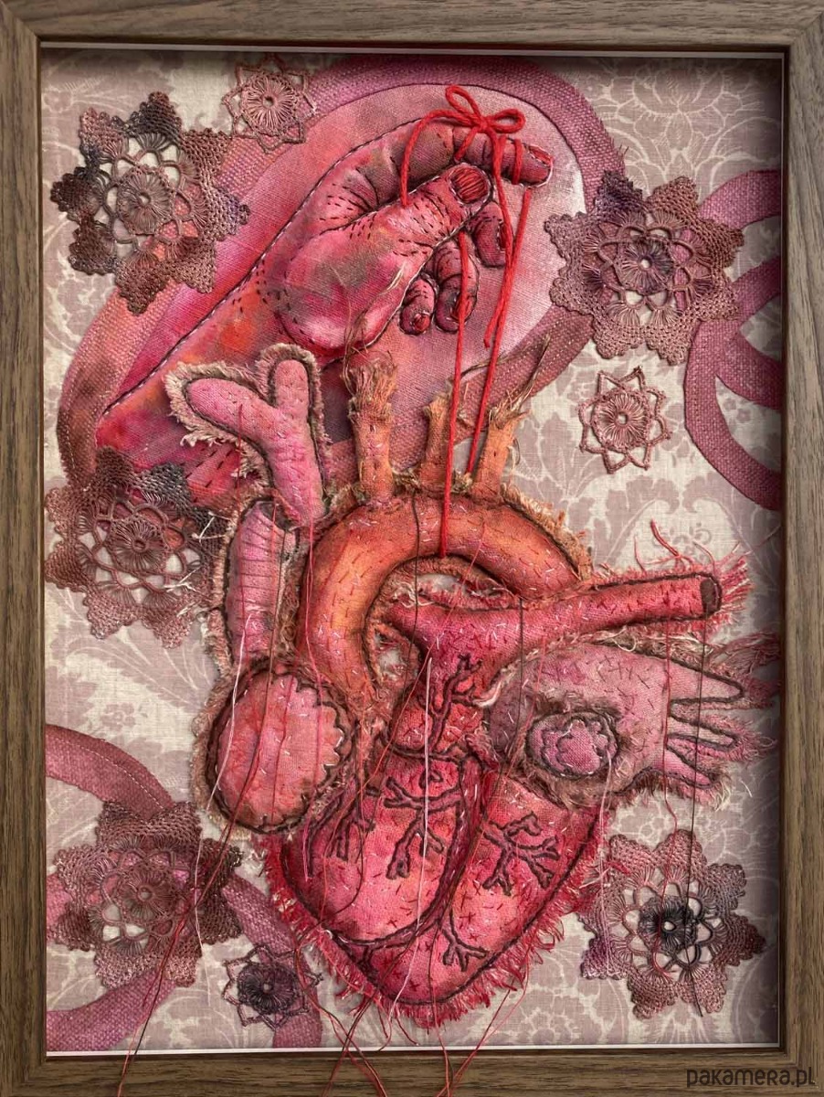 Obraz uszyłam z tkanin lnianych, pomalowałam i wyhaftowałam. Serce i dłoń 3D w odcieniach kolorów czerwieni, i brązu, połatane niteczkami, a zwisające nitki pięknie kołyszą się na wietrze.