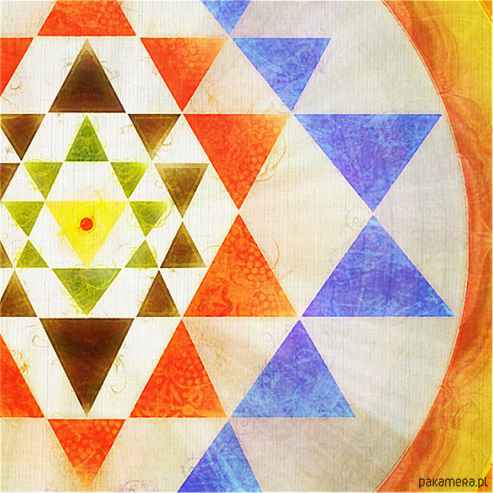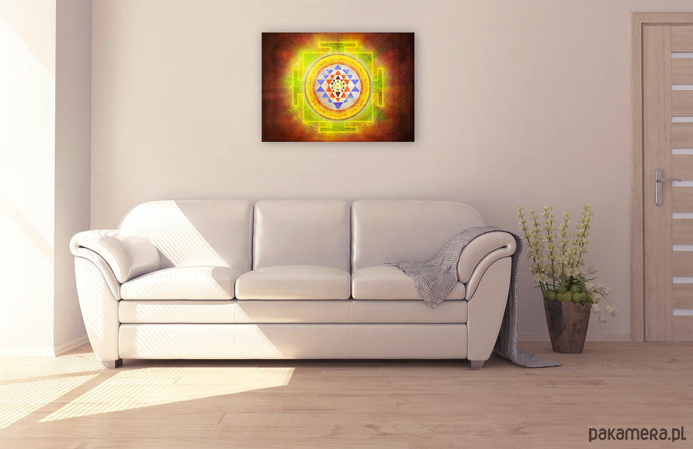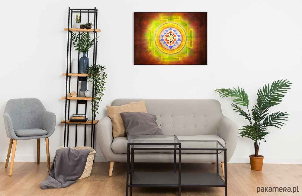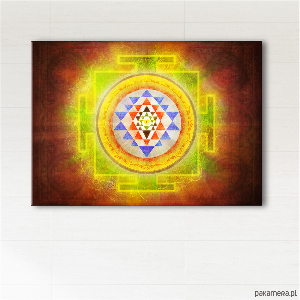 Shri yantra - dziewięć trójkątów wewnątrz obrazu symbolizuje wszechświat oraz ciało człowieka. Przypomina, że wszystko jest ze sobą połączone w jedności. Obraz harmonizuje również pierwiastek męski i żeński.