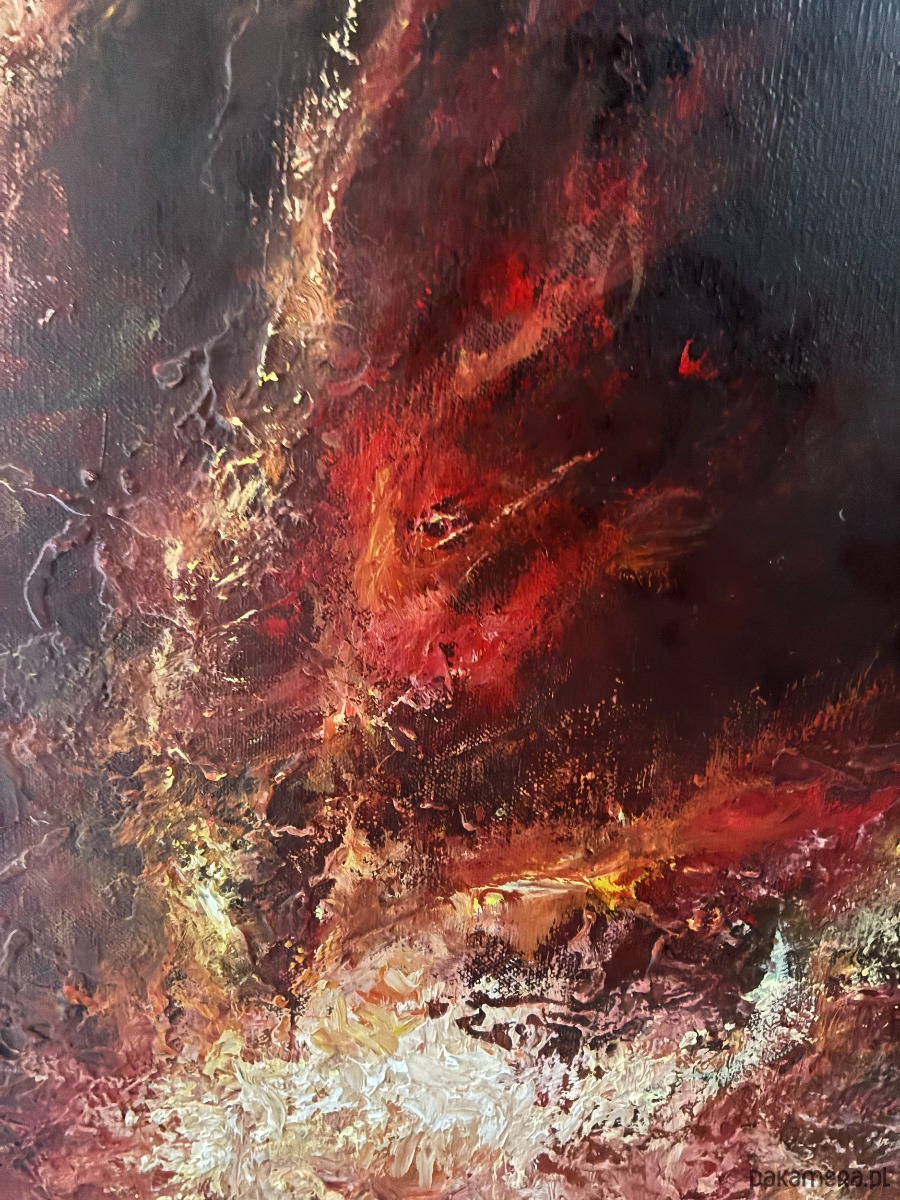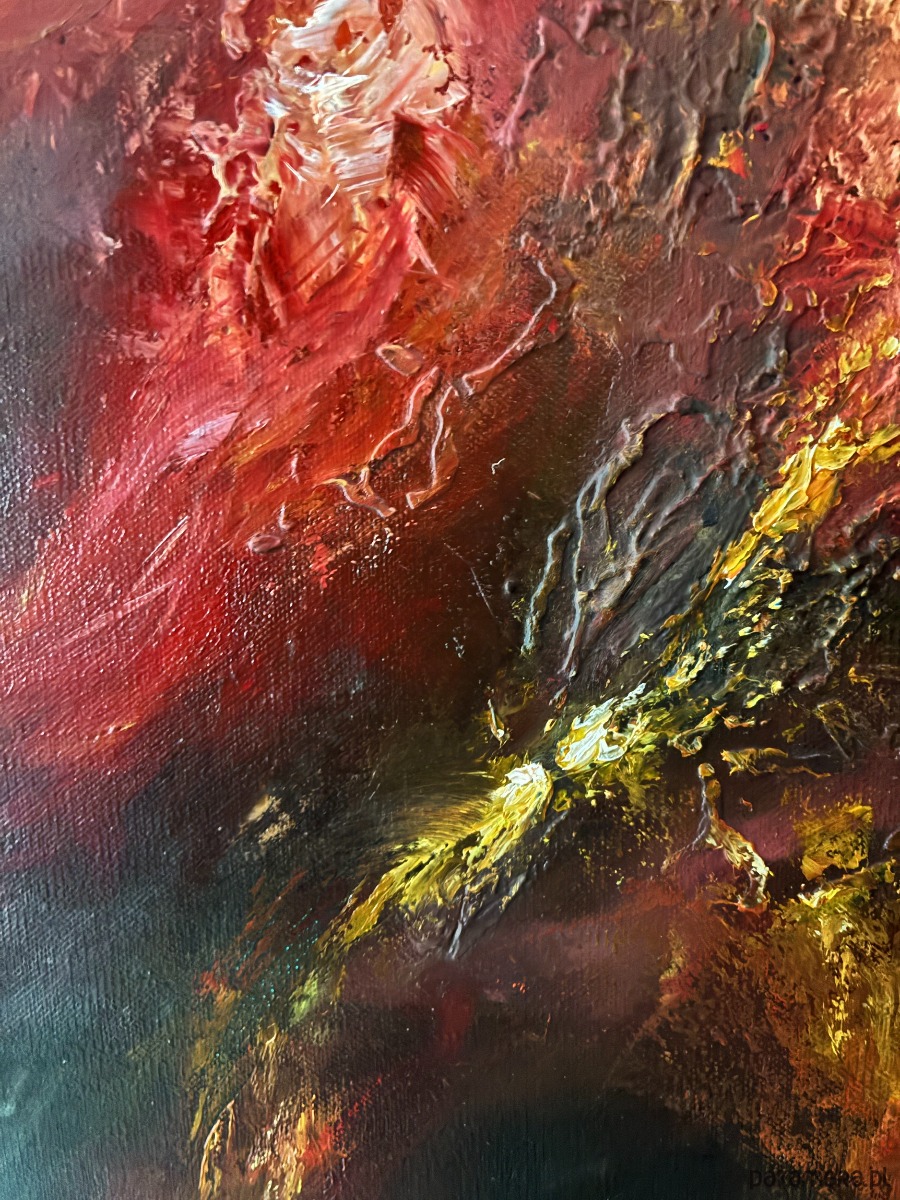 "Impuls” to abstrakcyjny obraz o spotkaniu światła i mroku — mieszanki rozżarzonych akcentów, głębokiej struktury i subtelnego ruchu. Kompozycja pulsuje dynamiką, jak nieustanny przepływ energii, który nie zatrzymuje się ani na chwilę. Intensywność barw i faktur tworzy wrażenie organicznego, żywego rytmu, a całość przyciąga wzrok i wprowadza do wnętrza odrobinę tajemnicy oraz siły.