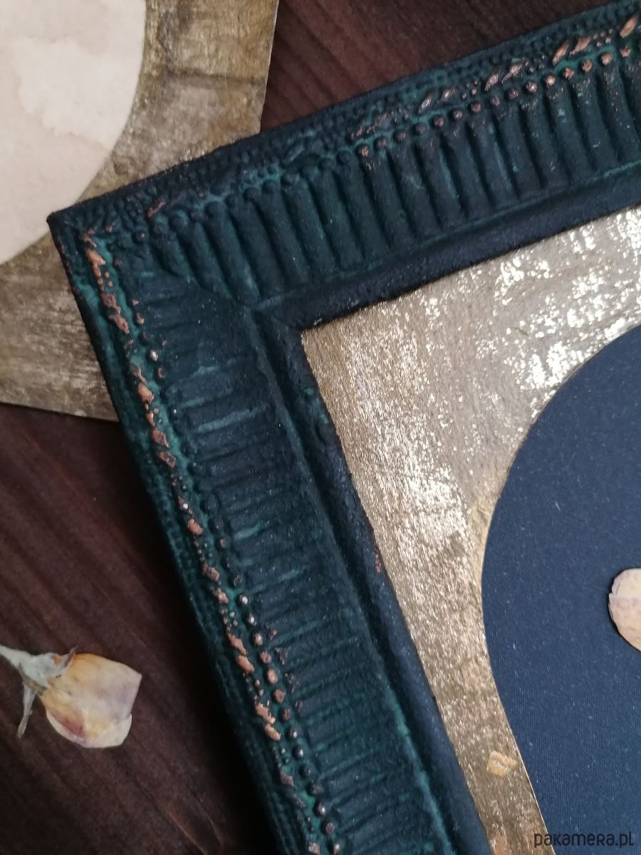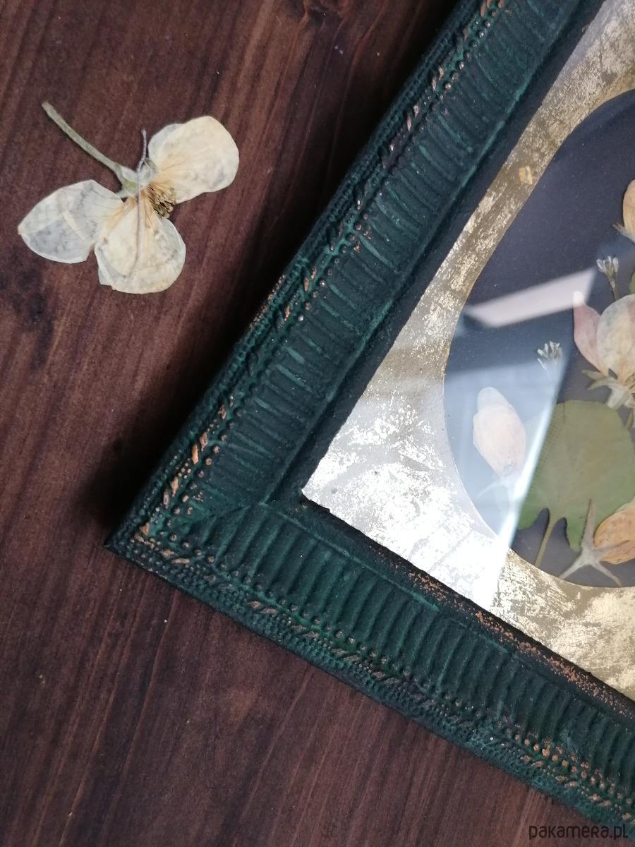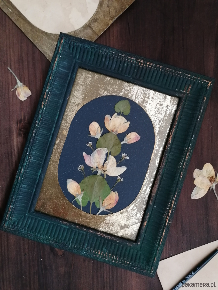 Autorska kompozycja z prawdziwych kwiatów jabłoni na tle ciemnogranatowego fakturowanego papieru, obramowana ręcznie złoconym pałatkami złota passe-partout, umieszczona za szkłem. Rama postarzana w kolorze butelkowej zieleni, z drobnymi miedzianymi akcentami. Wszystkie elementy wykonane ręcznie z dbałością o każdy detal. Całość utrzymana w stylu Artdeco.