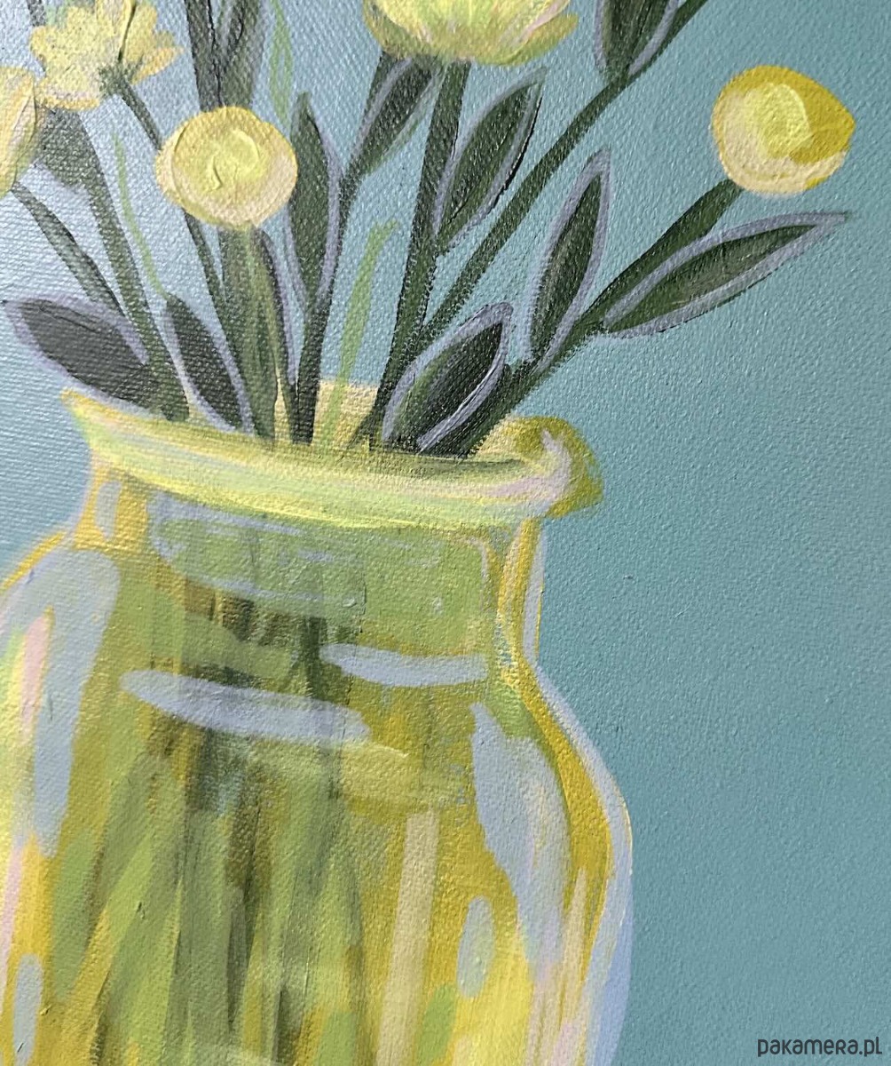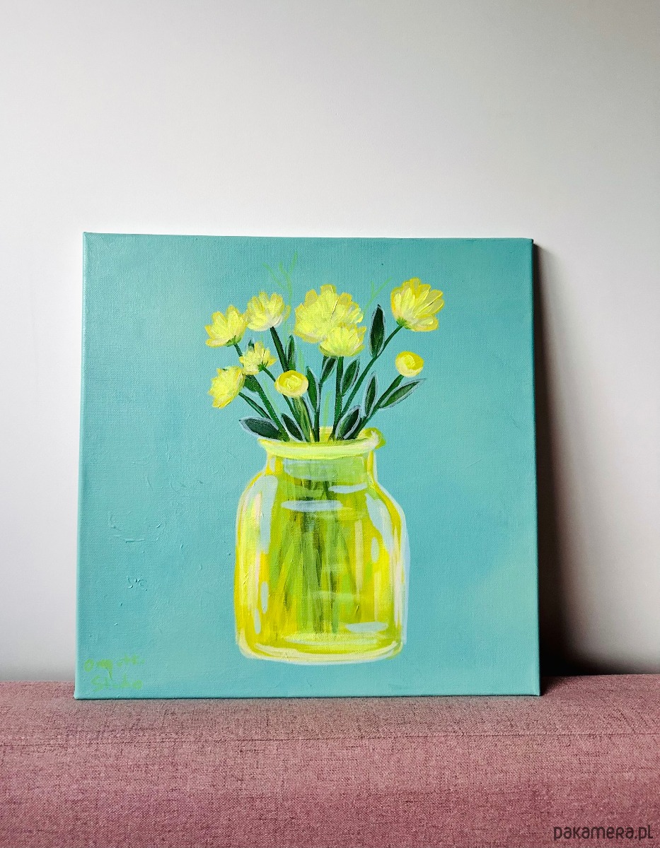 Prezentuję Państwu urokliwy, ręcznie malowany obraz akrylowy na płótnie, który wniesie do każdego wnętrza energię i optymizm. "Kwiaty w Szklanym Wazonie" to kompozycja utrzymana w stylu nowoczesnej, radosnej estetyki.