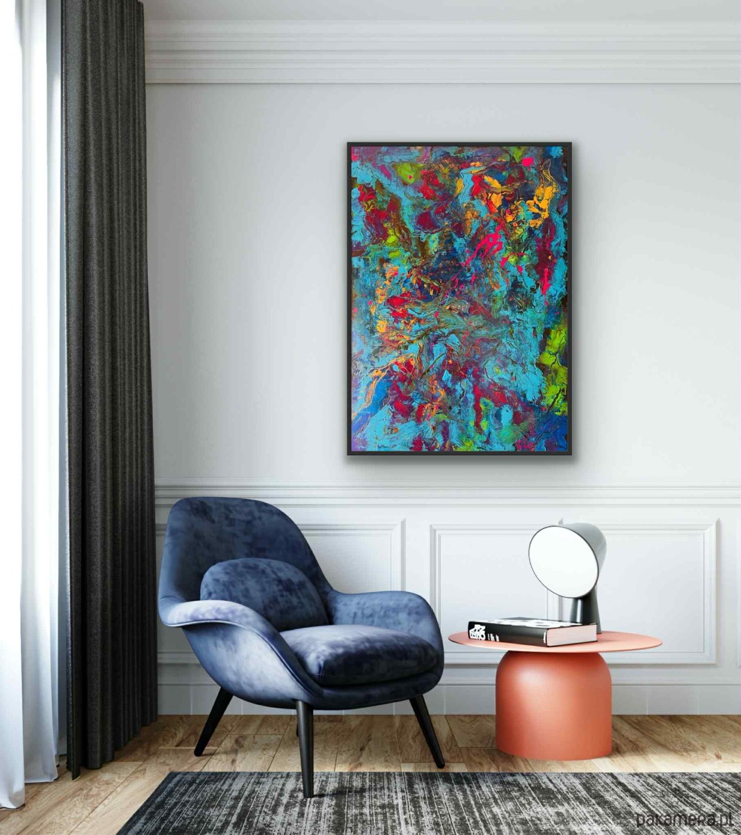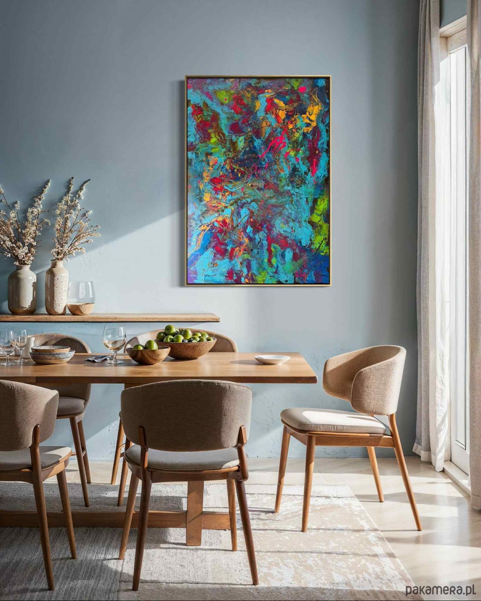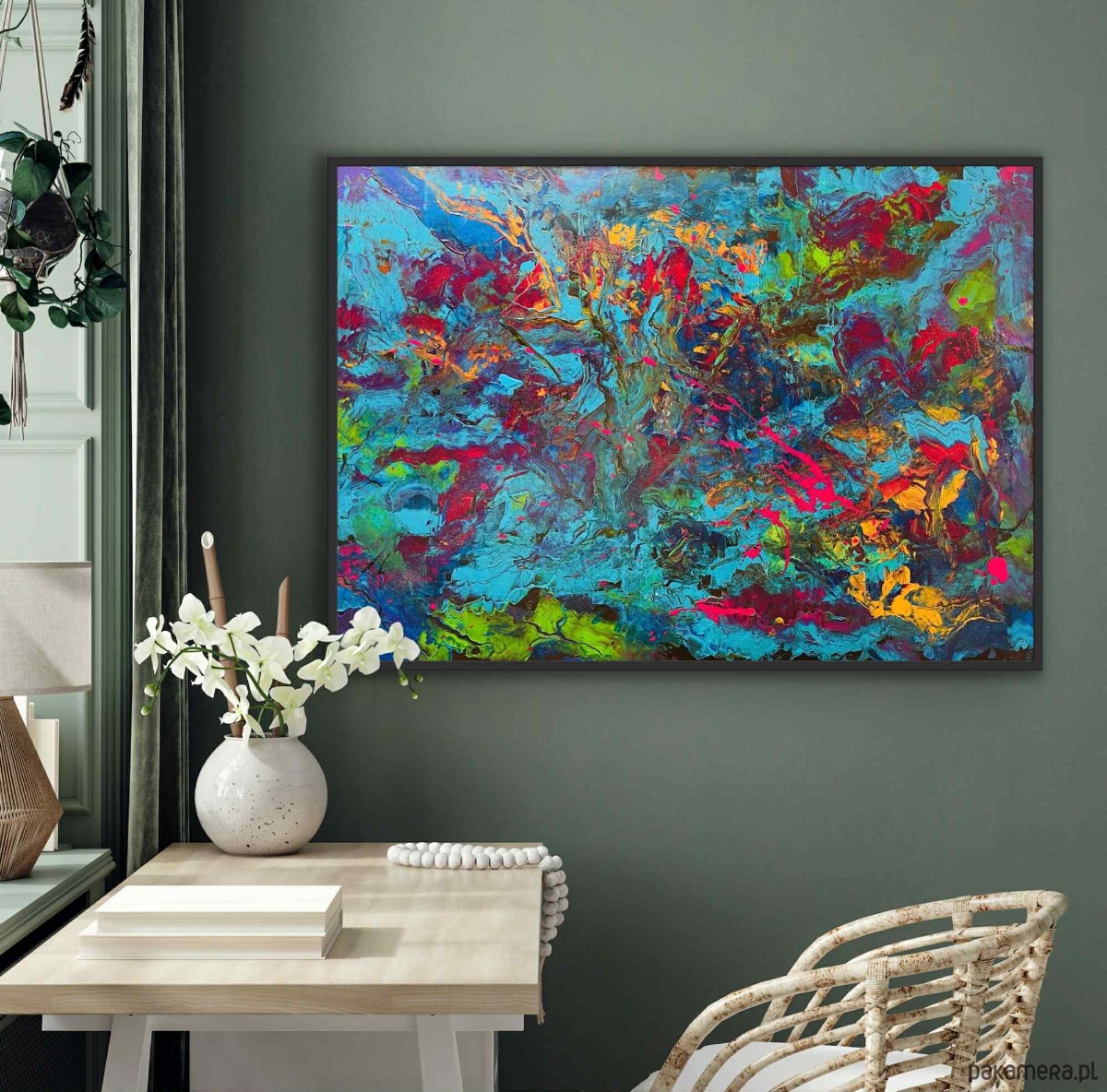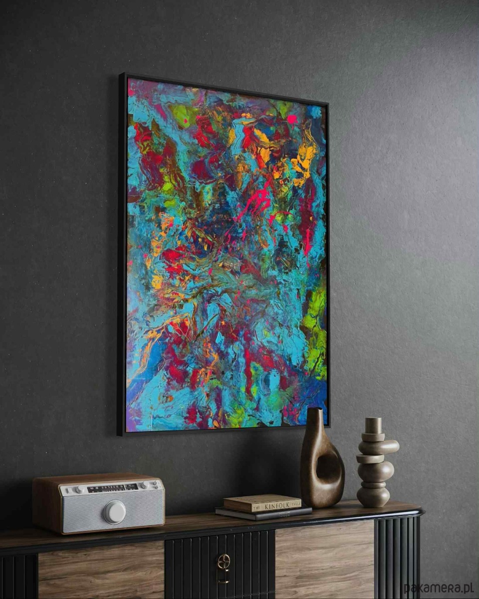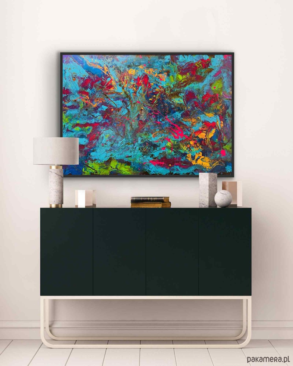 Obraz pięknie prezentuje się w czarnej ramie i potrzebuje światła, aby wydobyć wszystkie kolorystyczne walory.