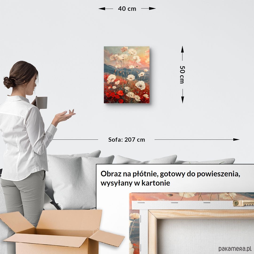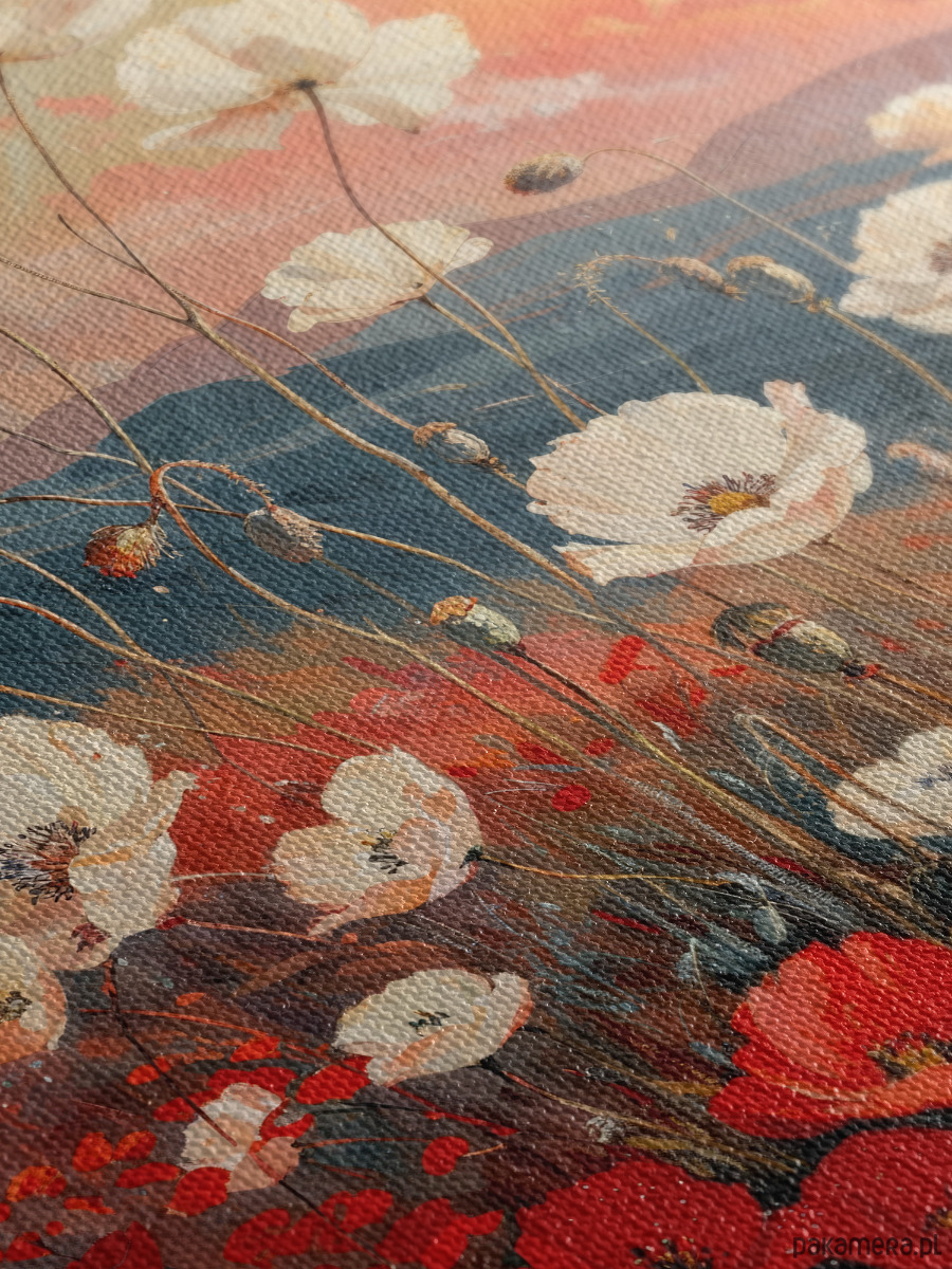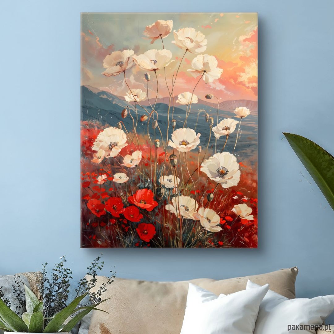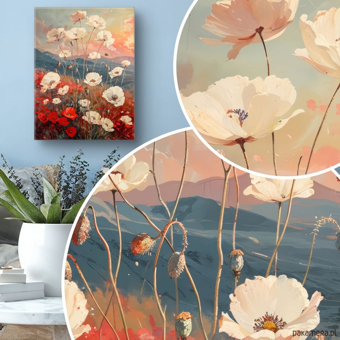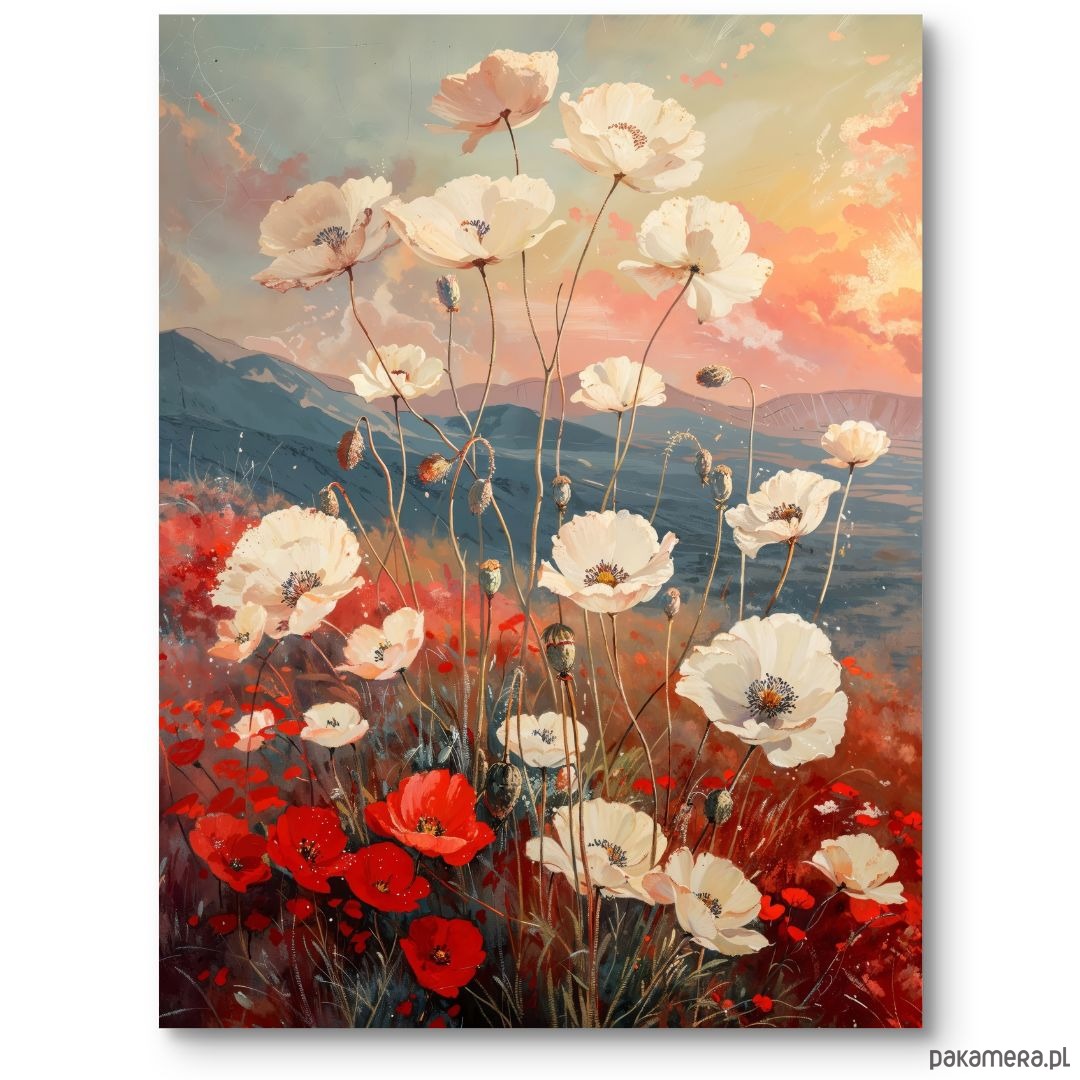 Obraz ten przedstawia maki na tle malowniczych gór, łącząc delikatność kwiatów z majestatem natury. Maki są szczegółowo malowane, a góry tworzą spokojne tło, co daje poczucie harmonii i spokoju.
