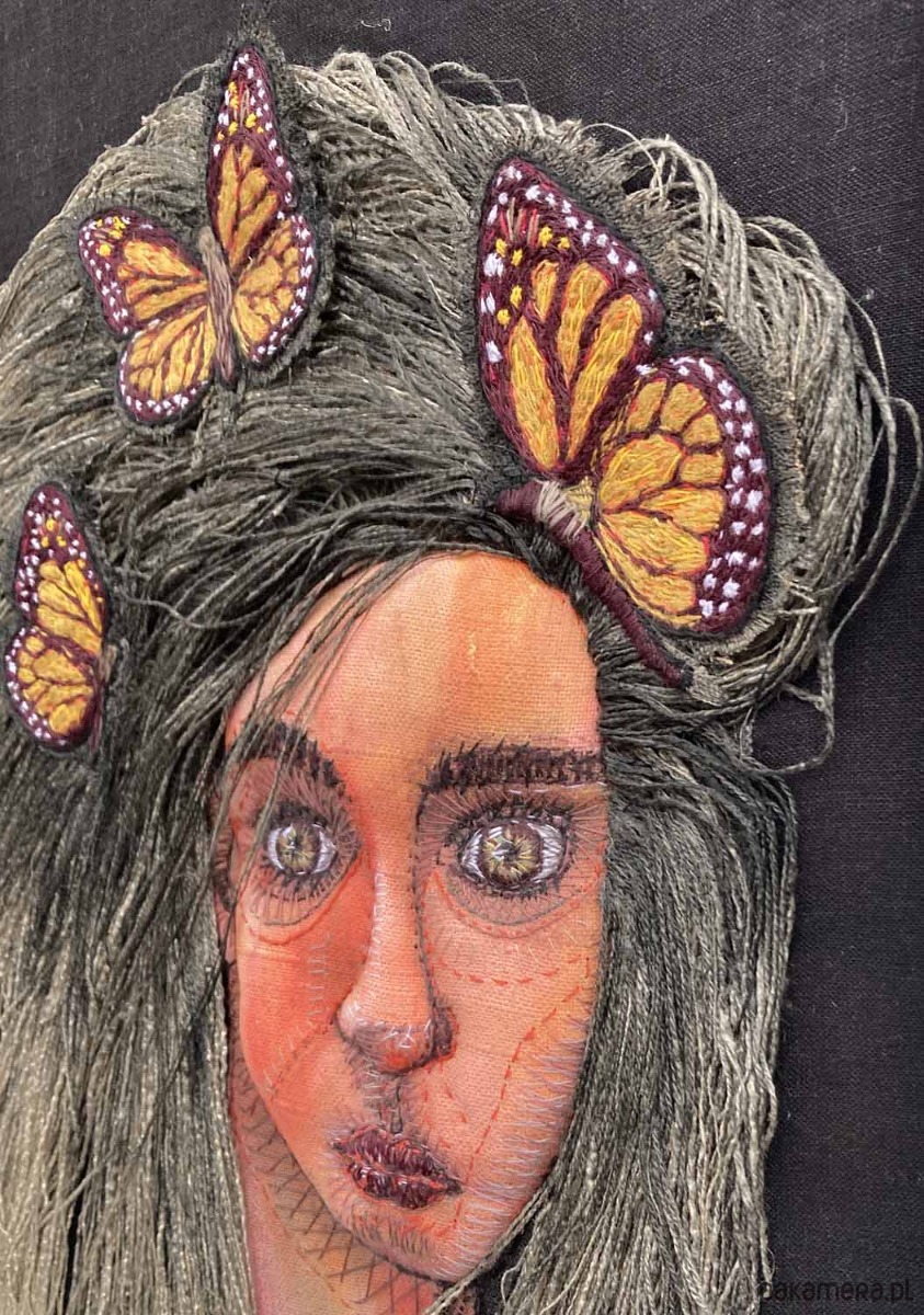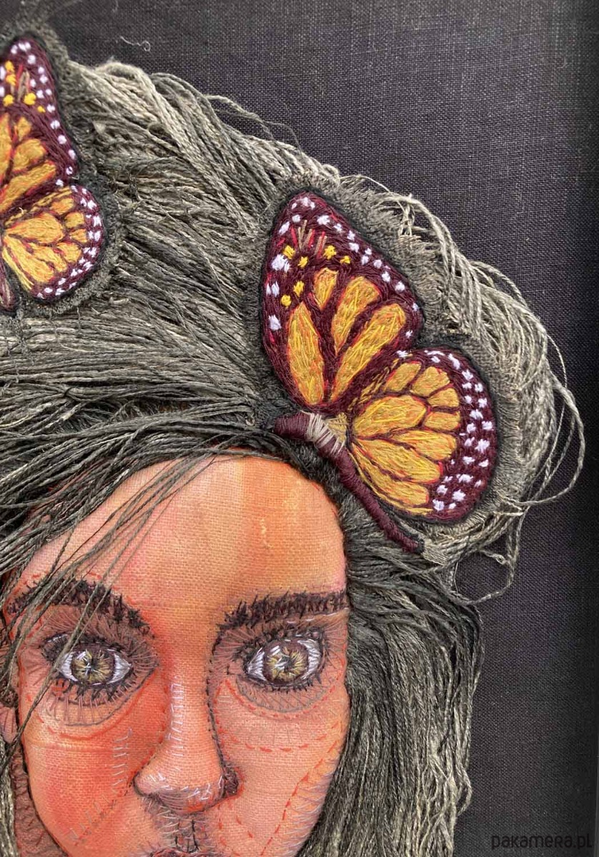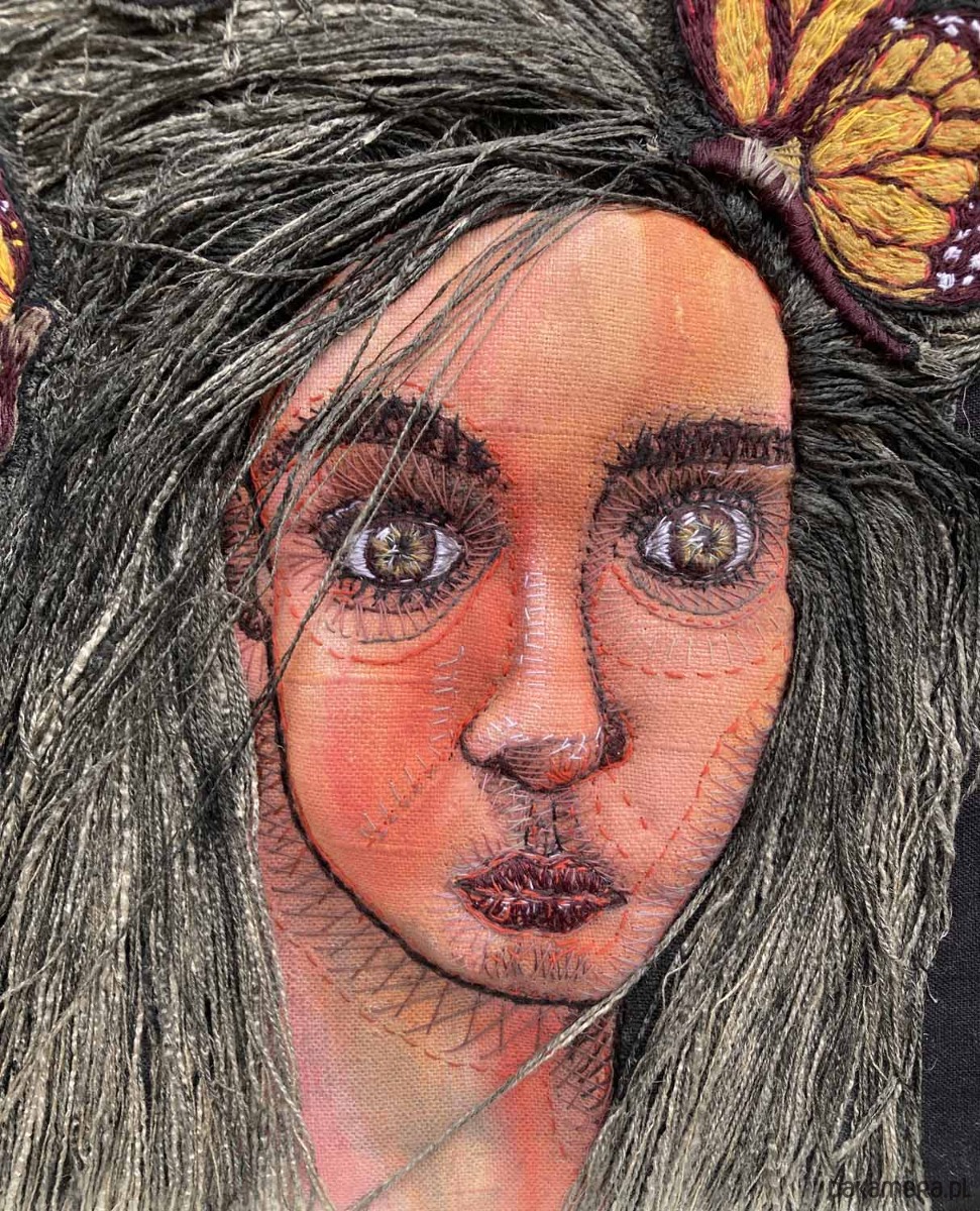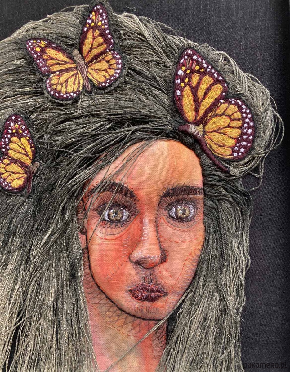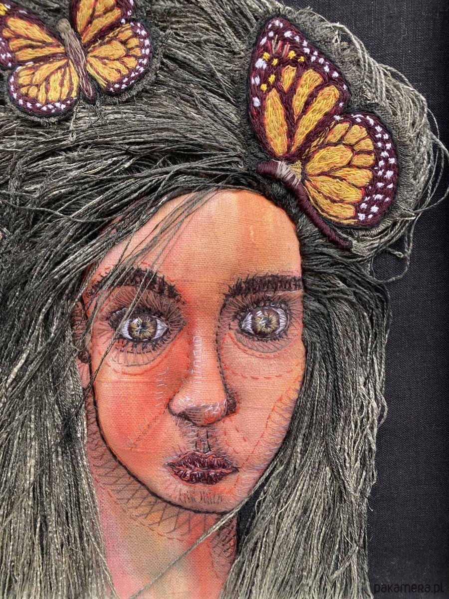 Twarz kobiety 3D namalowana na lnianej tkaninie, ręcznie haftowana bawełnianymi nićmi. Ręcznie haftowane motyle wkomponowane w czuprynę lnianych włosów.