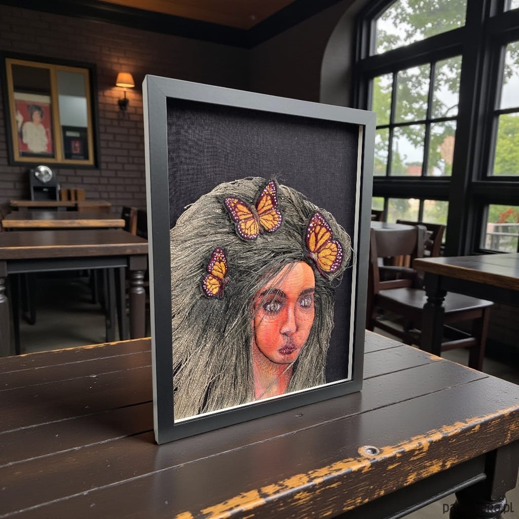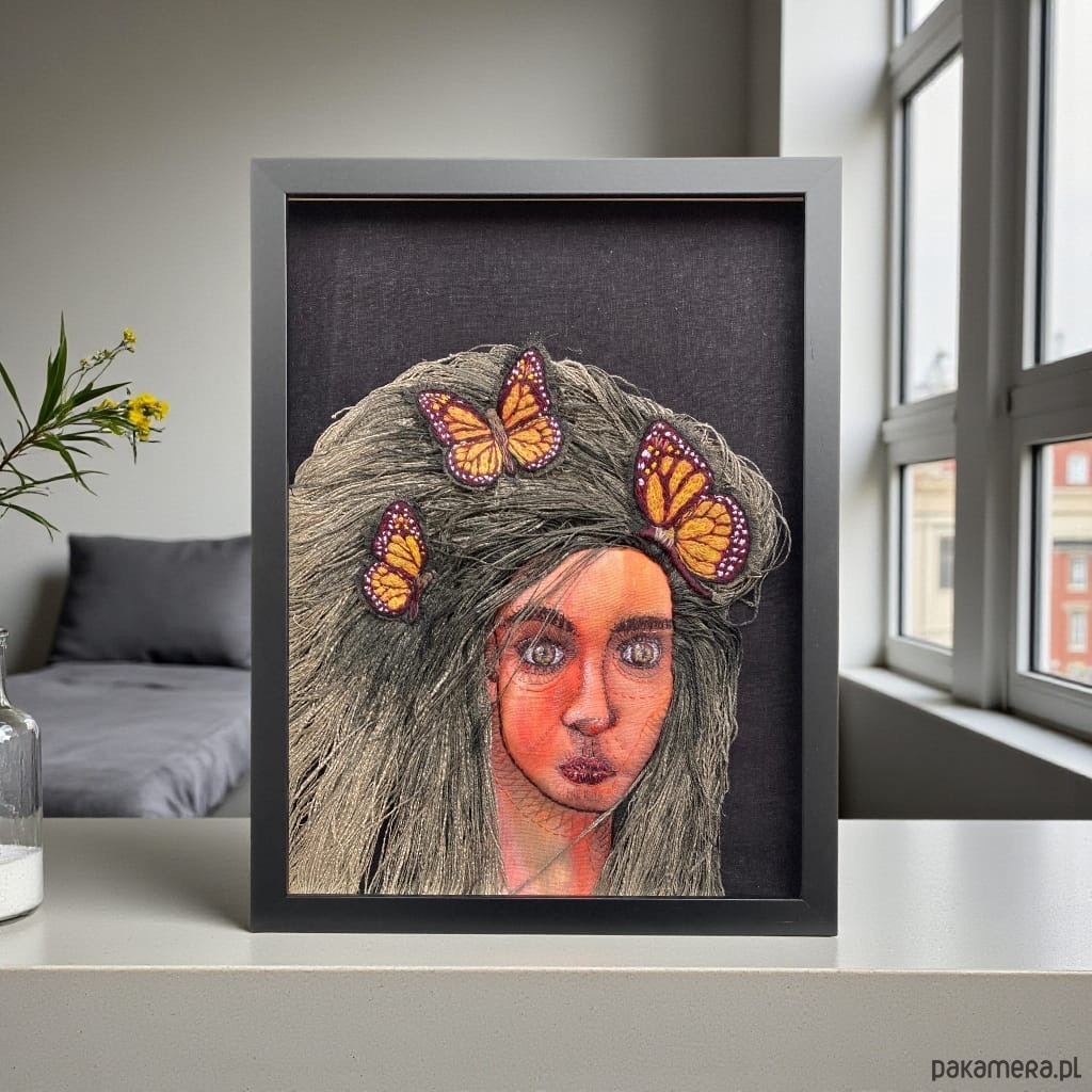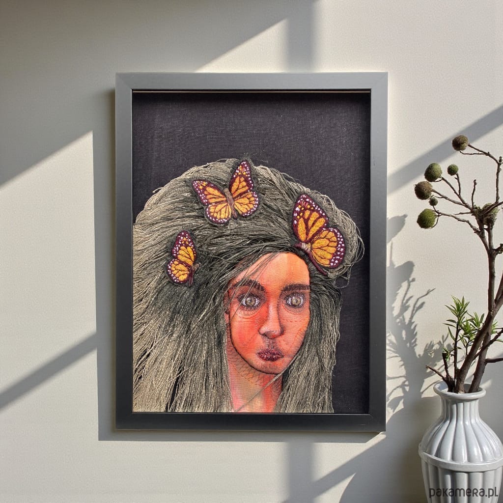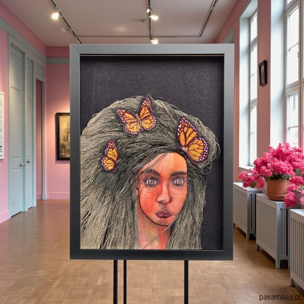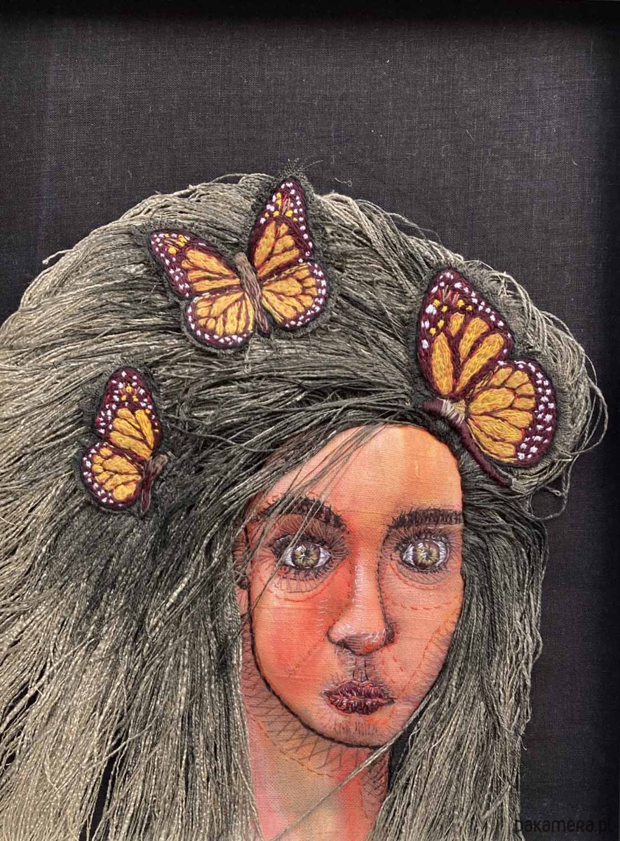 Twarz kobiety 3D namalowana na lnianej tkaninie, ręcznie haftowana bawełnianymi nićmi. Ręcznie haftowane motyle wkomponowane w czuprynę lnianych włosów.