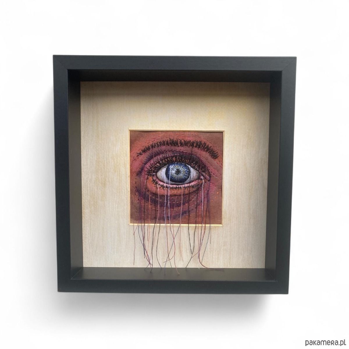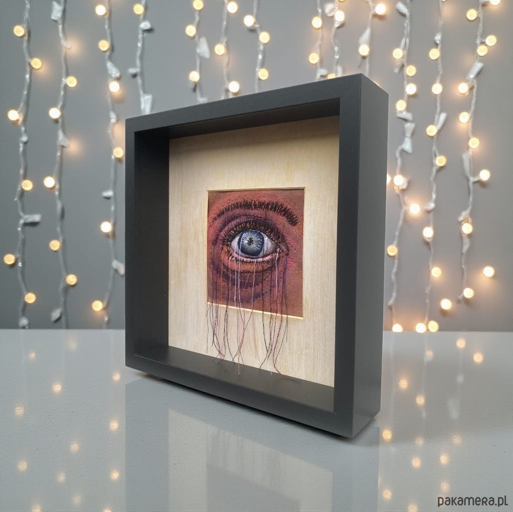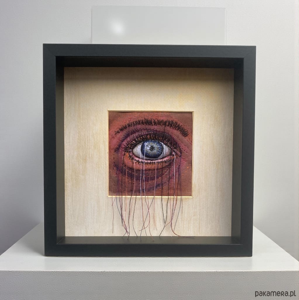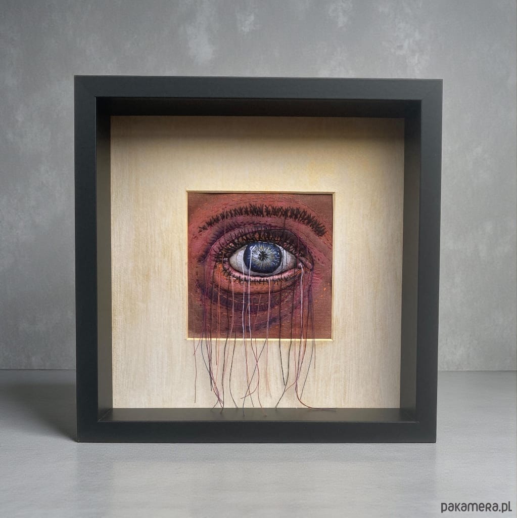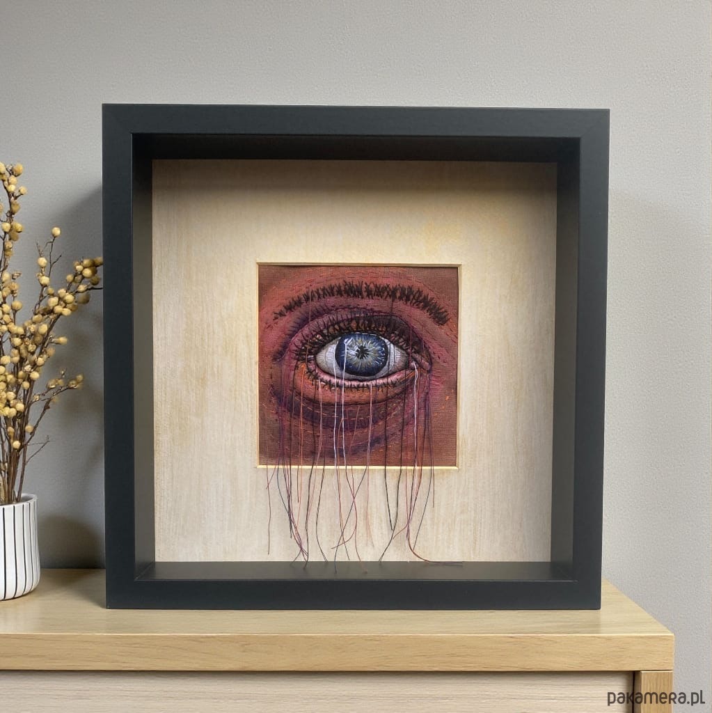 Obraz malowany farbami i haftowany bawełnianymi nićmi oko 3D wypchane miękkim puchem a niteczki połatanego oka pięknie kołyszą się na wietrze. W ramie ukryta pleksi można nią przysłonić obraz.