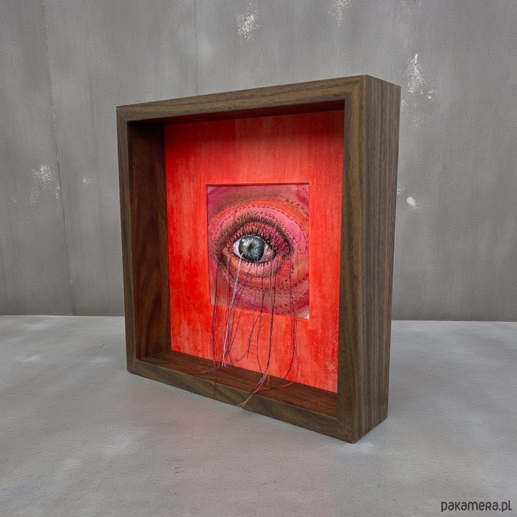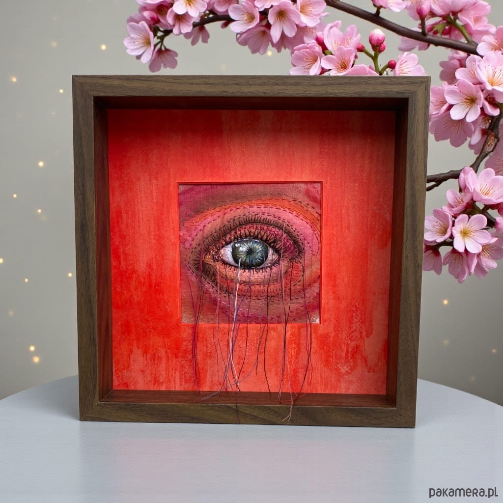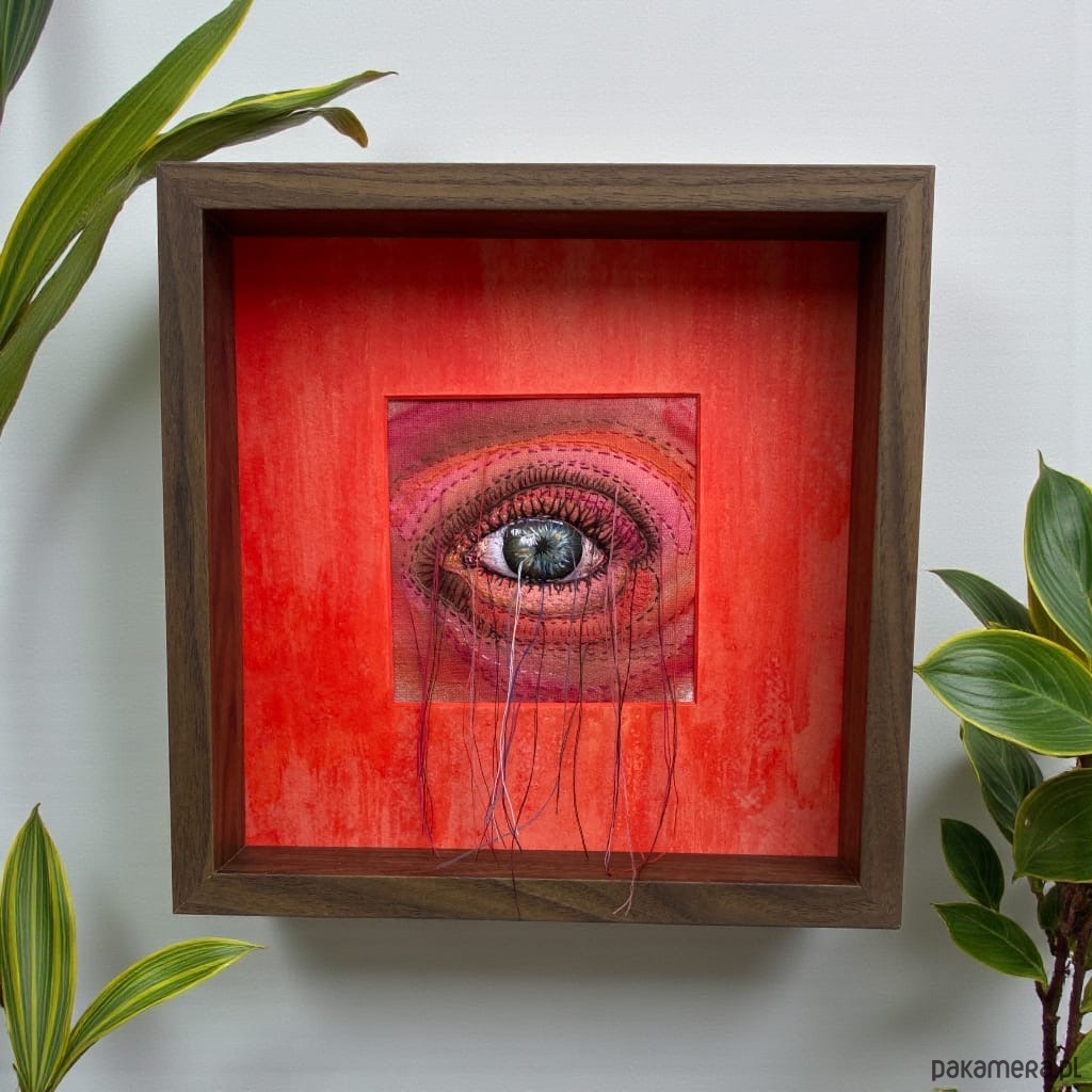 Obraz malowany farbami i haftowany bawełnianymi nićmi oko 3D wypchane miękkim puchem a niteczki połatanego oka pięknie kołyszą się na wietrze. W ramie ukryta pleksi można nią przysłonić obraz.