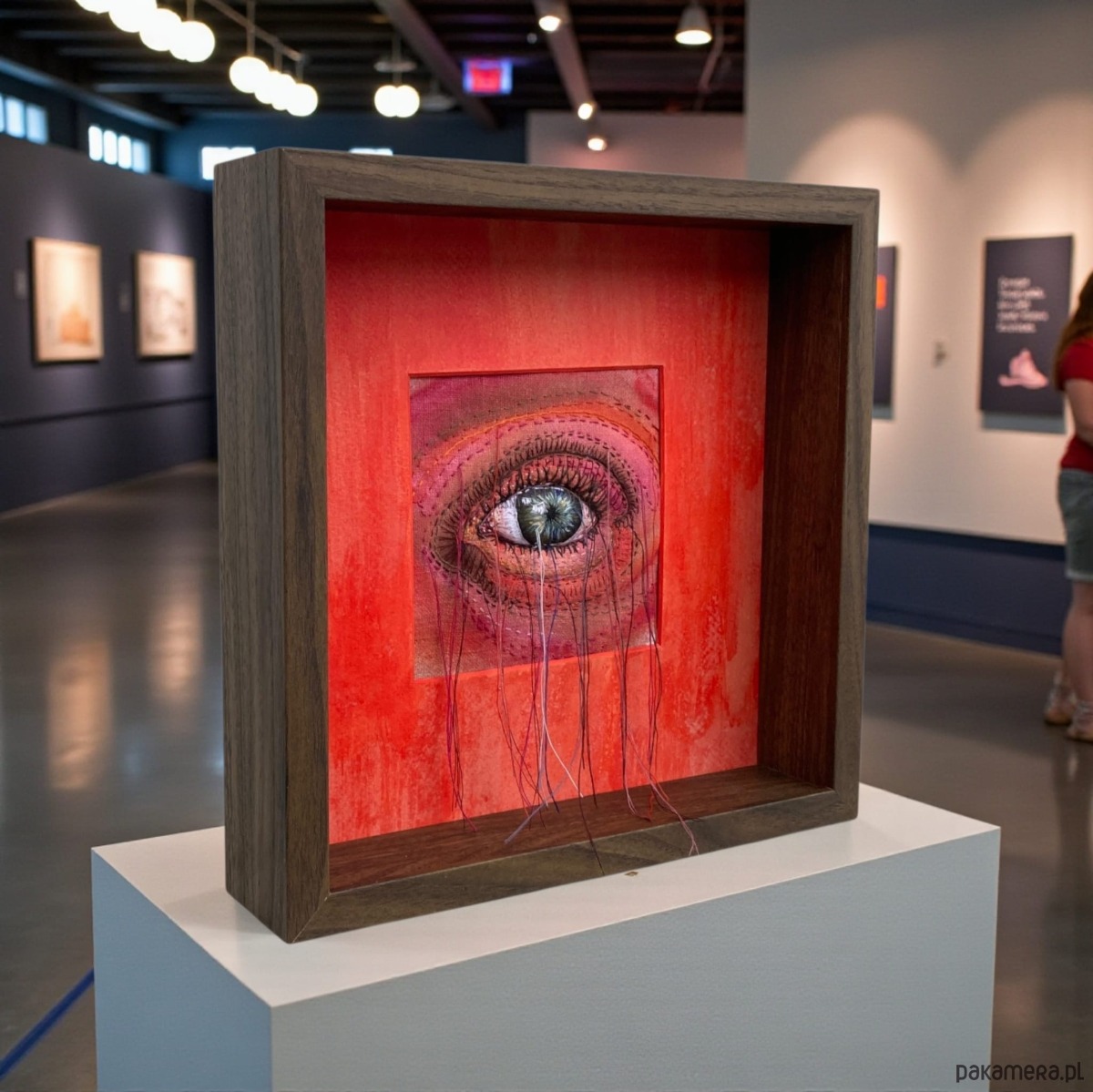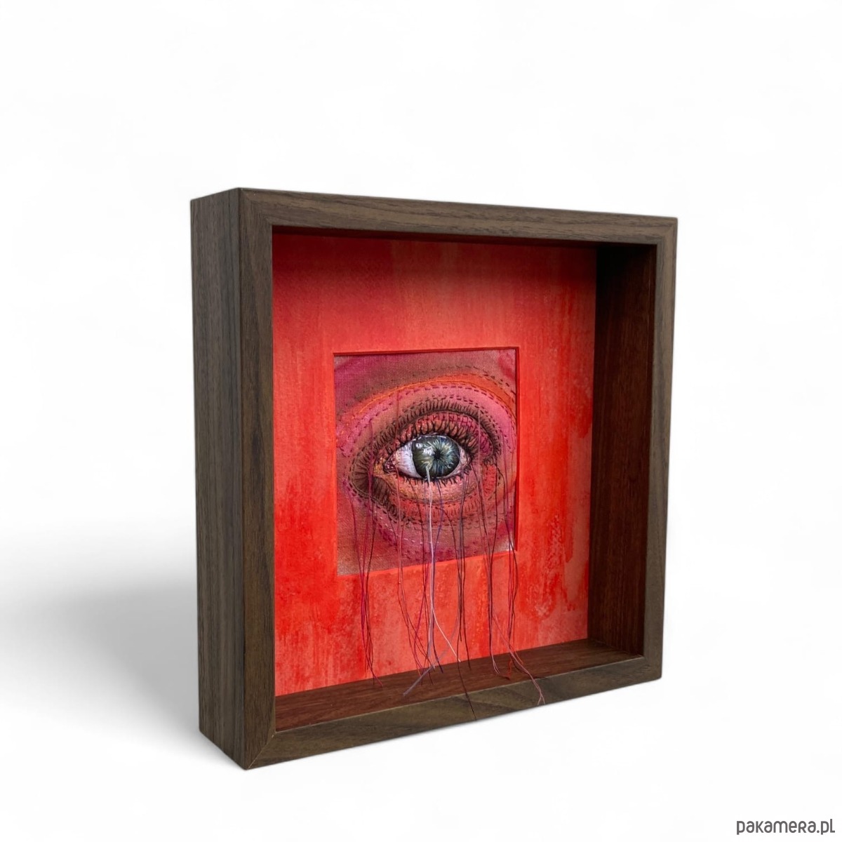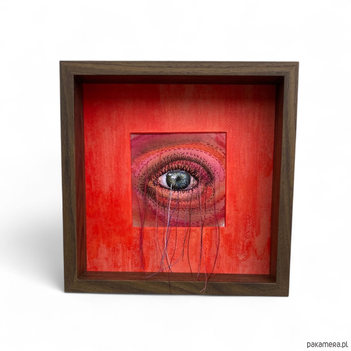 Obraz malowany farbami i haftowany bawełnianymi nićmi oko 3D wypchane miękkim puchem a niteczki połatanego oka pięknie kołyszą się na wietrze. W ramie ukryta pleksi można nią przysłonić obraz.