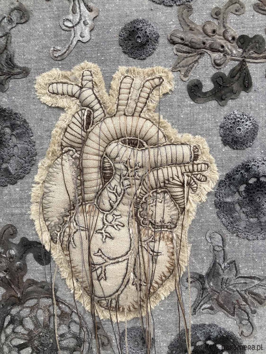 Uszyłam z tkanin lnianych serduszko anatomiczne, wyhaftowałam nitkami, każdy fragment wypchałam miękkim puchem, zakwitło w ramie haftowanym wzorem.