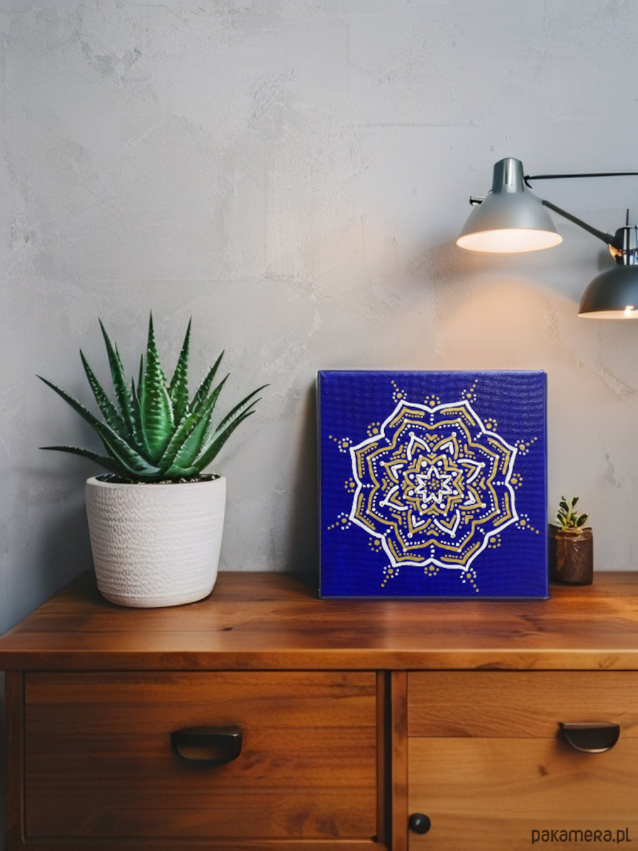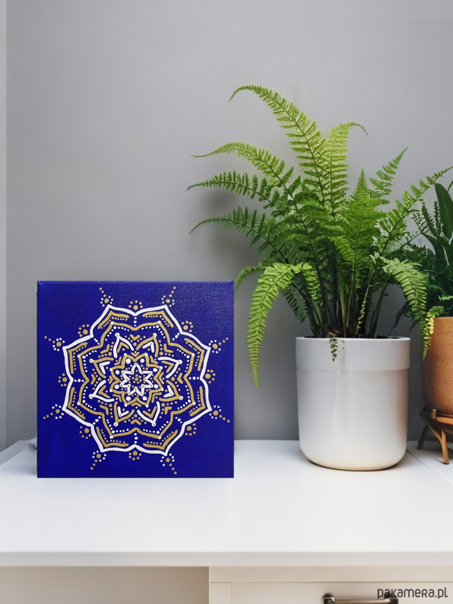 Mandala rozkwita na głębokim tle ultramaryny niczym nocne niebo, w którym złote i białe formy układają się w świetlistą geometrię. Złoto symbolizuje boską mądrość, duchowe prowadzenie i wieczną energię, a biel wnosi czystość, niewinność i przejrzystość serca. Połączenie tych dwóch barw na błękicie otwiera przestrzeń do kontemplacji, ochrony i wewnętrznego pokoju.