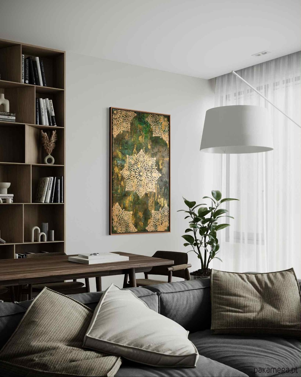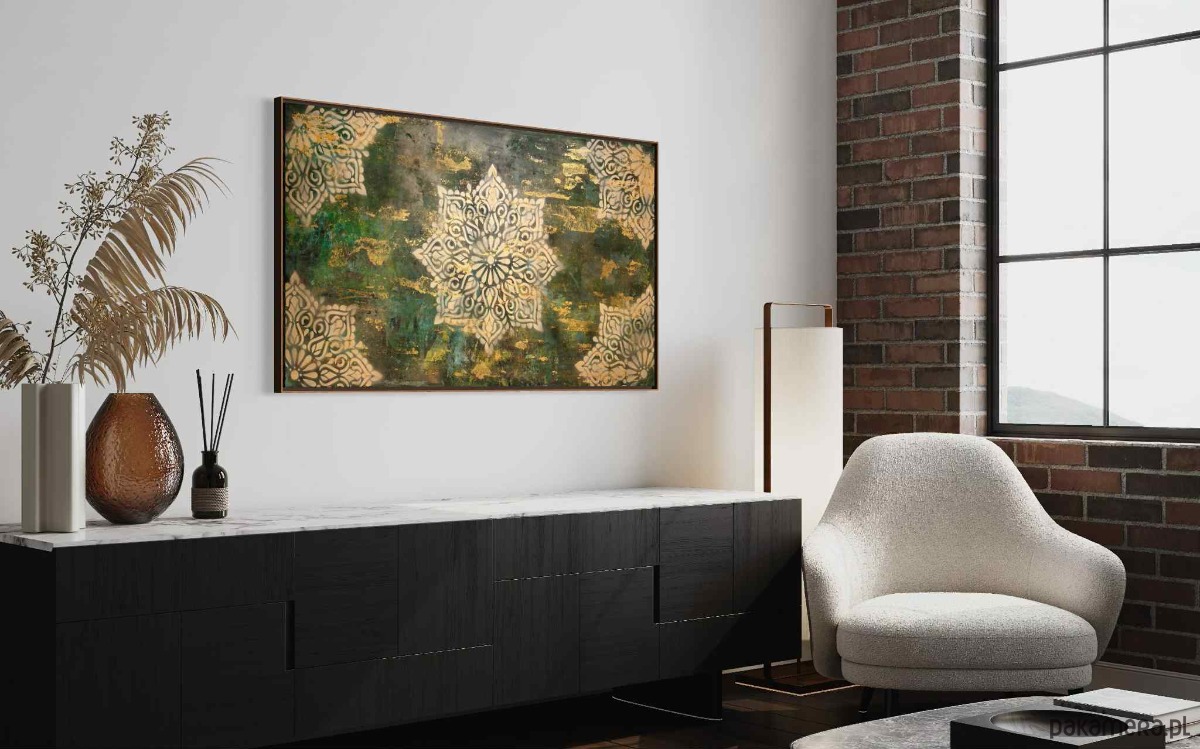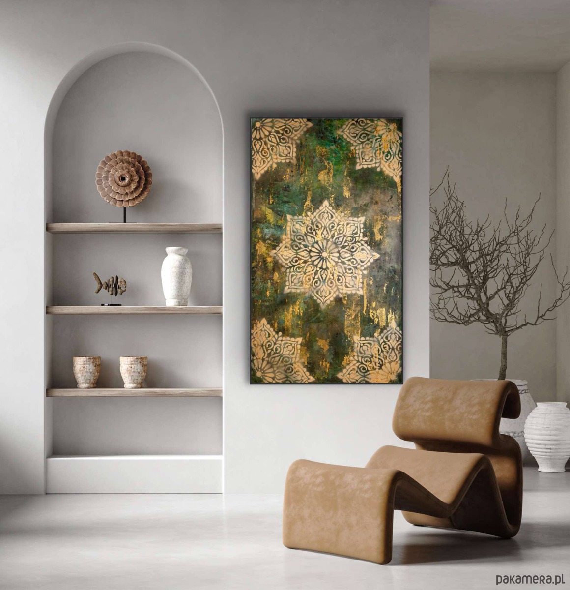 Abstrakcyjny obraz prezentujący mandalę. Piękna głęboka zieleń i przebijające kolory szmaragdu i złota. Harmonijne zestawienie mandali okraszone płatkami złota.