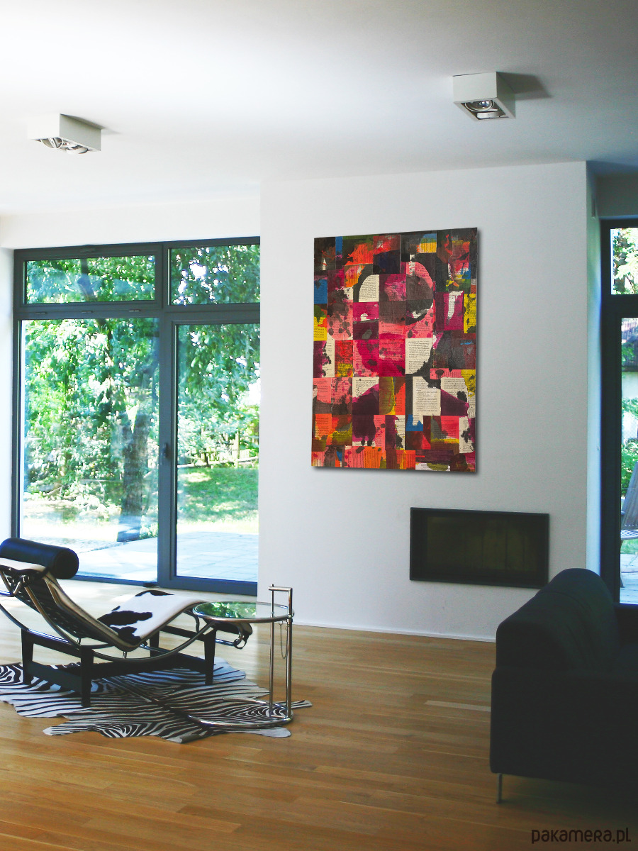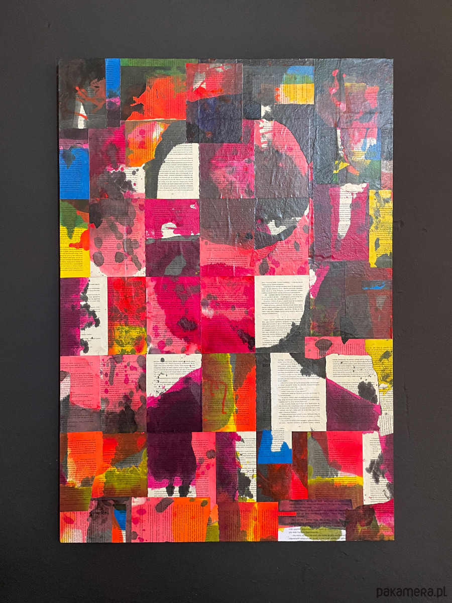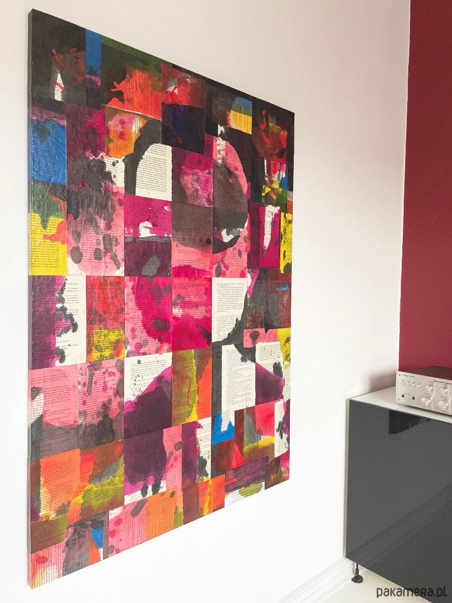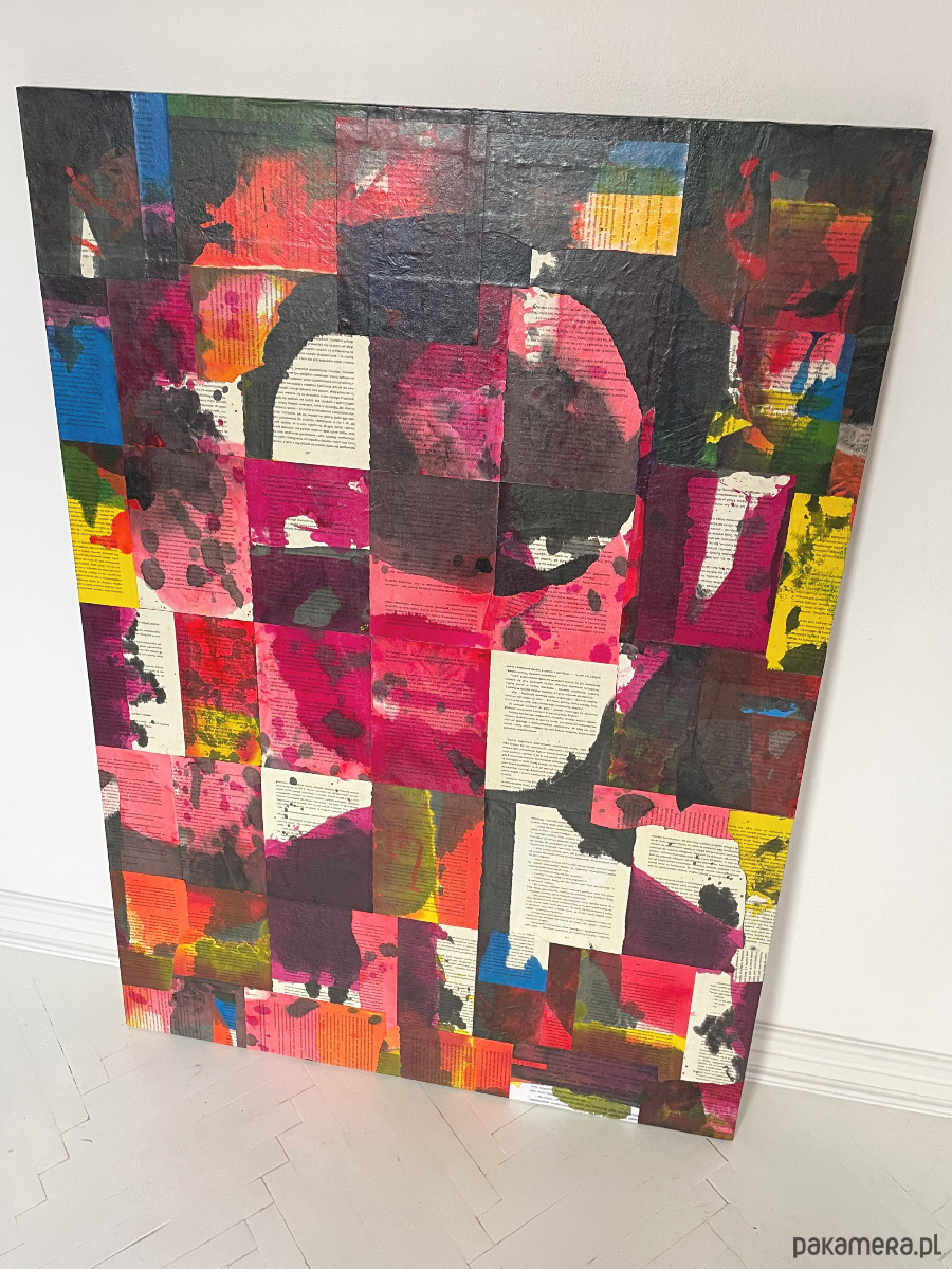 Jedyny w swoim rodzaju obraz, abstrakcyjny collage MONA LUNA, Wymiary 86,5 na 125 na 2,3 cm (collage z ręcznie barwionych różnymi technikami stron książki, mojej powieści "Wielki czarny kwadrat" - na płycie OSB grubości 2,2 cm). Boki obrazu też są pokryte collage'em, więc obraz nie wymaga oprawy. Autor: Igor Stefanowicz.