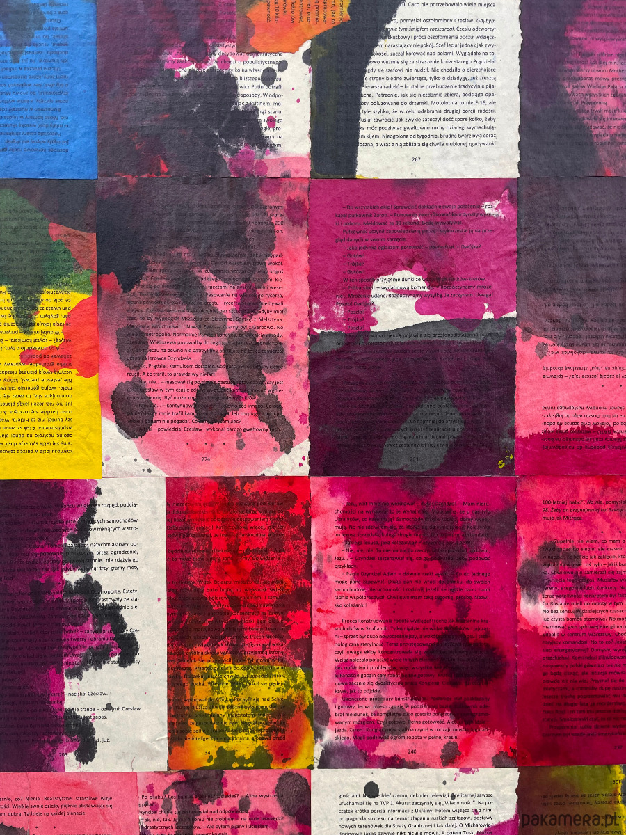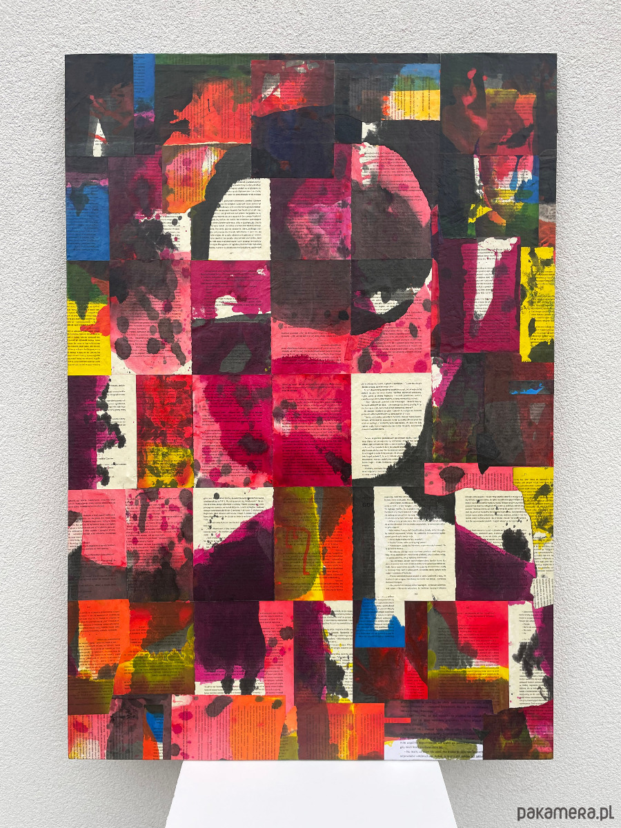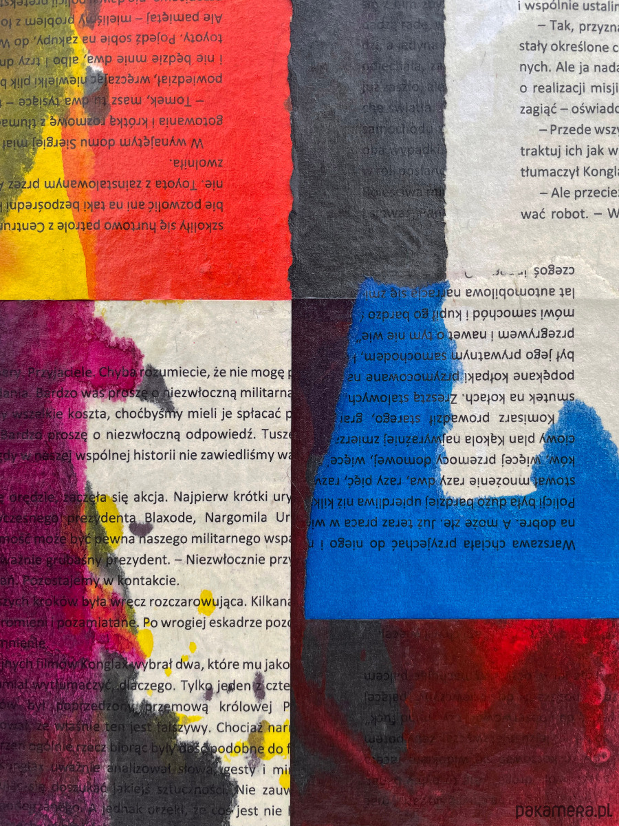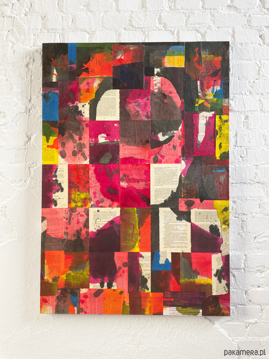 Jedyny w swoim rodzaju obraz, abstrakcyjny collage MONA LUNA, Wymiary 86,5 na 125 na 2,3 cm (collage z ręcznie barwionych różnymi technikami stron książki, mojej powieści "Wielki czarny kwadrat" - na płycie OSB grubości 2,2 cm). Boki obrazu też są pokryte collage'em, więc obraz nie wymaga oprawy. Autor: Igor Stefanowicz.