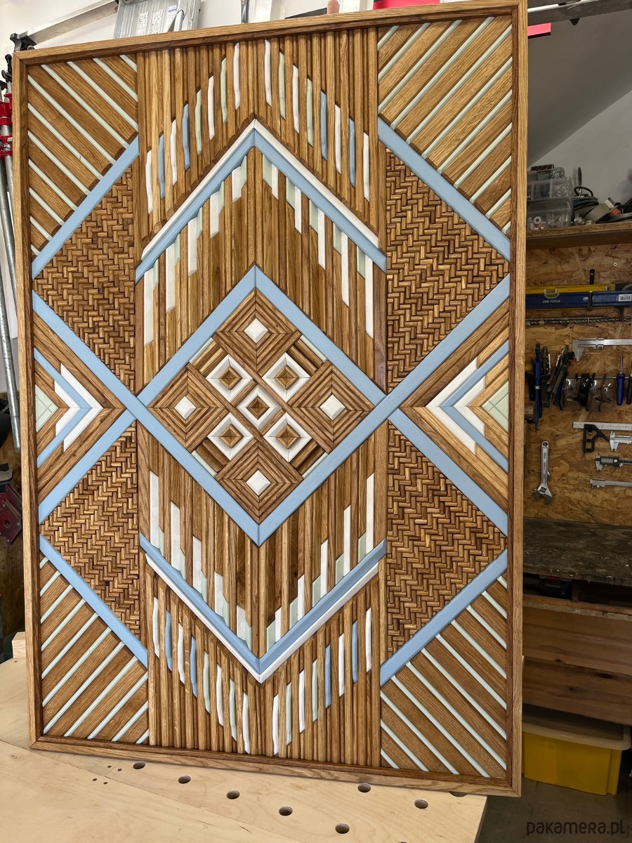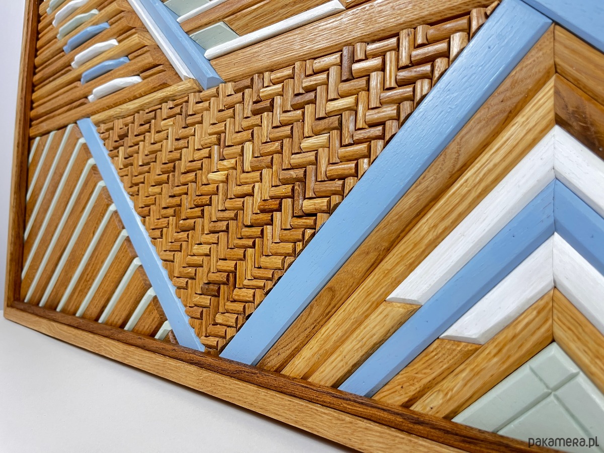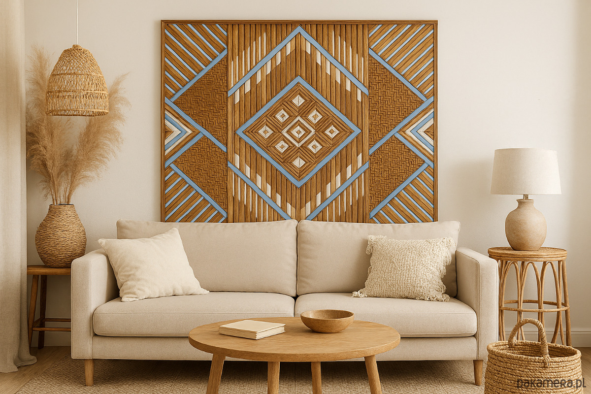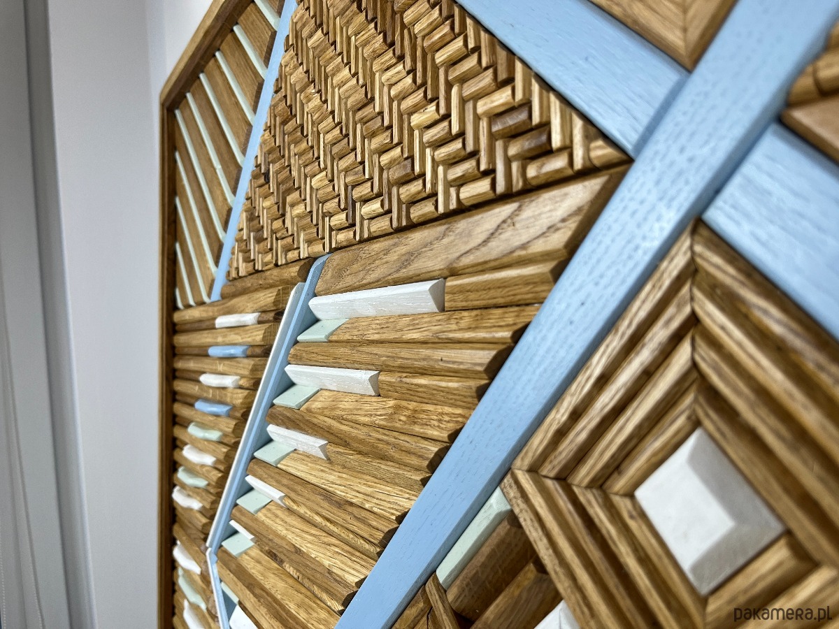 Ręcznie wykonana, drewniana mozaika ścienna w stylu boho, stworzona z naturalnego drewna dębowego.