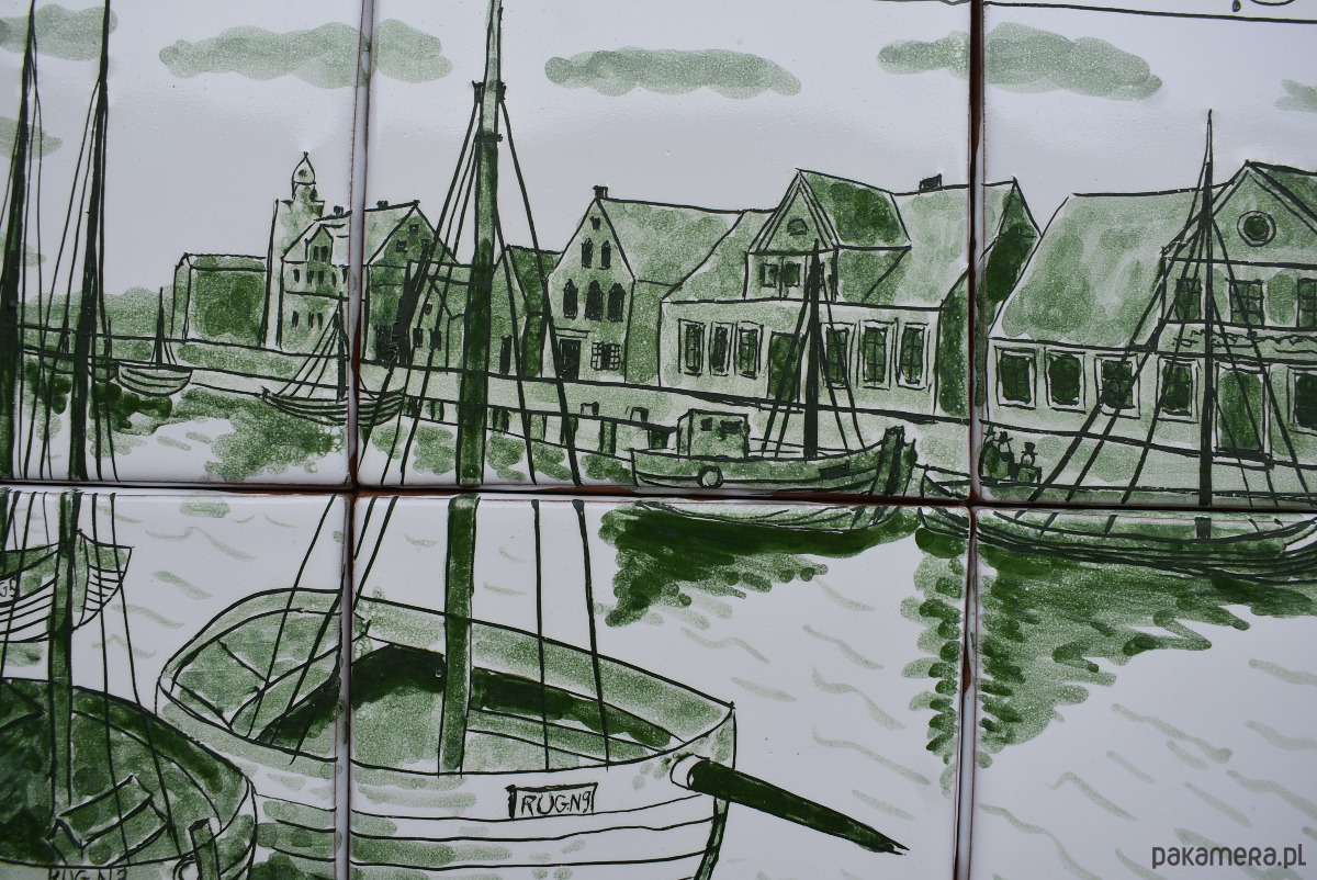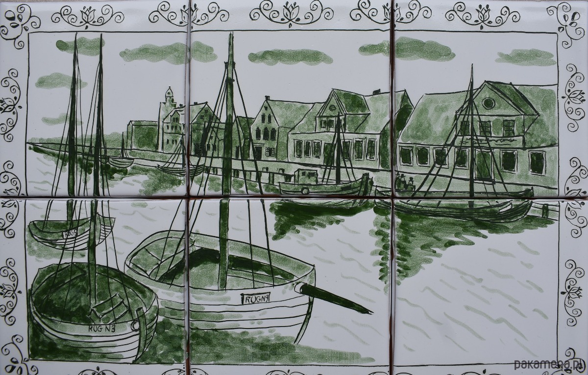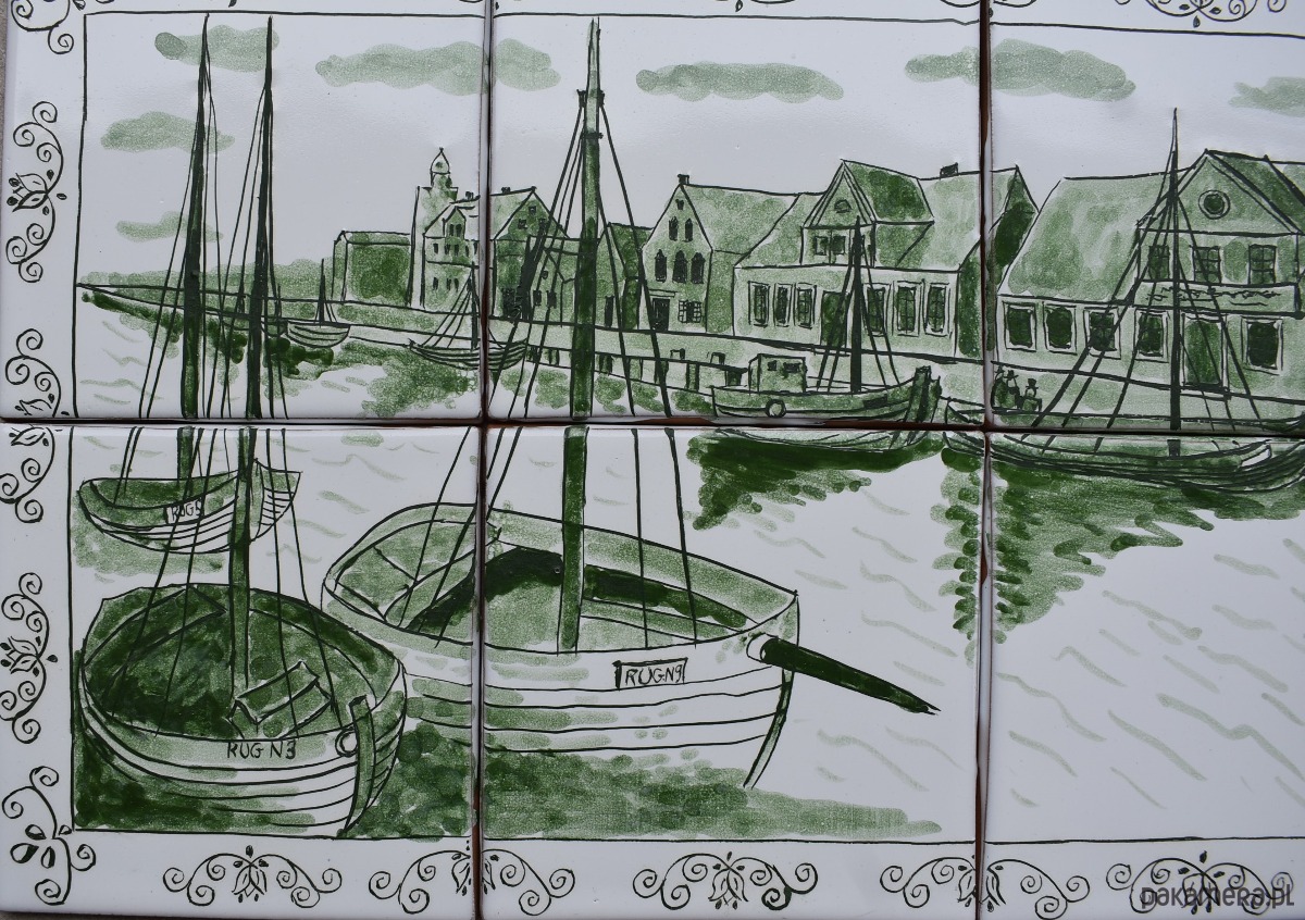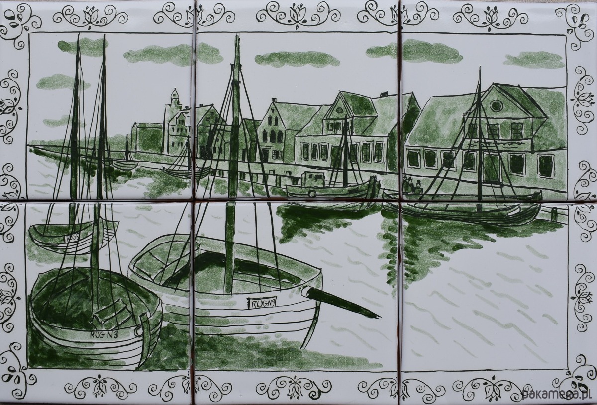 Zestaw z 6 kafelków w stylu holenderskim- port, wymiary kafla 15x 15 cm- całość (45x 30 cm), ręcznie malowane tlenkiem chromu na białym szkliwie. wypalone w temperaturze ponad 1000 stopni Celsjusza. Produkt współczesny.