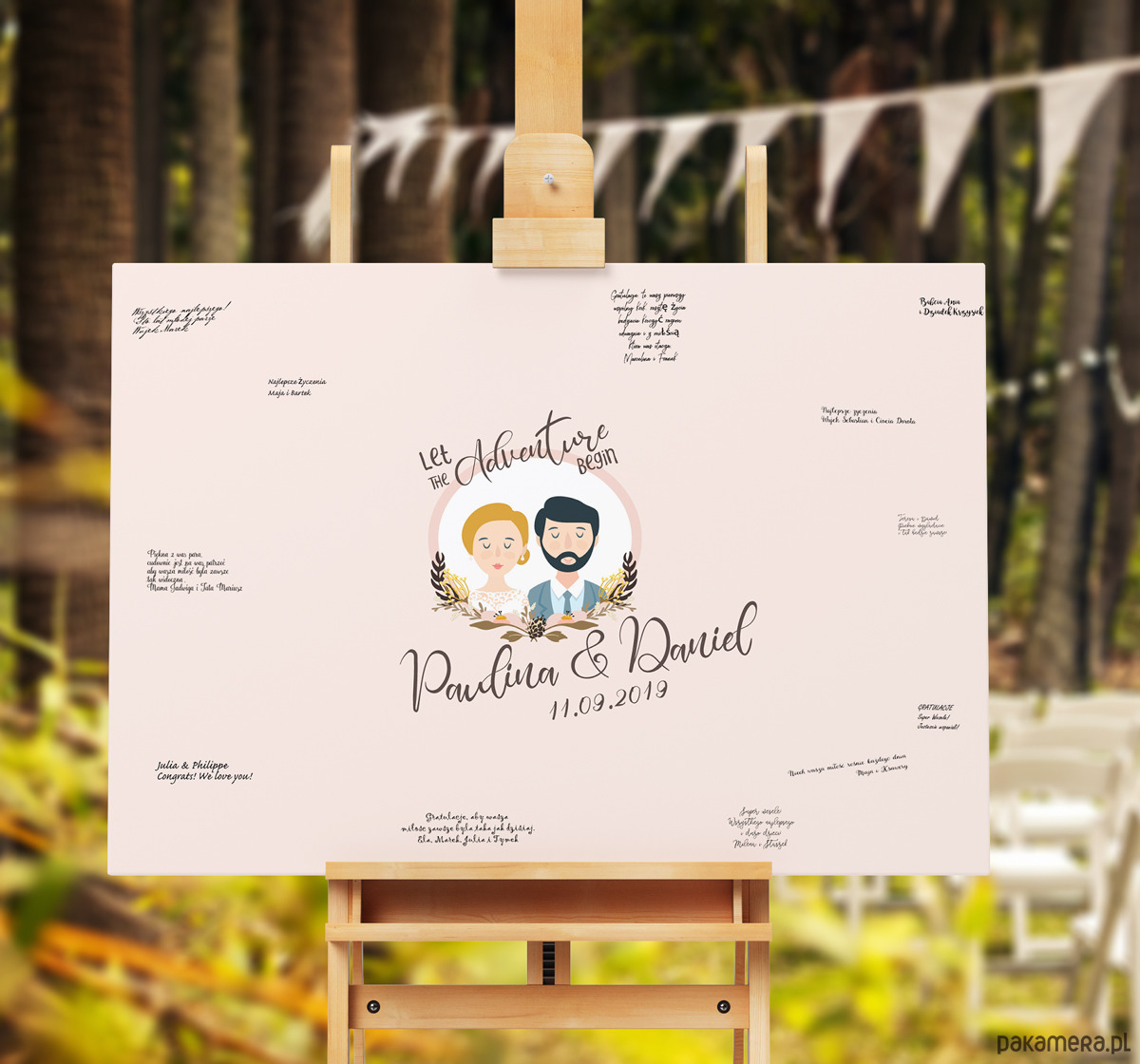 Obraz jest gotowy do powieszenia na ścianie. Na obrazie goście zostawiają swój wpis podczas wesela.Jest to wspaniała pamiątka z tego jedynego dnia.