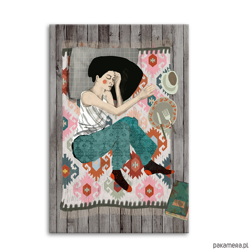 Ten obraz to chwila zatrzymania i odpoczynku. Ilustracyjna postać kobiety wtulonej w miękki, wzorzysty dywan przywodzi na myśl spokojne popołudnie, ciszę i moment tylko dla siebie. Folkowe motywy, delikatne kolory i surowe tło z desek tworzą przyjemny kontrast i nadają całości ciepły, lekko retro klimat.