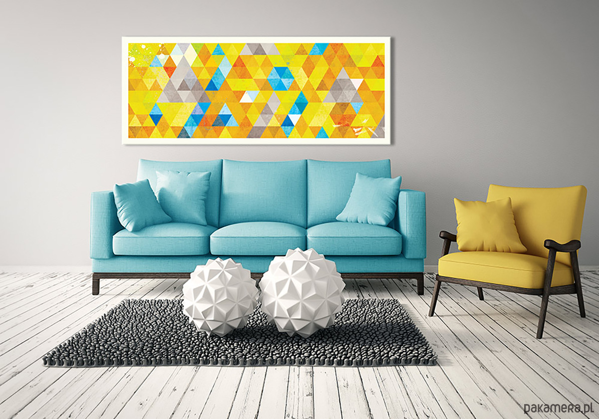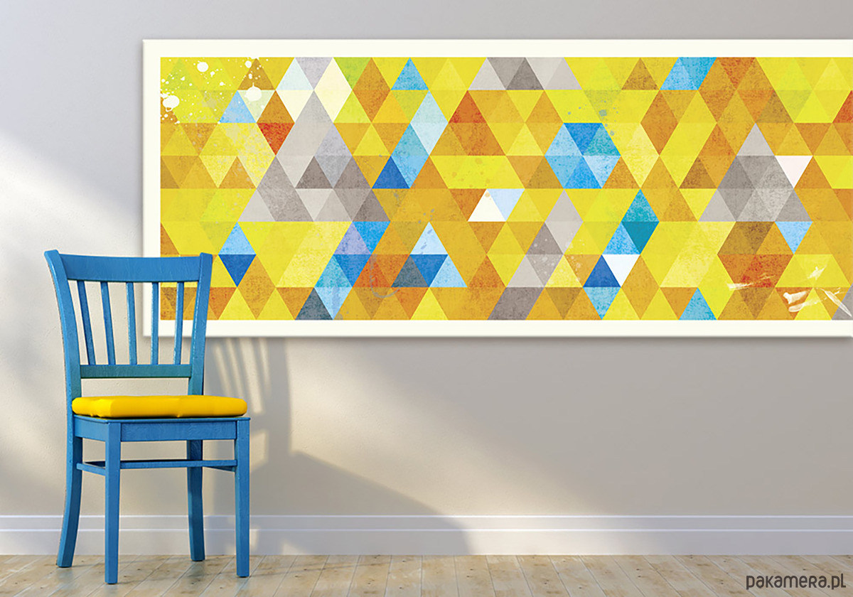 Nowoczesny obraz abstrakcyjny oparty na rytmicznej kompozycji trójkątów w energetycznej, słonecznej kolorystyce. Połączenie żółci, pomarańczy, błękitów i szarości tworzy dynamiczny, a jednocześnie harmonijny wzór, który ożywia wnętrze i nadaje mu współczesnego charakteru. Idealny akcent do salonu, biura lub przestrzeni kreatywnej.