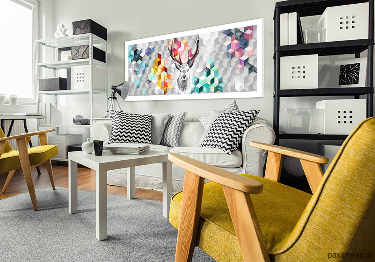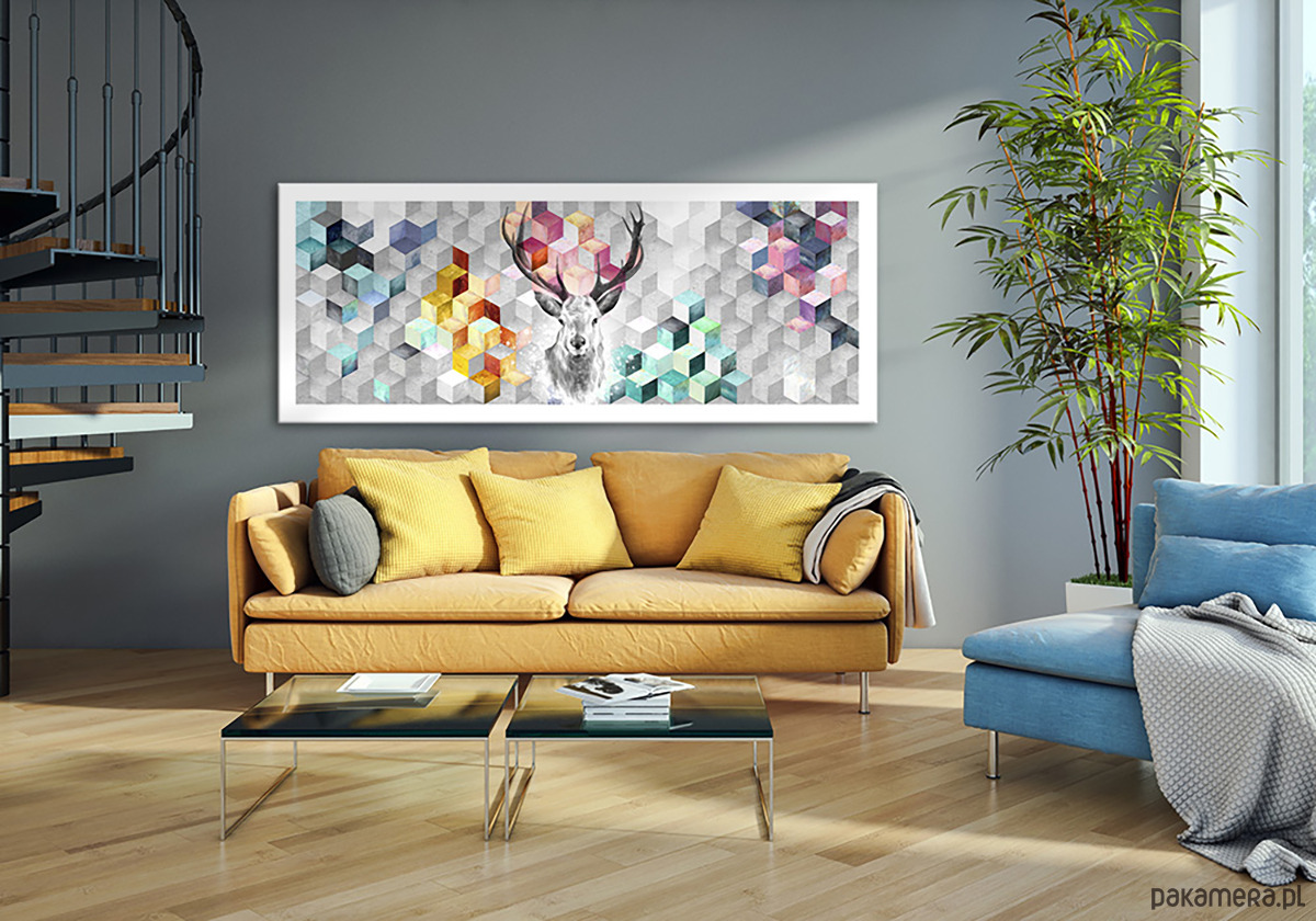 Centralna postać jelenia wprowadza element natury i spokoju, kontrastując z uporządkowaną, niemal architektoniczną strukturą tła. To połączenie sprawia, że obraz doskonale wpisuje się w nowoczesne wnętrza – od minimalistycznych po industrialne.