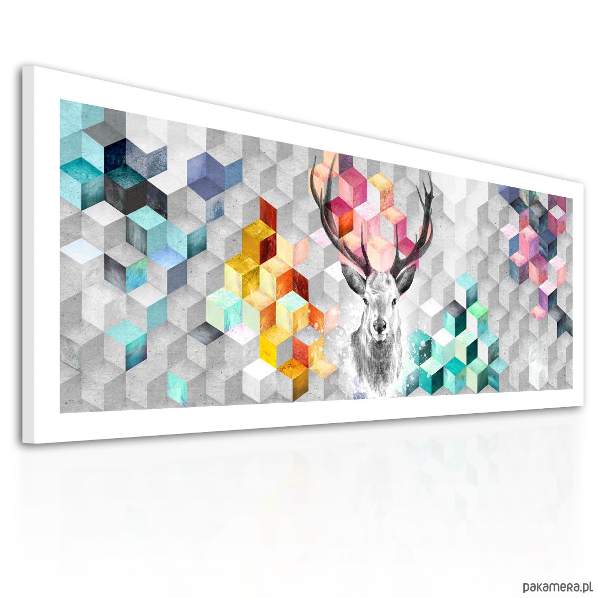 Nowoczesna i wyrazista ilustracja łącząca realistyczny wizerunek jelenia z abstrakcyjną, geometryczną kompozycją. Tło zbudowane z przestrzennych kostek w odcieniach szarości przełamane jest energetycznymi akcentami kolorów – turkusu, żółci, różu i pomarańczu, które nadają całości dynamiki i głębi.