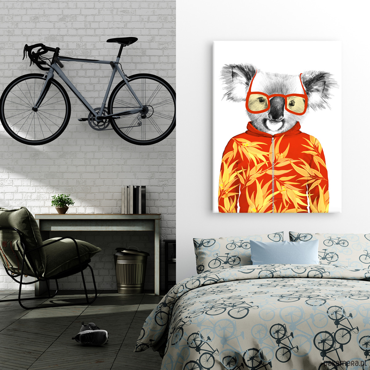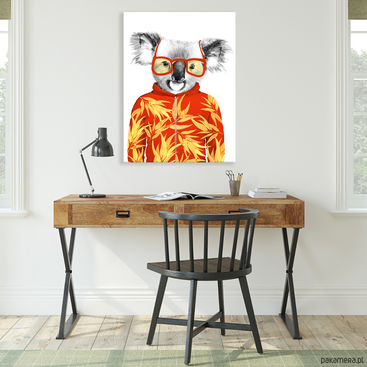 Nowoczesny obraz z ilustracyjnym, humorystycznym motywem koali w modowej stylizacji. Połączenie czarno-białego rysunku z intensywną czerwienią i roślinnym wzorem nadaje pracy wyrazisty, designerski charakter. Minimalistyczne tło podkreśla postać i kolorystyczny kontrast. Obraz idealnie sprawdzi się jako oryginalna dekoracja do nowoczesnych wnętrz – salonu, biura lub pokoju młodzieżowego.