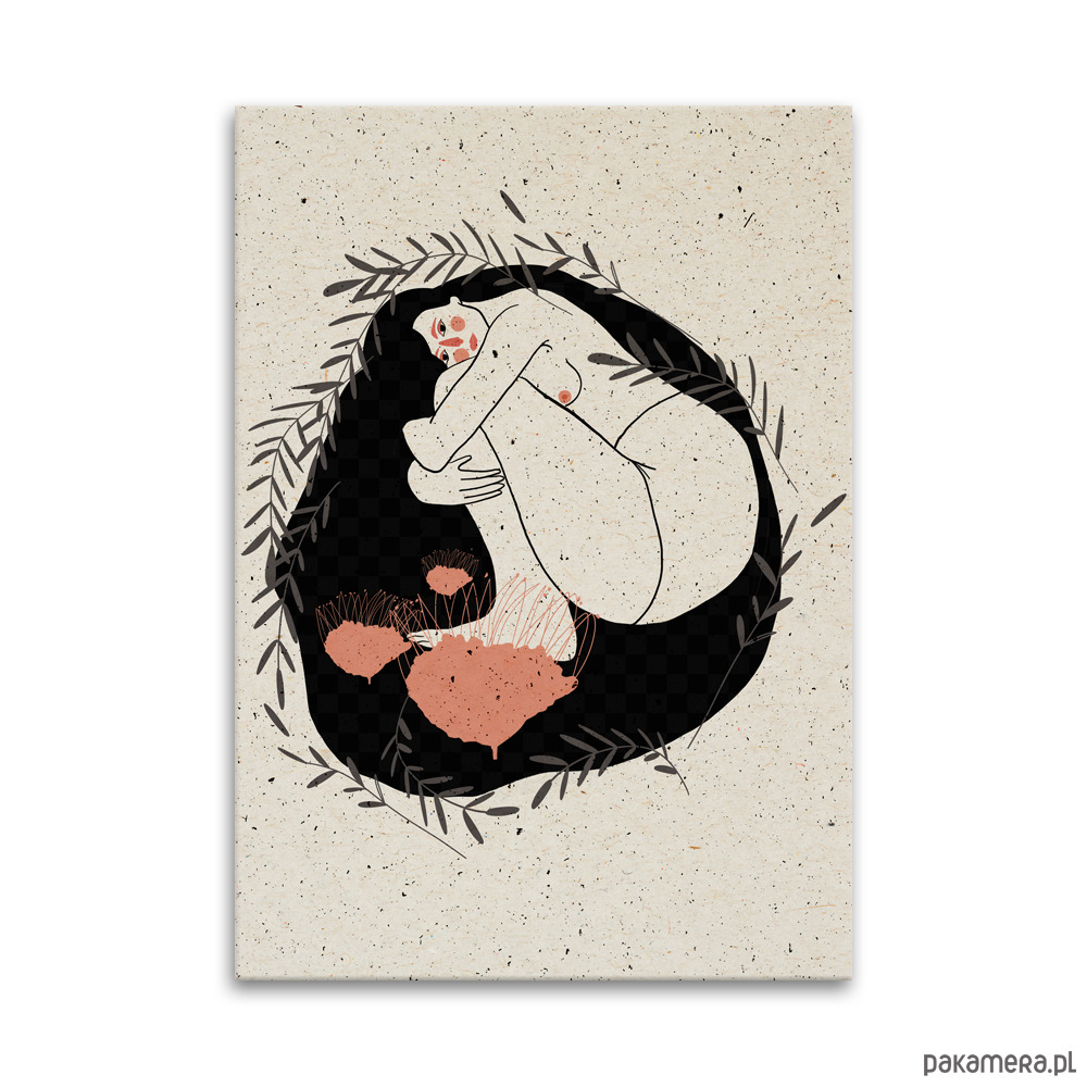 Subtelna i nastrojowa ilustracja przedstawiająca kobiecą postać otuloną organiczną formą przypominającą liść lub kokon. Kompozycja utrzymana w stonowanej palecie barw – beżach, czerni i przygaszonym różu – tworzy spokojny, introspektywny klimat.