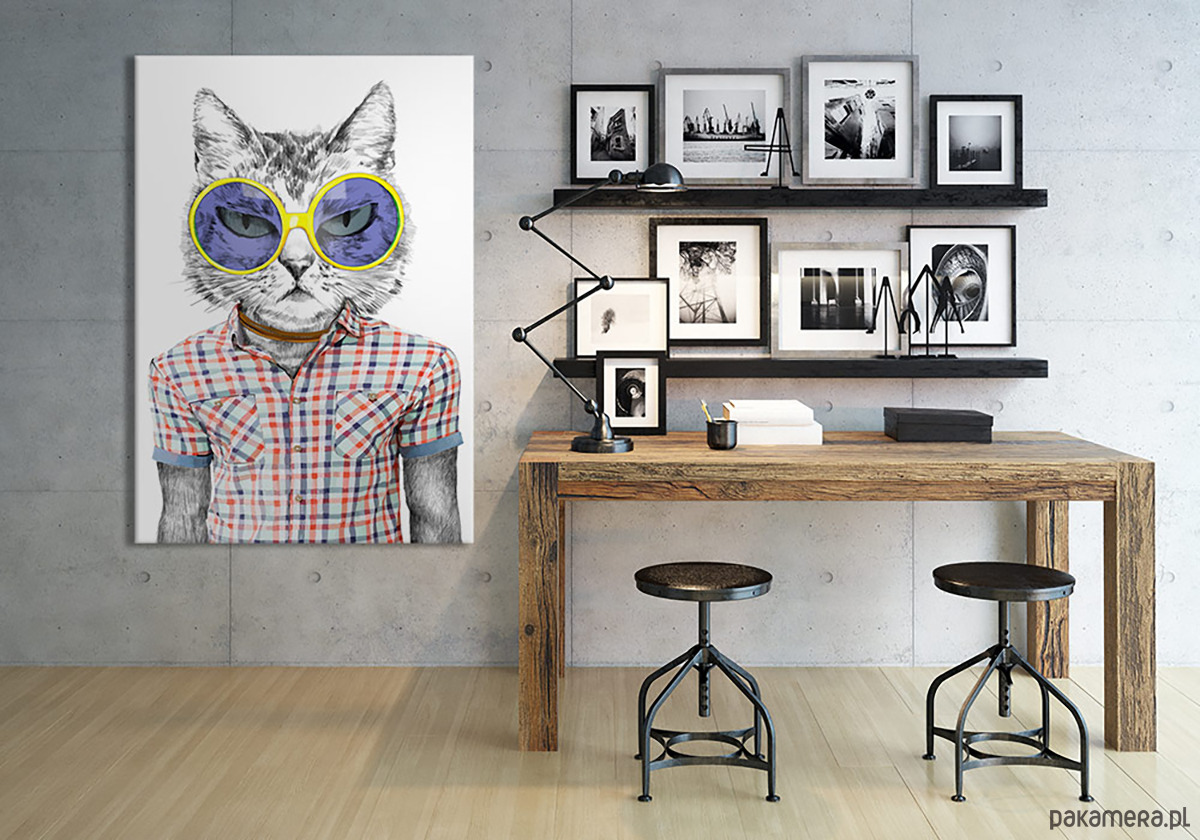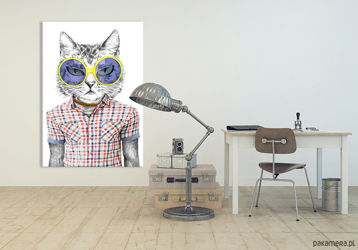 Nowoczesny obraz z humorystycznym motywem kota w okularach, utrzymany w stylu ilustracyjnym. Minimalistyczna forma połączona z modowym akcentem nadaje pracy lekkości i charakteru. Idealny do nowoczesnych wnętrz, domowego biura lub pokoju kreatywnego – jako oryginalna dekoracja z przymrużeniem oka.