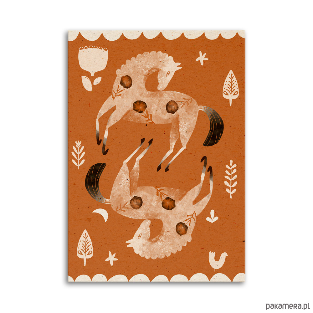 Grafika inspirowana stylem folkowym, z delikatnym motywem koni i roślinnych ornamentów. Ciepłe, naturalne kolory i symetryczna kompozycja nadają całości spokojny, dekoracyjny charakter. Obraz dobrze odnajdzie się we wnętrzach w stylu boho, rustykalnym lub skandynawskim, wprowadzając przytulny i artystyczny klimat.