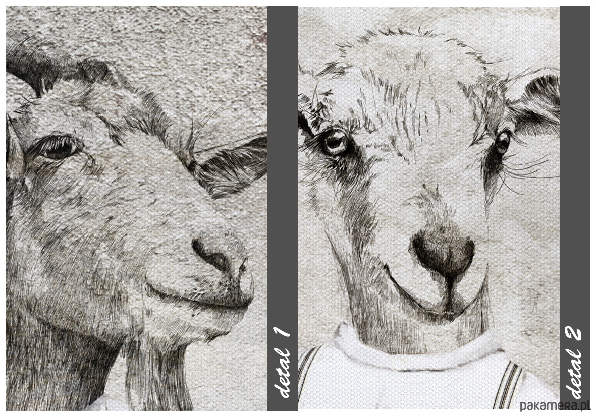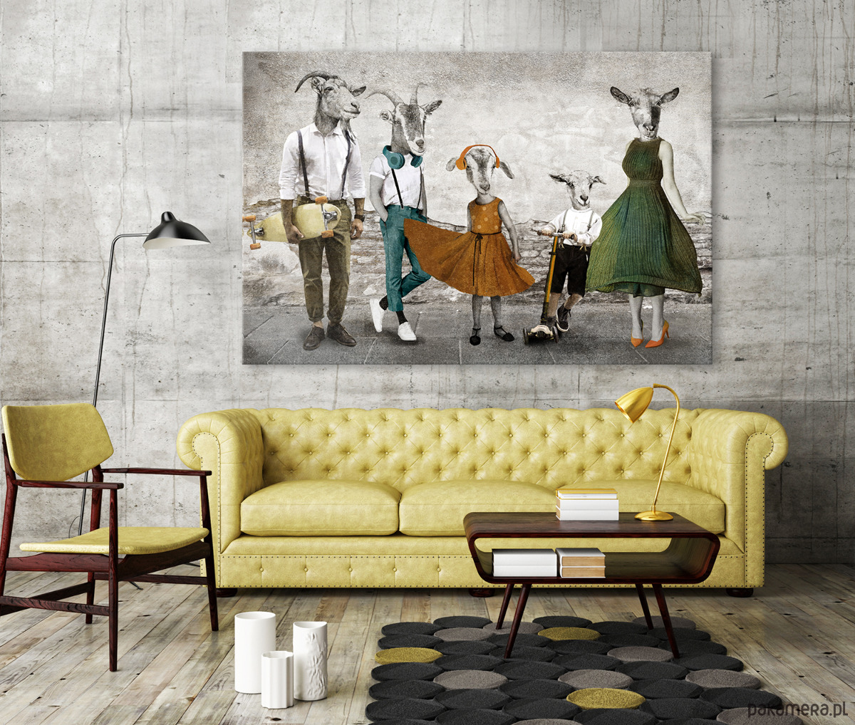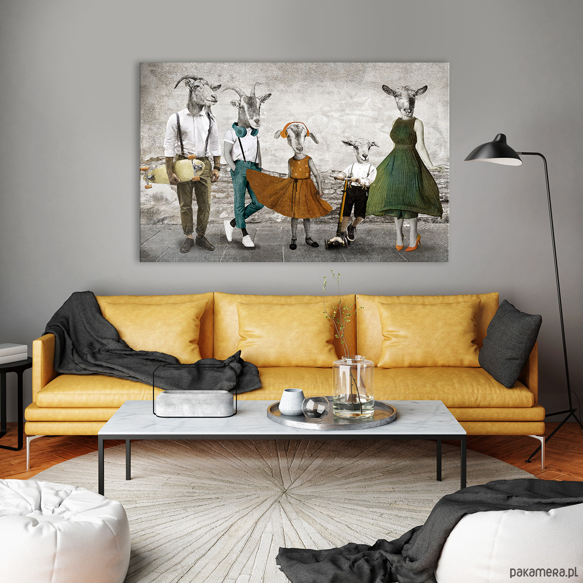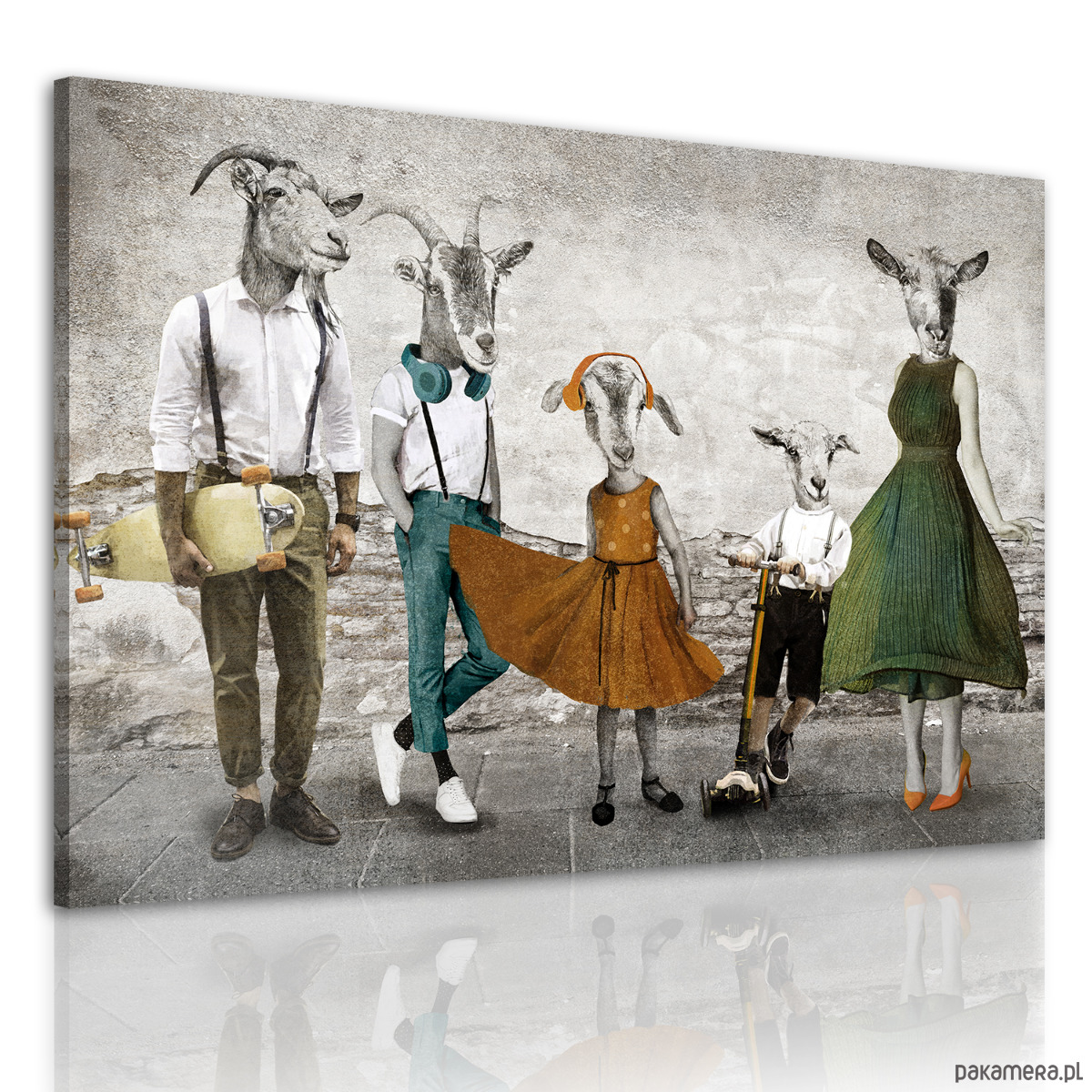 Ten wyjątkowy obraz na płótnie przedstawia surrealistyczną scenę rodzinną, w której ludzkie sylwetki połączono z głowami kóz – tworząc intrygującą i humorystyczną kompozycję.