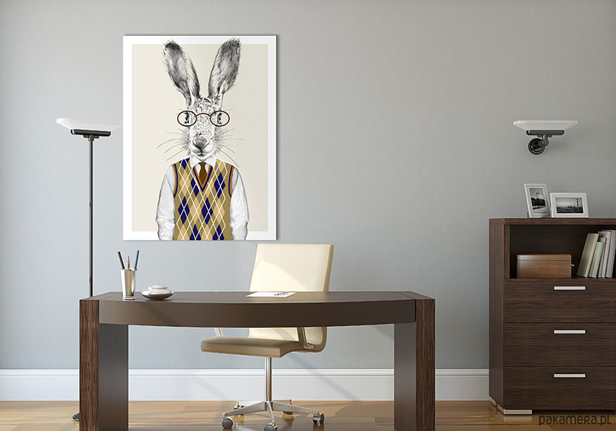 Stylowa i pełna charakteru ilustracja przedstawiająca królika w eleganckim wydaniu – w koszuli, krawacie i klasycznym swetrze w romby. Subtelna kreska w połączeniu z delikatną kolorystyką nadaje pracy lekko retro klimatu, który świetnie wpisuje się zarówno w nowoczesne, jak i bardziej klasyczne wnętrza.