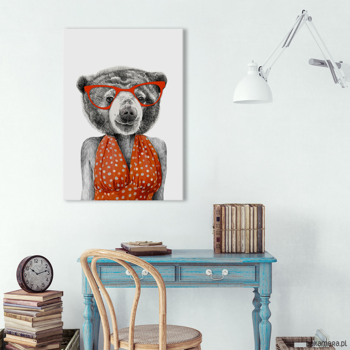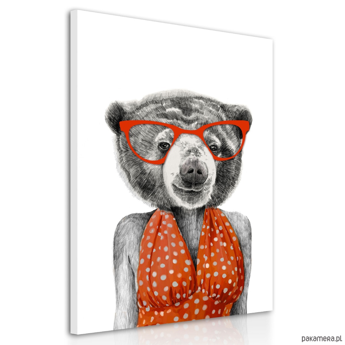 Ilustracyjny obraz z humorystycznym motywem pani misiowej w czerwonych okularach i sukience w grochy. Połączenie realistycznego rysunku z modowym akcentem nadaje pracy lekki, zabawny charakter. Minimalistyczne tło sprawia, że obraz jest wyrazisty i łatwo dopasować go do różnych wnętrz.