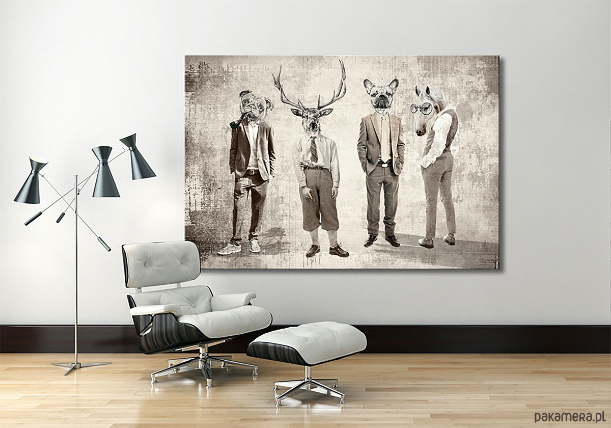 Luźna ekipa, poważne miny i lekki absurd w tle. Ilustracja bawi się konwencją klasycznego portretu, dorzucając surrealistyczny twist i sporo charakteru. Idealna do wnętrz z dystansem – loftu, gabinetu, salonu albo miejsca, które lubi mocne akcenty i nieoczywistą sztukę. Obraz, który przyciąga spojrzenia i zawsze wywołuje komentarz.