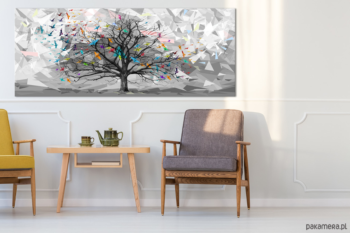 Nowoczesny obraz przedstawiający drzewo życia oraz kolorowe ptaki w geometrycznym stylu. Idealna dekoracja do salonu, sypialni lub biura, która doda wnętrzu energii i artystycznego charakteru.