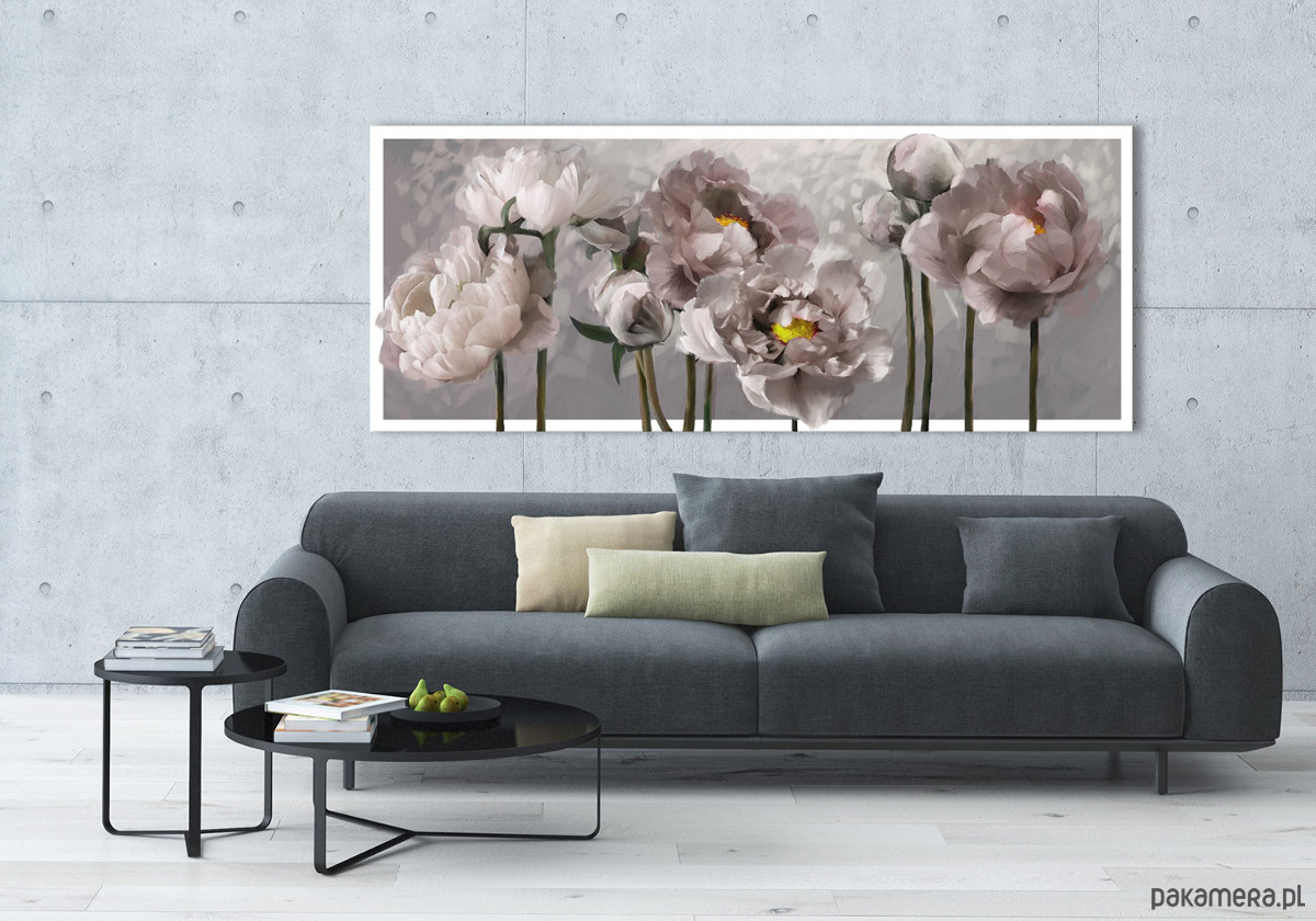 Elegancki obraz drukowany na płótnie typu canvas przedstawiający subtelne, pastelowe piwonie to idealna dekoracja dla osób ceniących wyrafinowaną estetykę i ponadczasowy styl. Delikatne, miękkie pociągnięcia pędzla oraz stonowana, szaro–beżowa kolorystyka nadają kompozycji romantyczny i lekko eteryczny charakter. Kwiaty zostały ukazane w pełnym rozkwicie, co dodaje obrazowi głębi i naturalnego uroku.