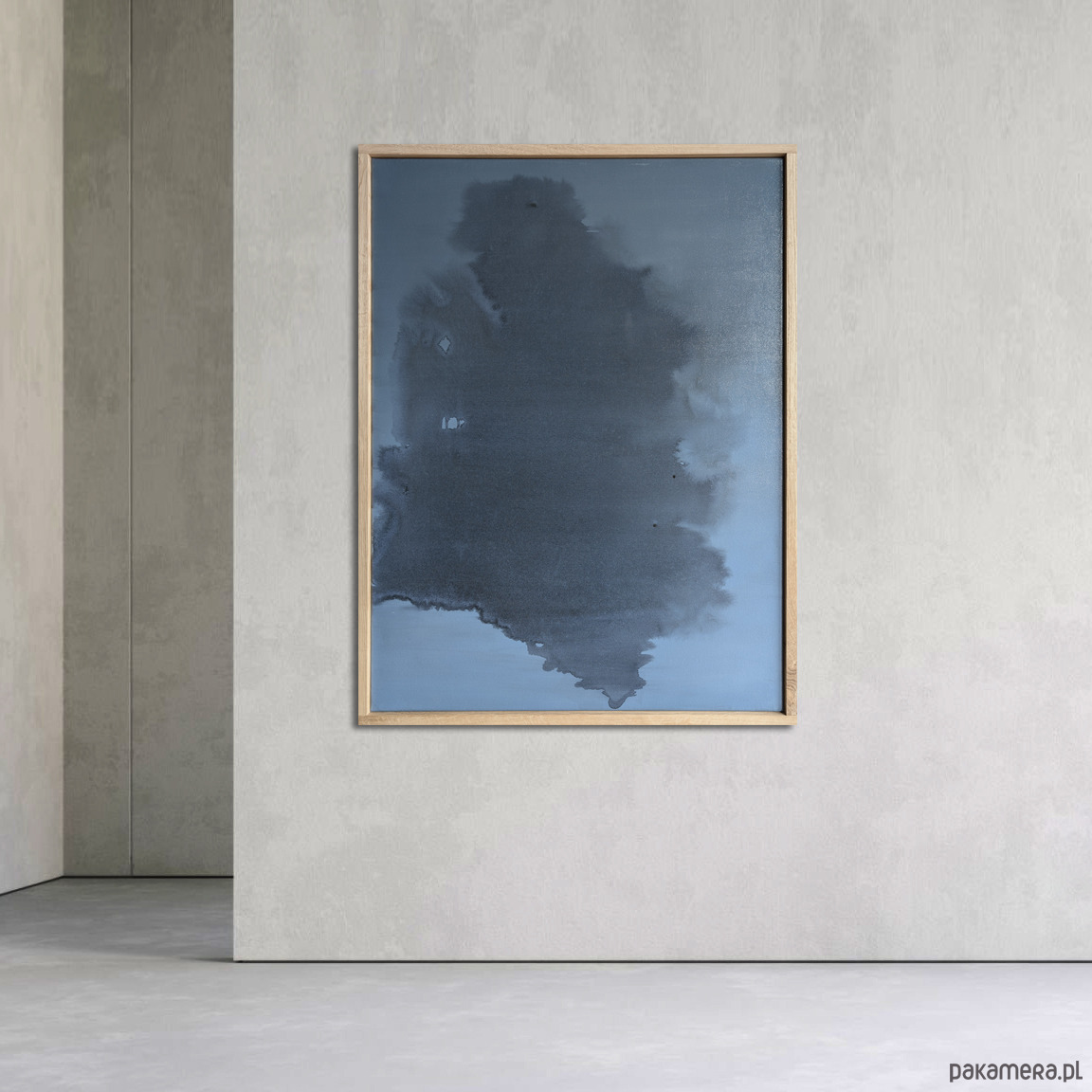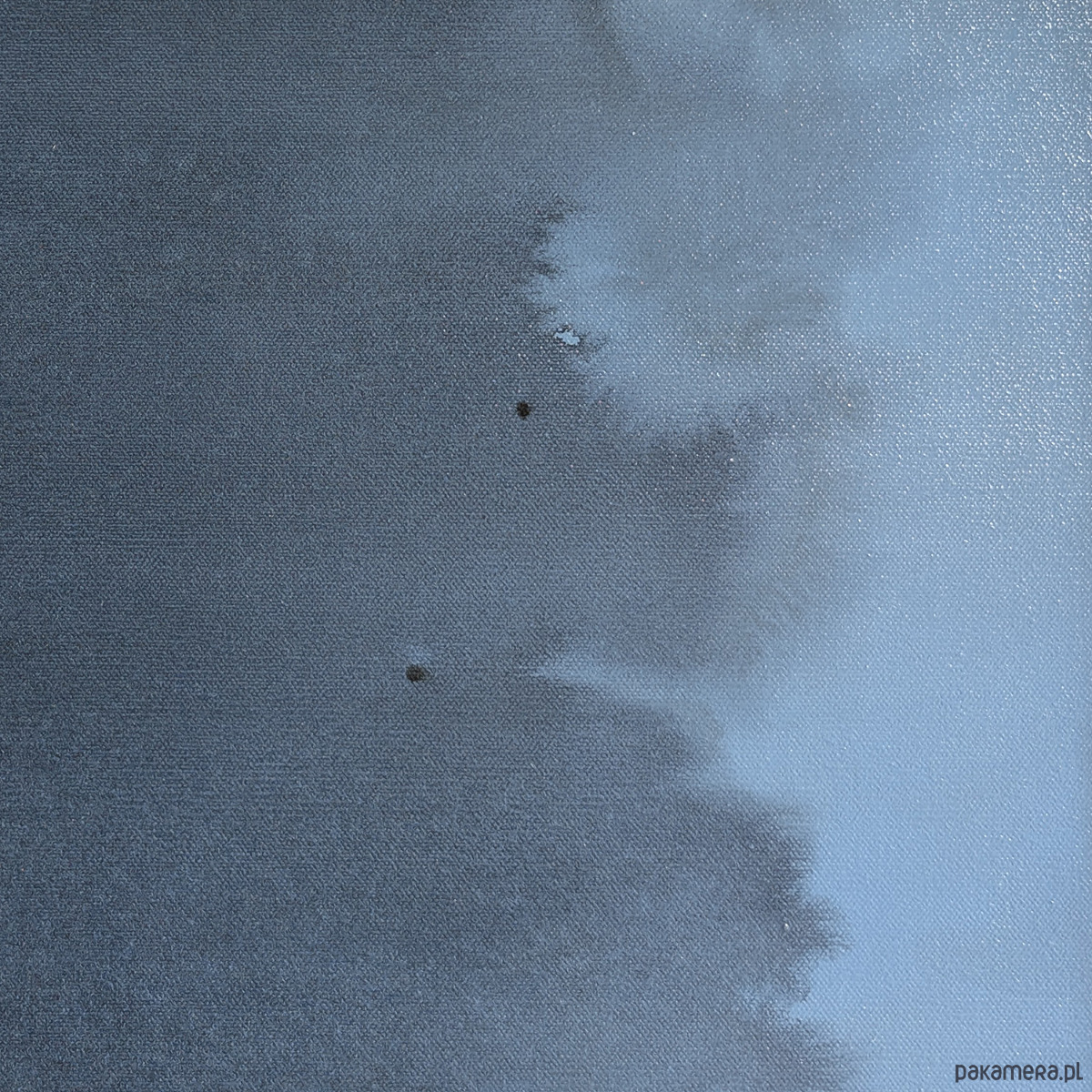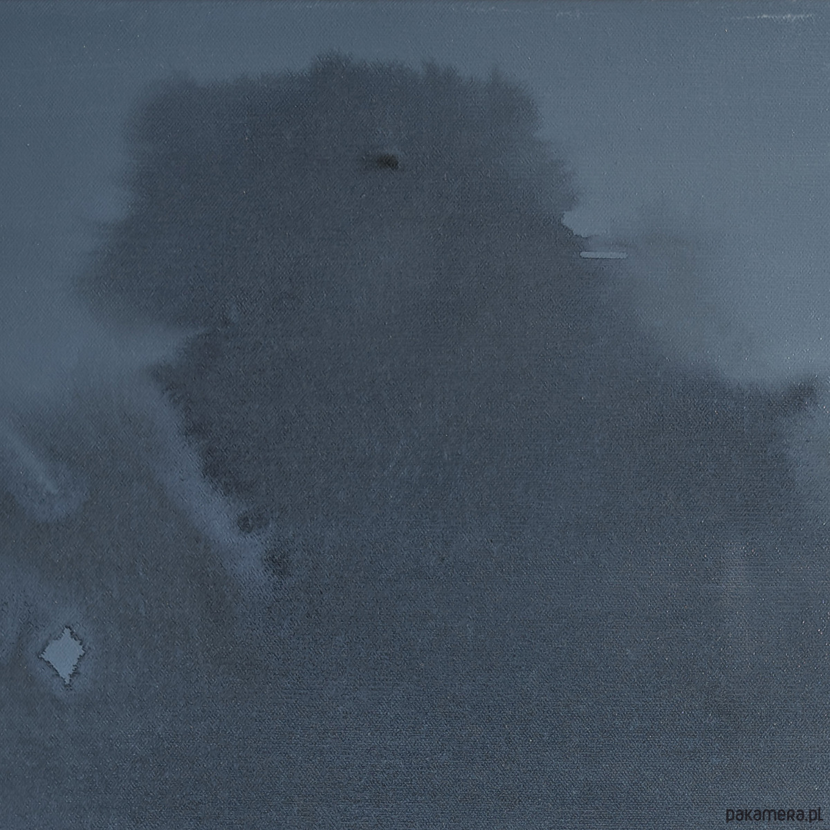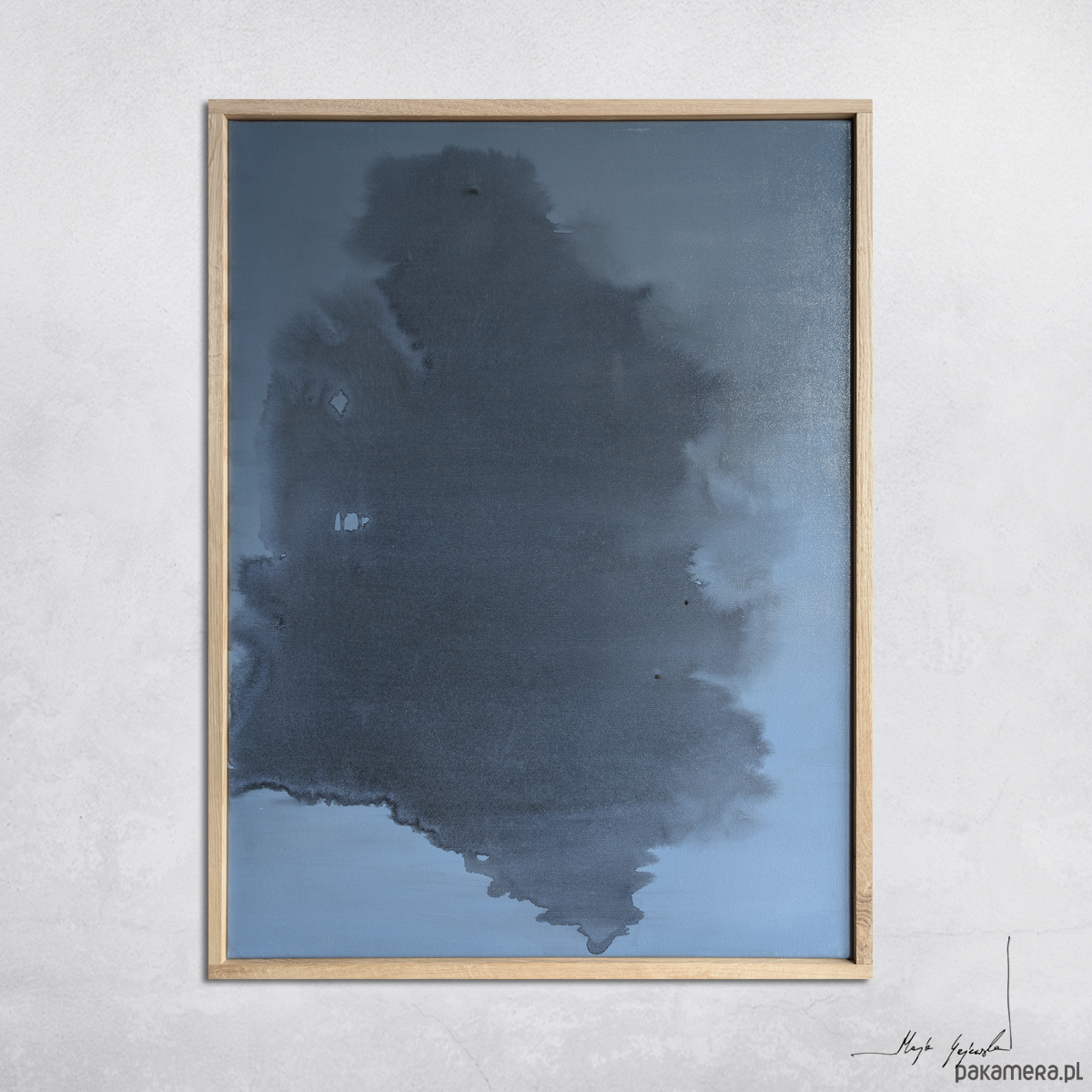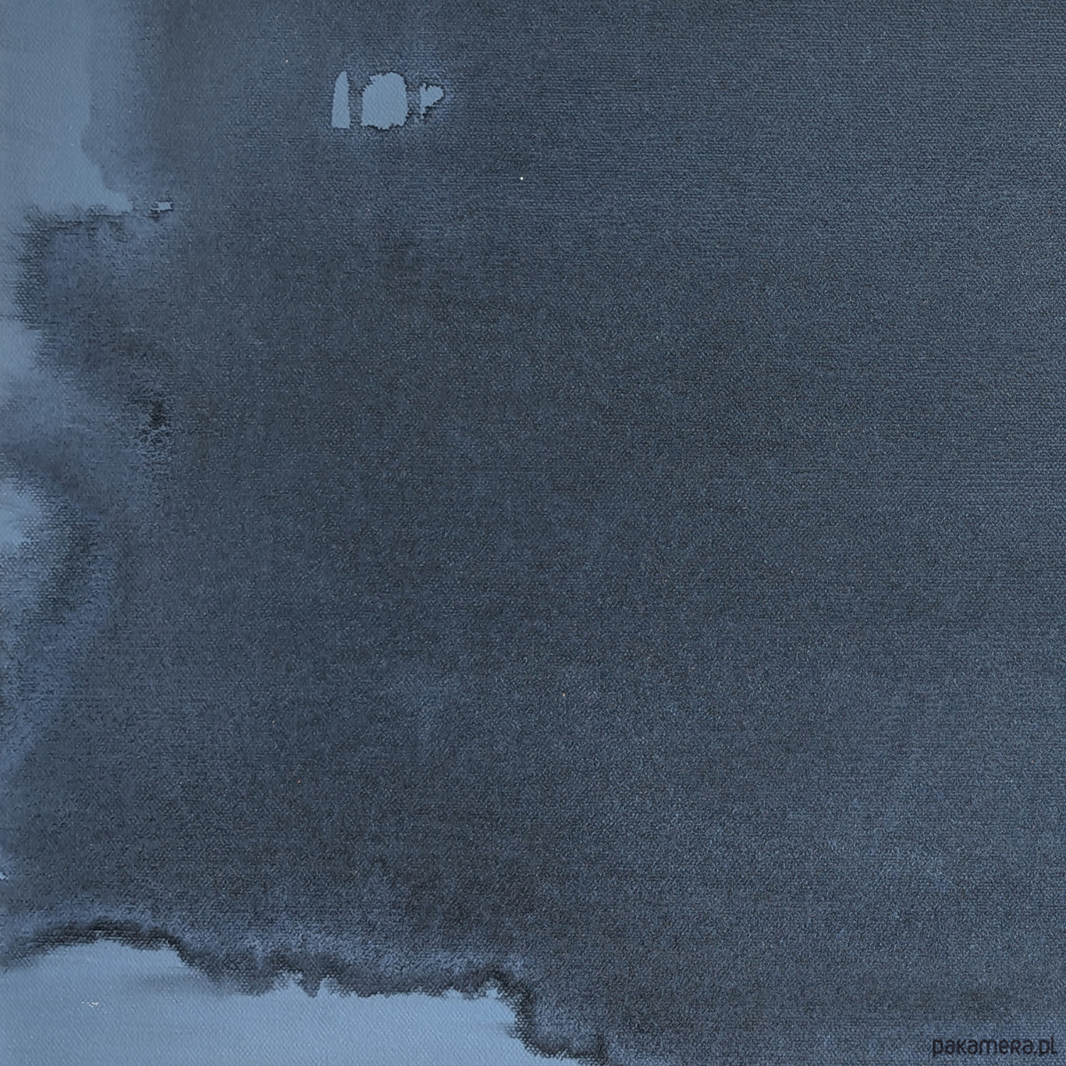 Obraz abstrakcyjny utrzymany w tonacji chłodnego, głębokiego błękitu z subtelnymi przejściami w ciemniejsze odcienie szarości i granatu. W centralnej płaszczyźnie obrazu rozpościera się nieregularna, organiczna forma o płynnych konturach i zróżnicowanym nasyceniu barwy. Zastosowanie transparentnych warstw akrylu tworzy efekt przestrzennej głębi i wrażenie cichego ruchu wewnątrz kompozycji.