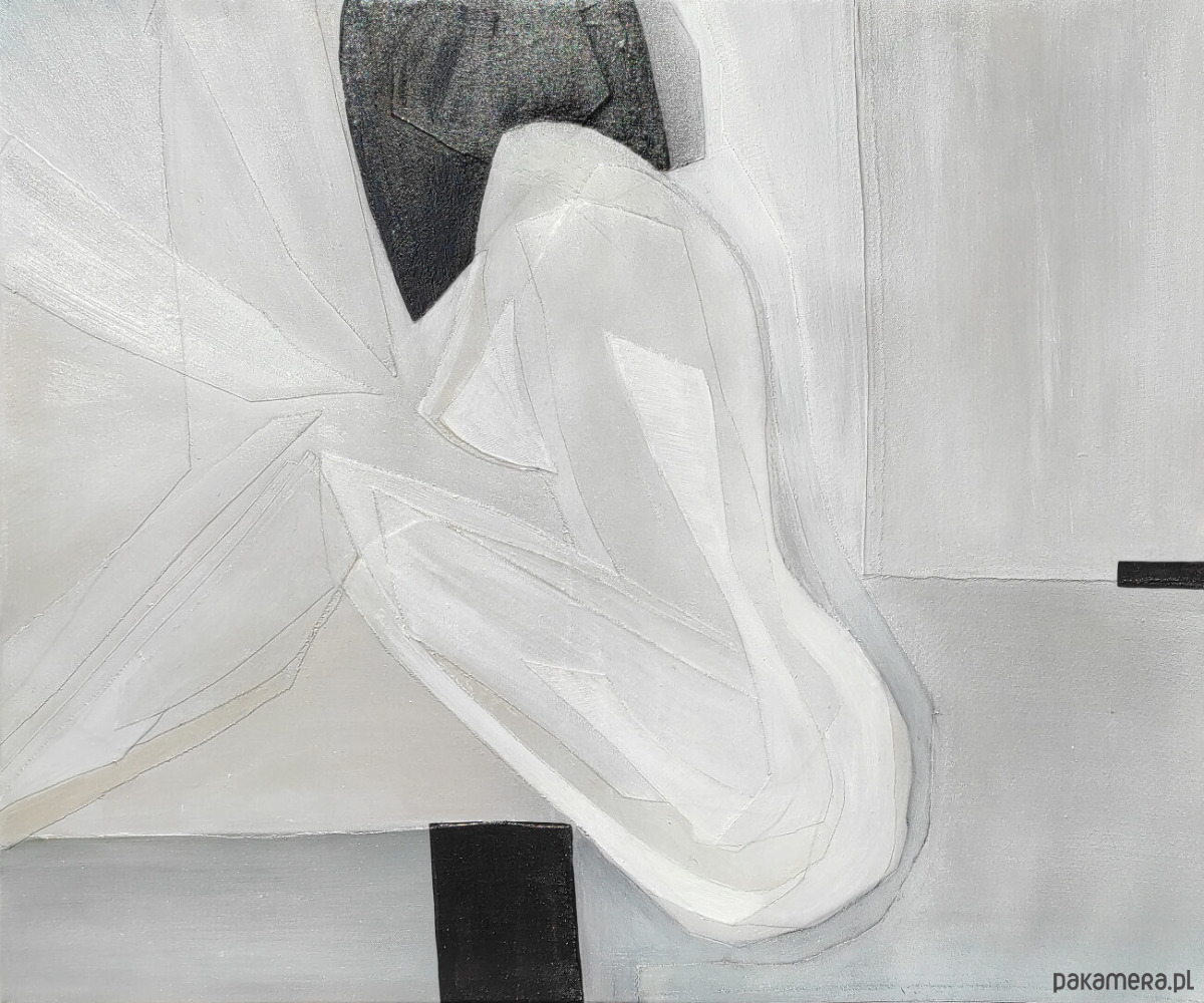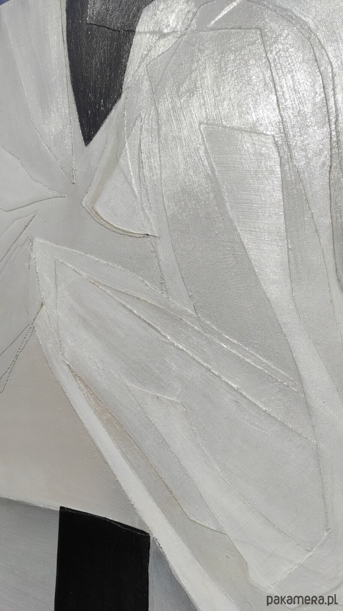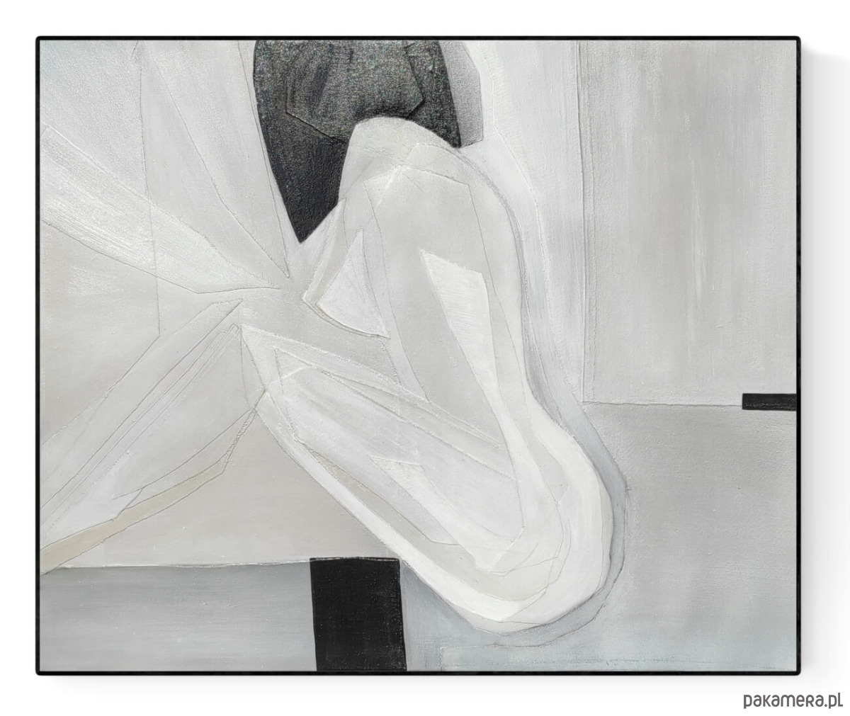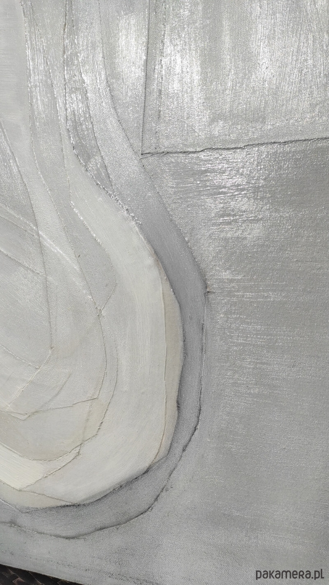 Obraz ręcznie malowany w technice mixmedia ze szczególnym zaakcentowaniem faktur. Odważne połączenia różnych materiałów ze zmysłowością kobiecych kształtów. Obraz symbolizuje równowagę pomiędzy siłą, a delikatnością kobiecej natury. Szara kolorystyka złamana ciepłymi odcieniami pasuje do większości wnętrz.
