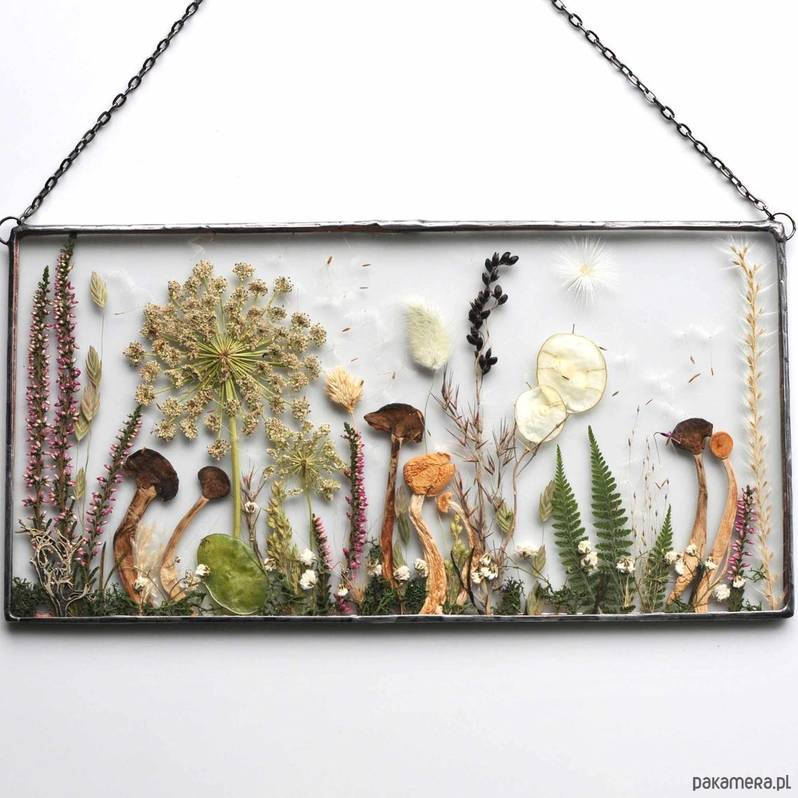 Szklany witraż z dekoracją z suszonych kwiatów i grzybków.