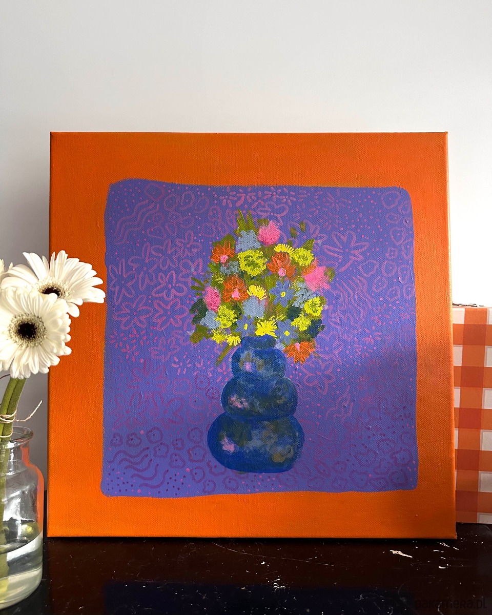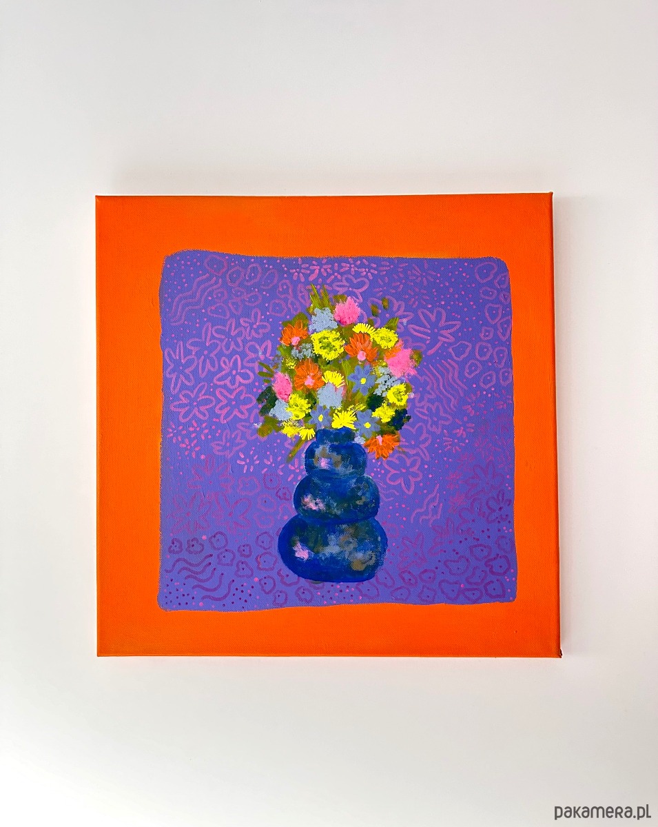 Autorski obraz malowany akrylami na podobraziu o wymiarach 39,5 cm x 39,5 cm (kwadrat).