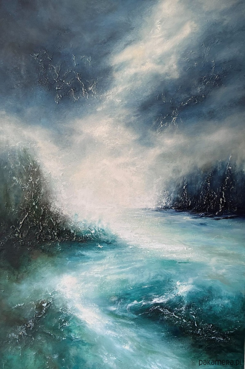 Nurt to kolejna praca z serii obrazów abstrakcyjnych inspirowanych potęgą żywiołów. Próba uchwycenia czegoś niematerialnego: ruchu, siły i momentu pomiędzy. Obraz nie jest dosłownym zapisem krajobrazu, lecz wrażeniem, jakie zostawia w nas spotkanie z nieokiełznaną wodą: poczuciem wolności, gęstością rozpylonej bryzy i szumem nurtu, który nigdy się nie zatrzymuje.
