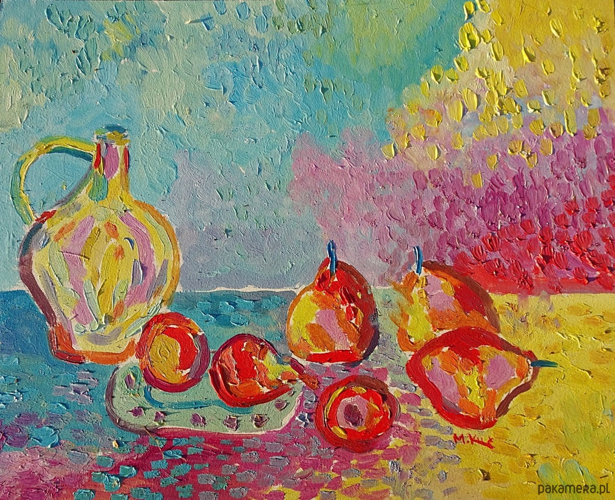 Obraz namalowany olejami na płycie o wymiarach: a4, 21/29,7 cm, sygnowany z przodu. Jest to moja autorska kompozycja. Świetnie może być eksponowany w nowoczesnych wnętrzach o stonowanej kolorystyce. Swoimi barwami może rozjaśnić takie wnętrza, w oświetleniu dziennym, jak i sztucznym.