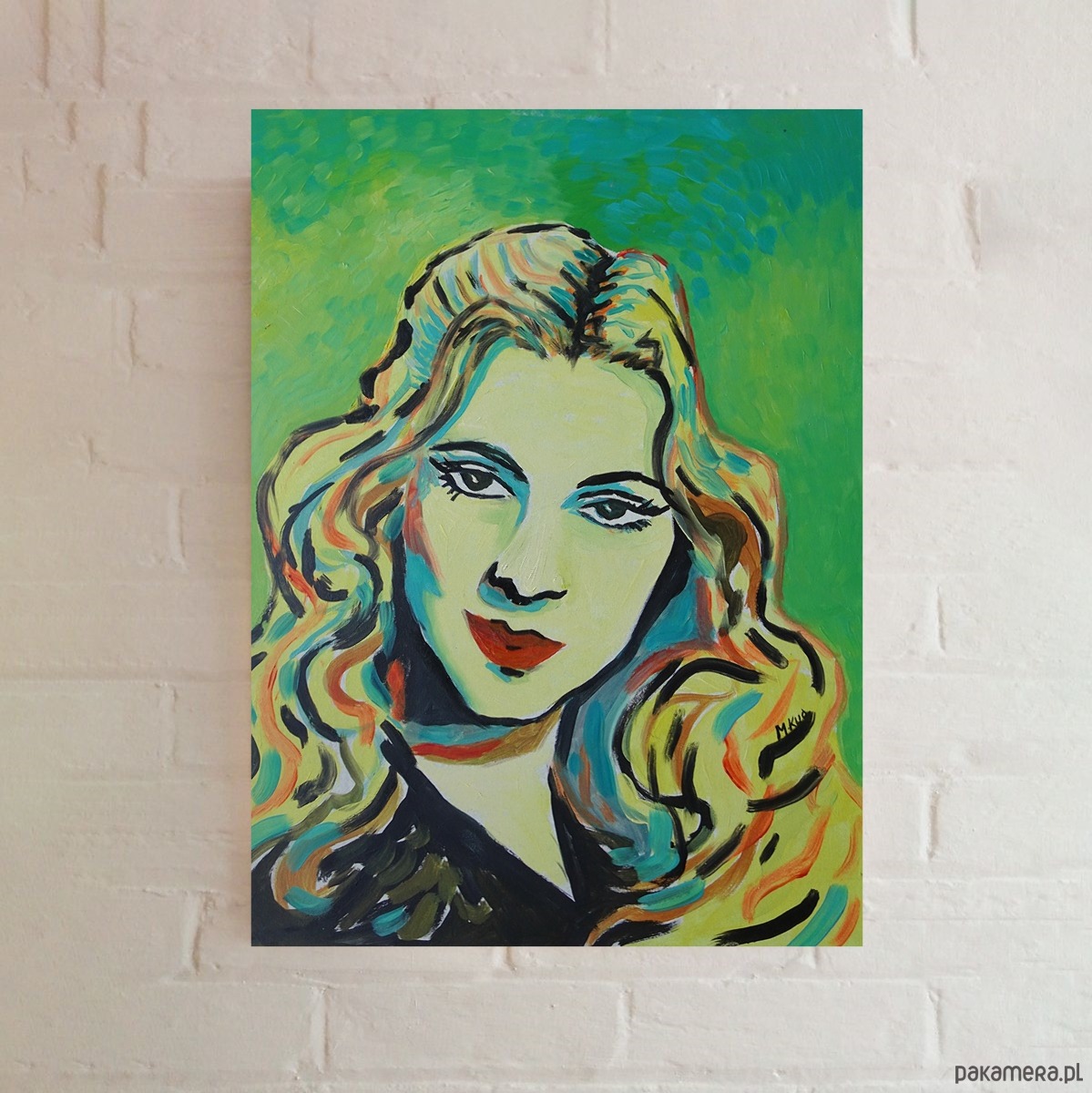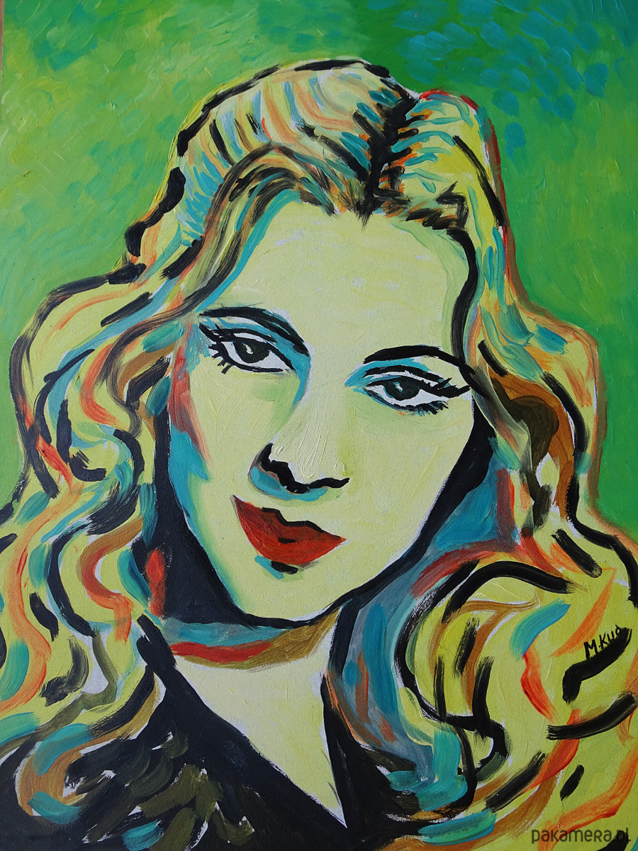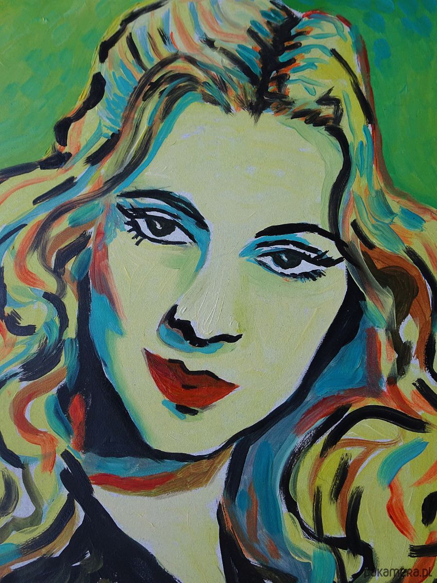 Obraz emanuje żywymi kolorami i dynamicznymi kształtami, które przyciągają wzrok. Tło ma intensywnie zielony kolor, przypominający wiosenne łąki, co tworzy kontrast dla twarzy kobiety namalowanej w centrum. Jasne tony jej cery łączą się z odcieniami błękitu i pomarańczy, dodając twarzy pewnego rodzaju tajemniczości. Czarna linia obrysowuje wyraziste oczy i pełne usta, tworząc dramatyzm i głębię. Kompozycja jest prosta, ale pełna energii, jakby artystę inspirowała radość i lekkość chwili. Styl obrazu przypomina techniki postimpresjonizmu, gdzie emocje są ważniejsze niż rzeczywistość. Oglądając go, można poczuć ciepło i nostalgiczny spokój, jakby wpatrywało się w słoneczny dzień. A może to tylko ja i moja wyobraźnia. Technika użyta tutaj wydaje sie być mieszanką agresywnych pociągnięć pędzla, co dodaje dynamiki. "Patrz! Ma kolory tęczy na włosach!" Obraz wywołuje uśmiech i zachwyt, jednocześnie skłaniając do zatrzymania się na chwilę i podziwiania tej kolorowej symfonii barw i emocji. Artystyczny wyraz - stunning! - sprawia, że na długo pozostaje w pamięci.